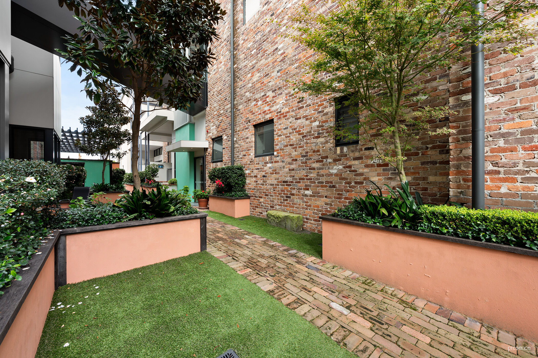 Step through the gates and discover a hidden world. Tucked between two historic buildings – the former Mechanics Institute and the Hamilton RSL – a lush indoor courtyard unfolds, featuring a winding brick path that guides you through fragrant gardens planted with magnolia, camellia, and hibiscus. The original brick walls, still bearing the faded advertising of yesteryear, whispers stories of the past and forms a striking, evocative backdrop – offering residents a rare and meaningful sense of place.