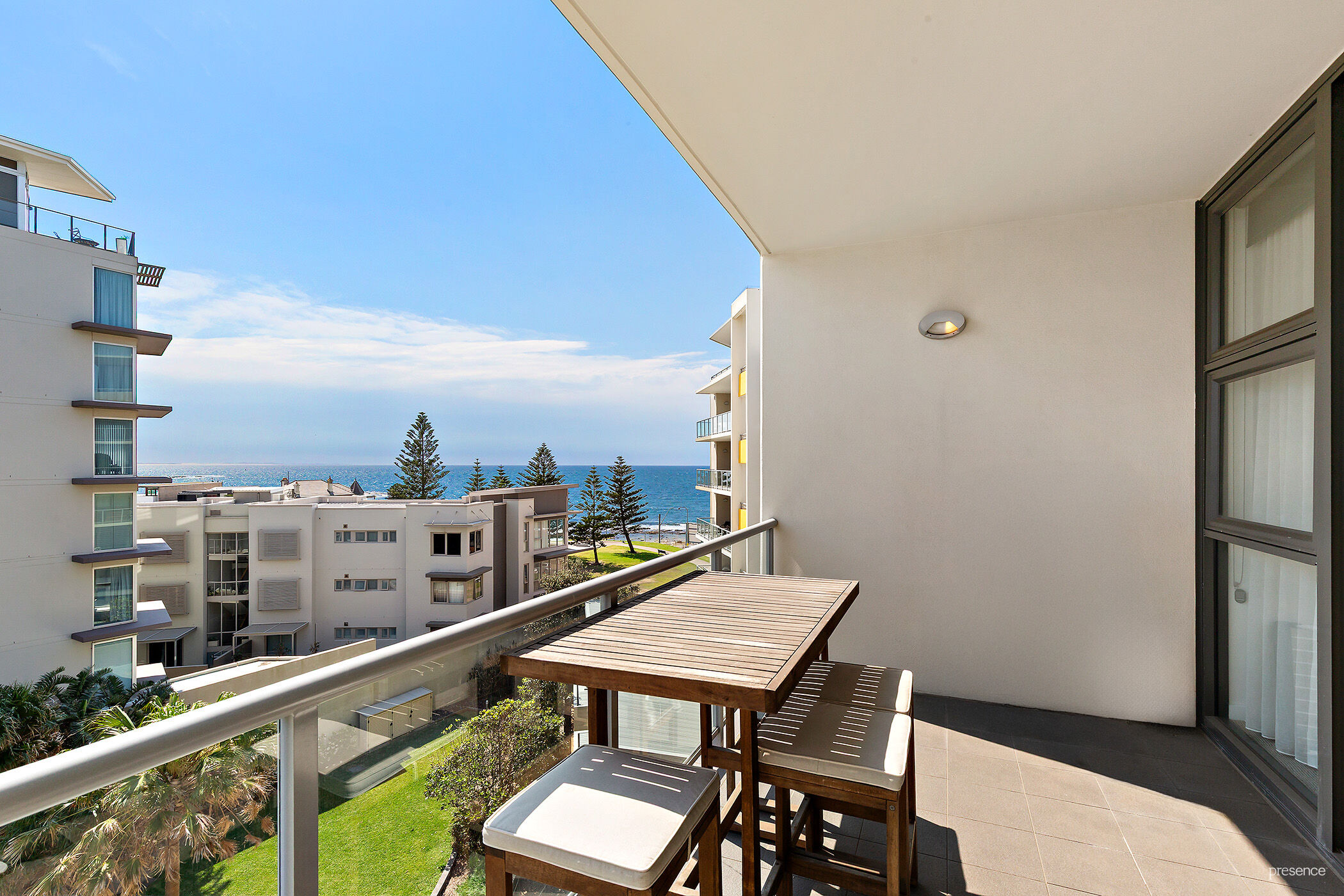 Ascend the stairs to discover two generously sized bedrooms, each opening onto a balcony that spans the width of the apartment and mirroring the stunning views over the beach and the city’s working harbour. The master bedroom features a built-in robe and ensuite, while the second bedroom has convenient access to the bright main bathroom, complete with a walk-in shower and bath. A separate laundry adds convenience, while ducted air conditioning and natural cross-ventilation from ocean breezes ensure seasonal comfort.