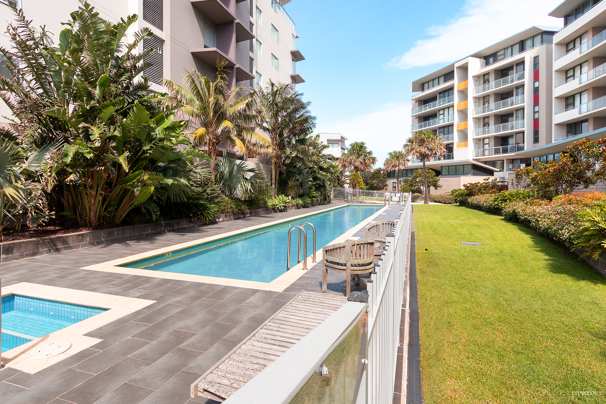 • Resort-style facilities in the complex, including a palm-studded BBQ area, a lap pool and spa.