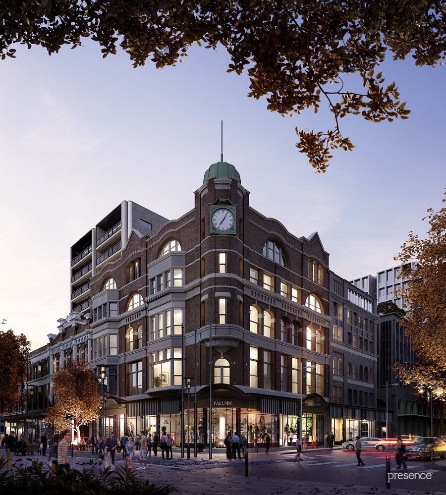 The cool, green colour of the podium fits comfortably within the warm, textured finish of the surrounding masonry heritage façades, effectively linking the two culturally significant premises on the corners of the site.