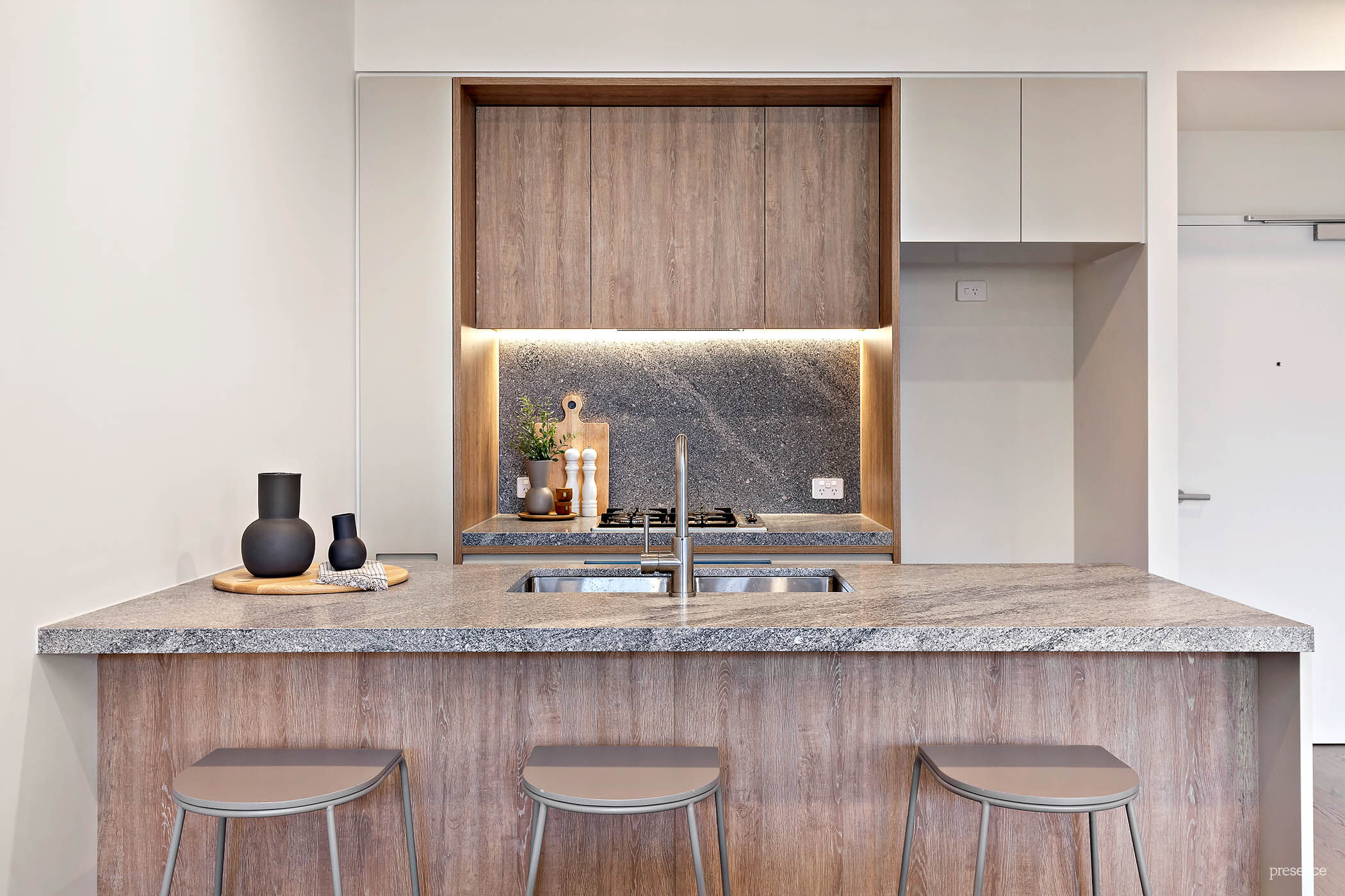 Spacious open plan living showcases a rich blend of warm and cool textures highlighting the luxury finishes and high-end inclusions. A gourmet kitchen features Smeg appliances, pull-out pantry, and an eye-catching Caesarstone bench and breakfast bar. With the bedrooms and living area linked by large glass doors opening to the balcony, a sense of connectedness prevails while the thoughtful floorplan creates privacy for residents when needed. A concealed study nook and two elegant bathrooms complete this apartment which will immediately feel like a home.