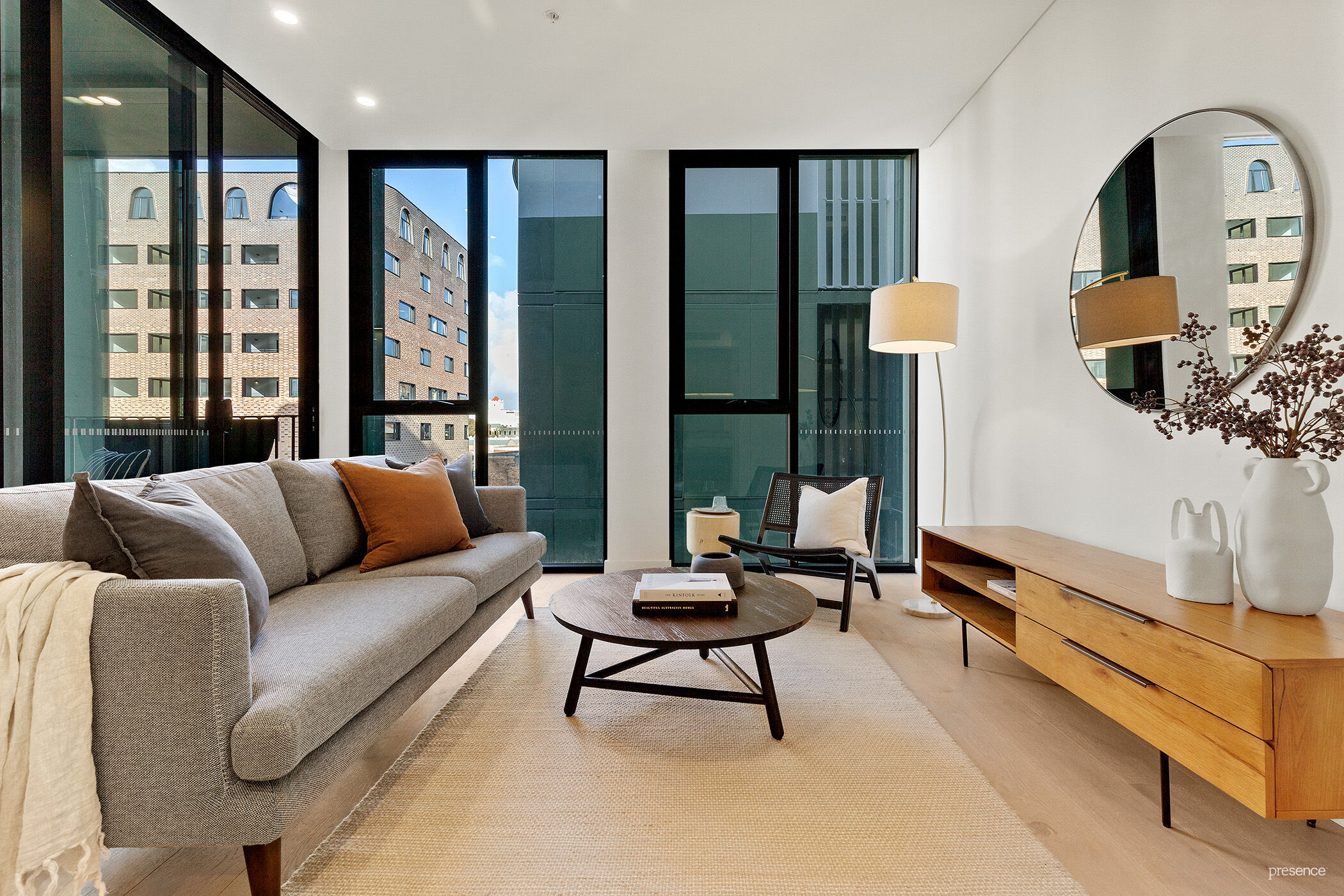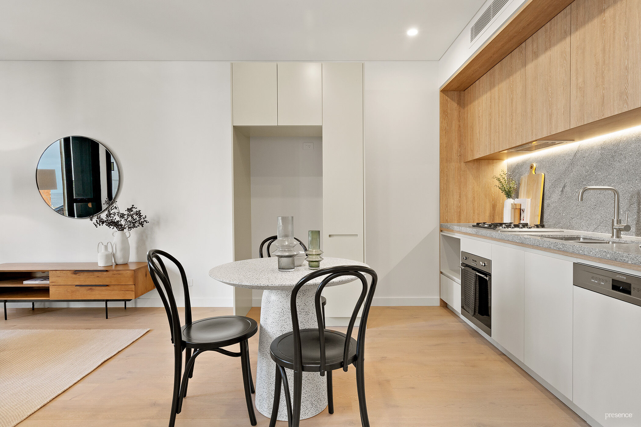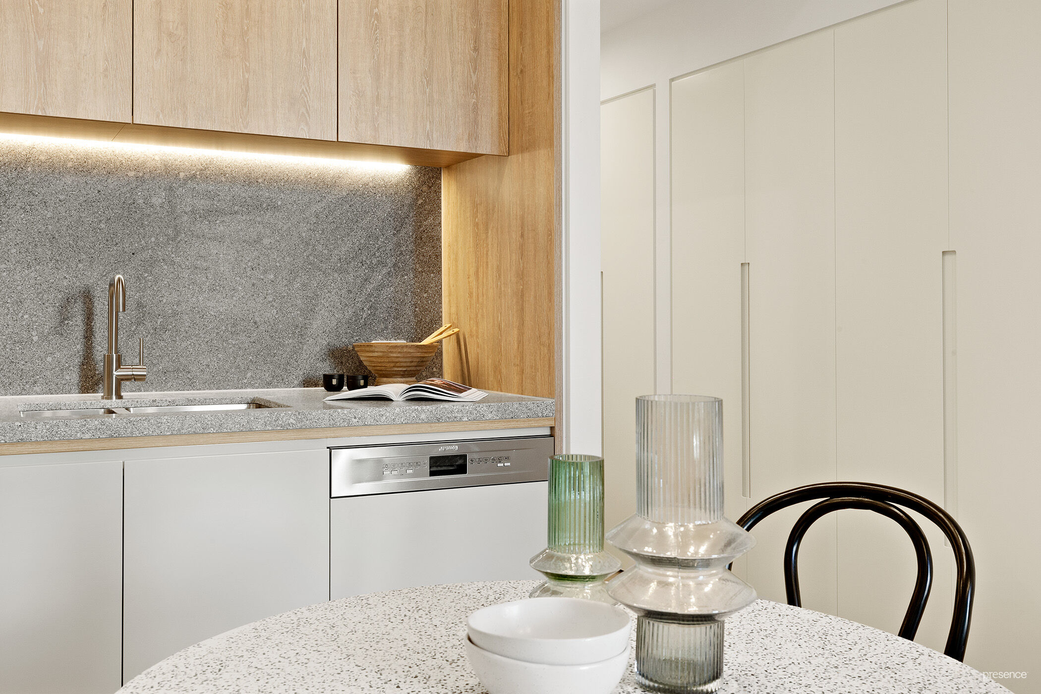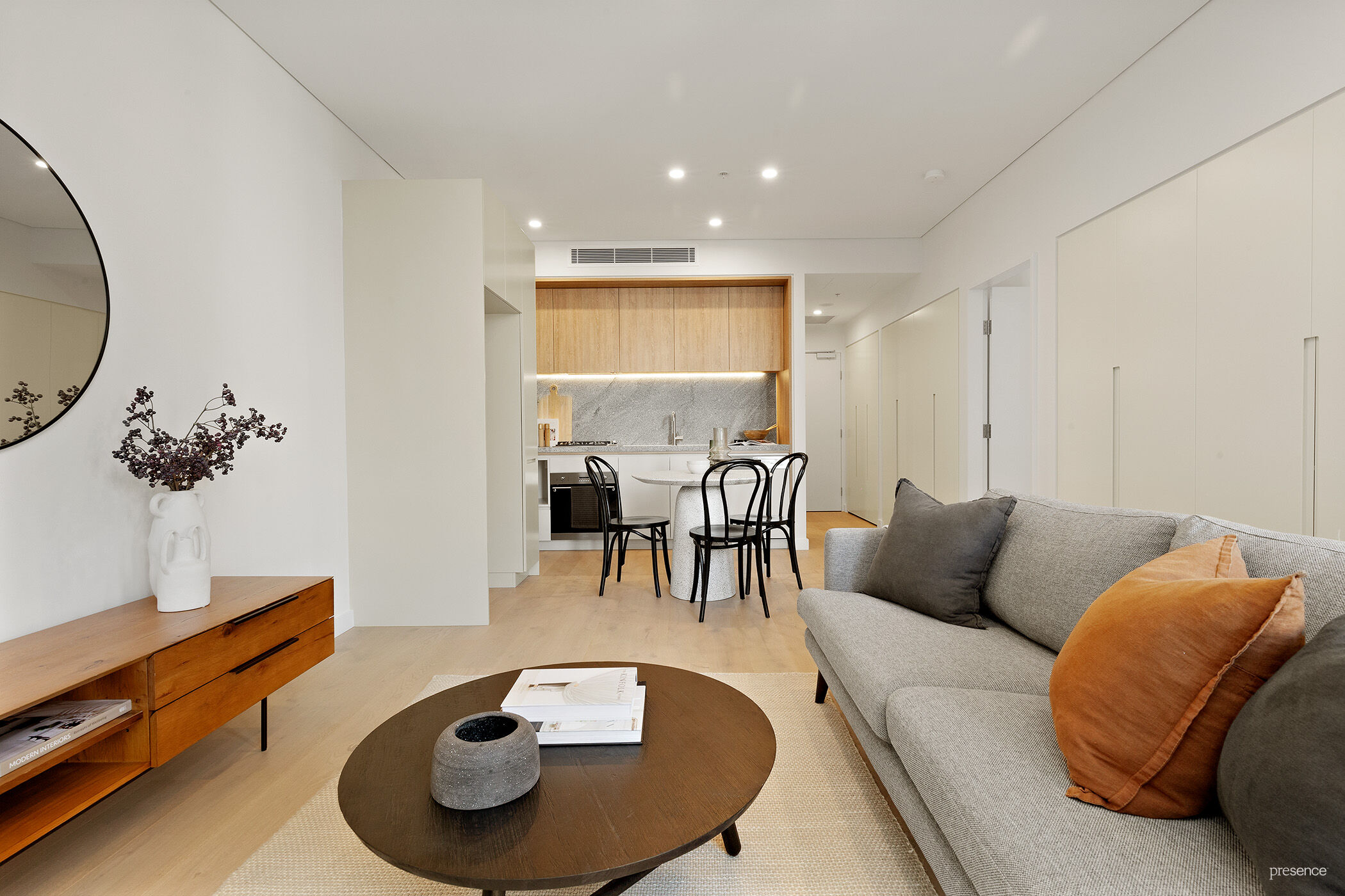 Designed by award-winning architects SJB, the apartment features luxury finishes and high-end inclusions. Spacious open plan living hosts a stunning kitchen with a space saving pull-out pantry and eye-catching Caesarstone benchtop. A main size bathroom and separate laundry are neatly concealed while glass sliding doors in the bedroom and living area open up access to the balcony.