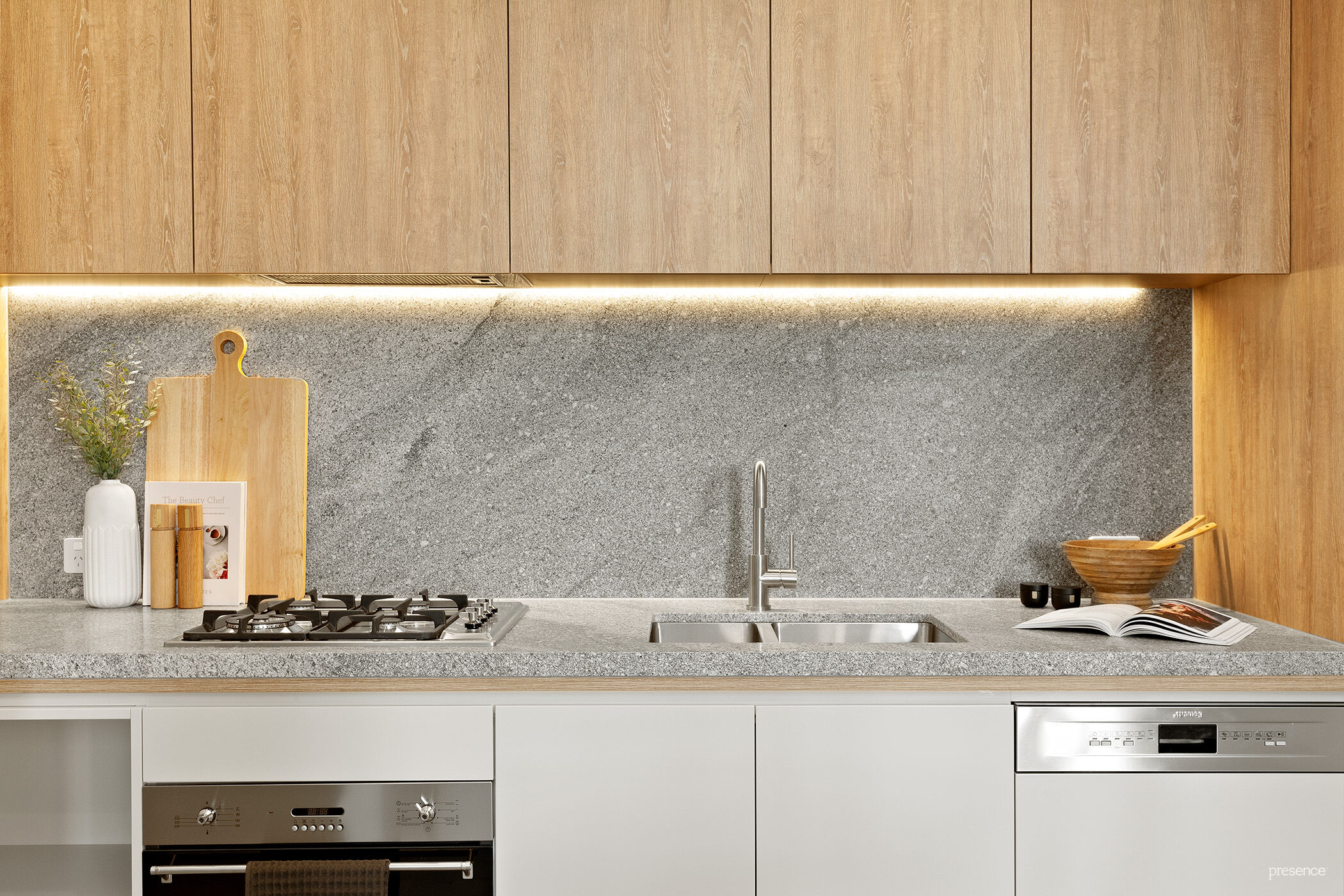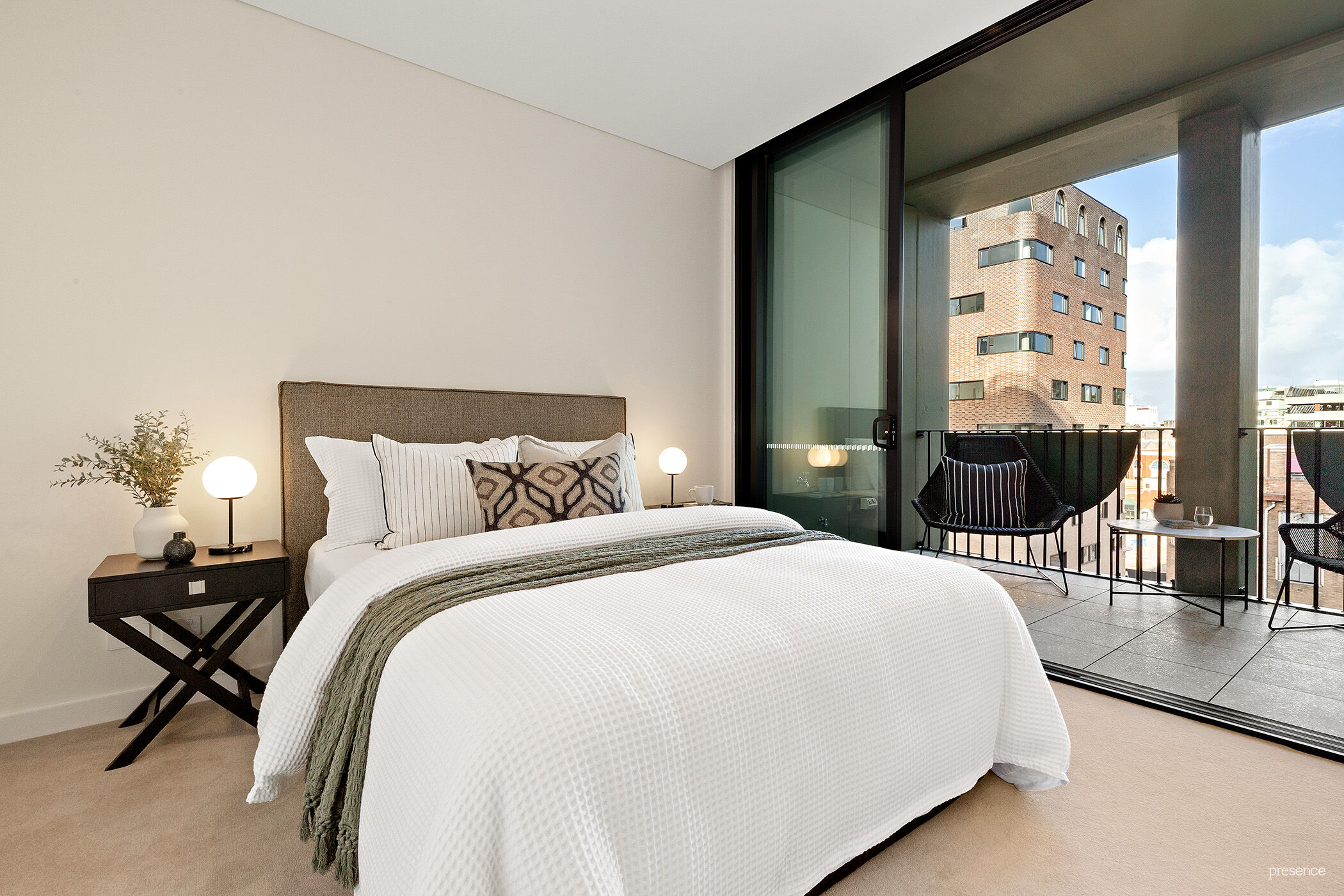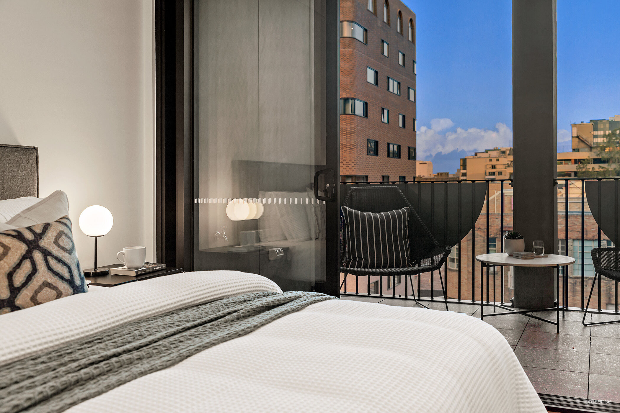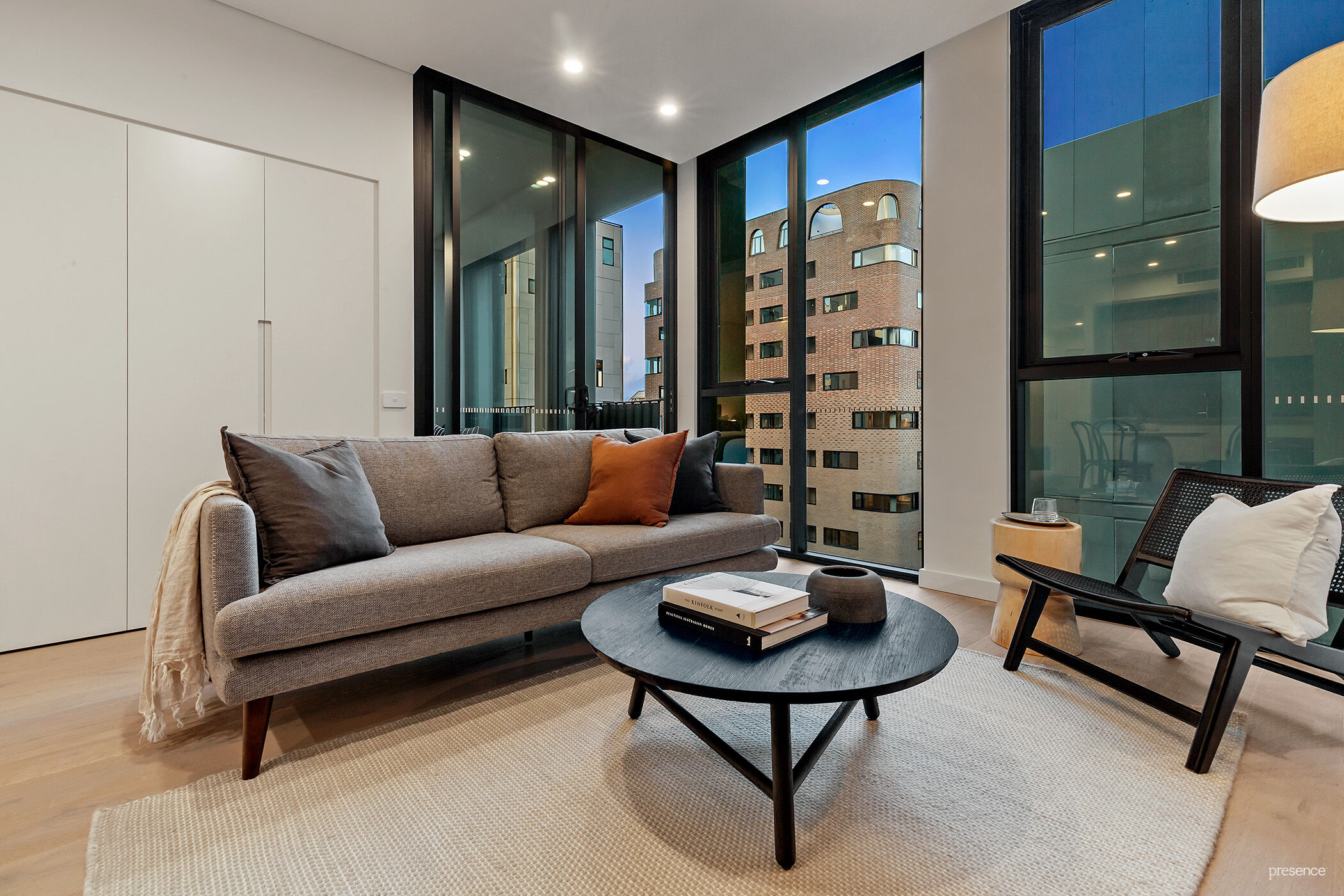 Designed by award-winning architects SJB, the apartment features luxury finishes and high-end inclusions. Spacious open plan living hosts a stunning kitchen with a space saving pull-out pantry and eye-catching Caesarstone benchtop. A main size bathroom and separate laundry are neatly concealed while glass sliding doors in the bedroom and living area open up access to the balcony.