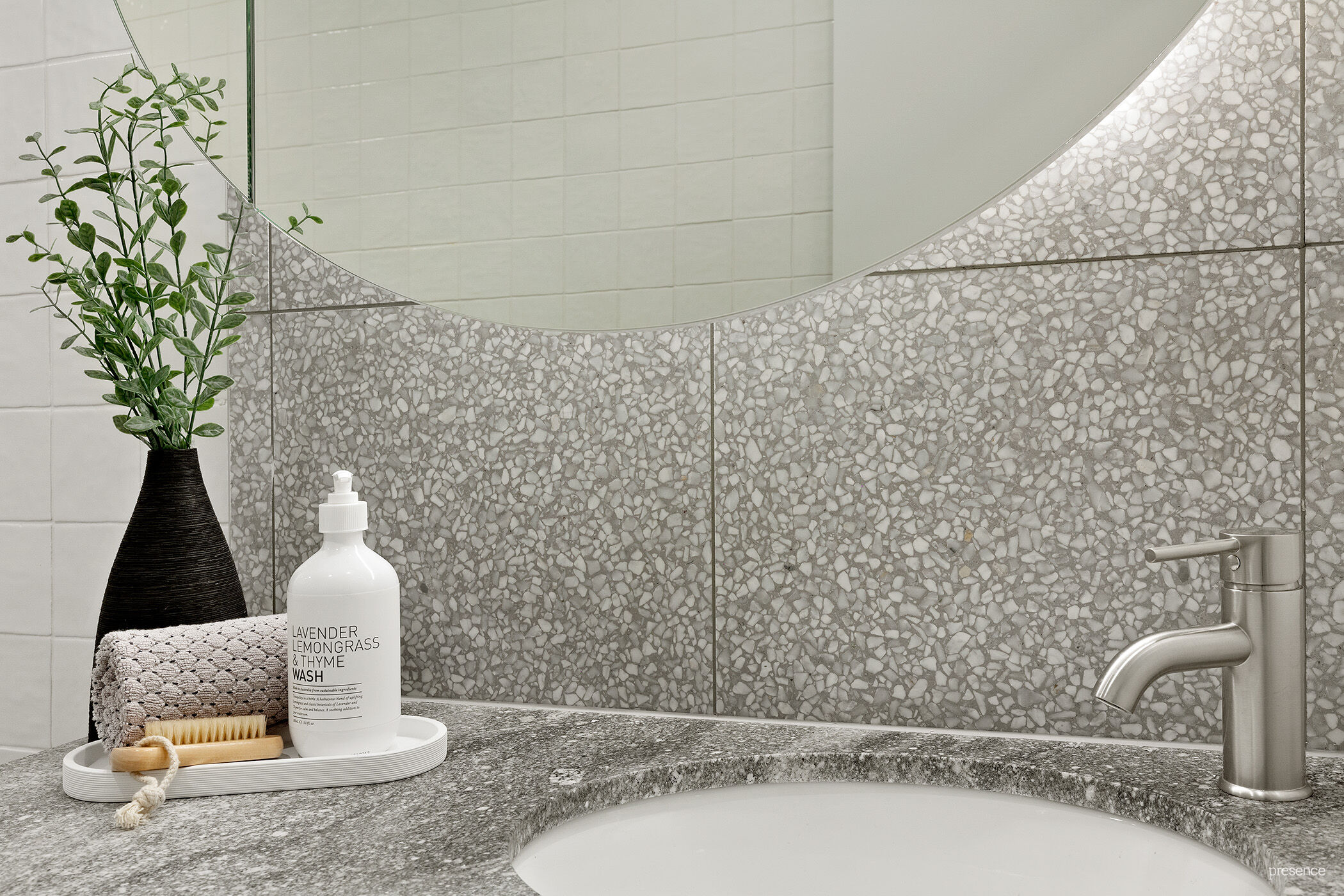 – Bathroom is fully tiled with walk-in shower including dual shower head with rain shower, features Caesarstone benchtop and terrazzo tiles