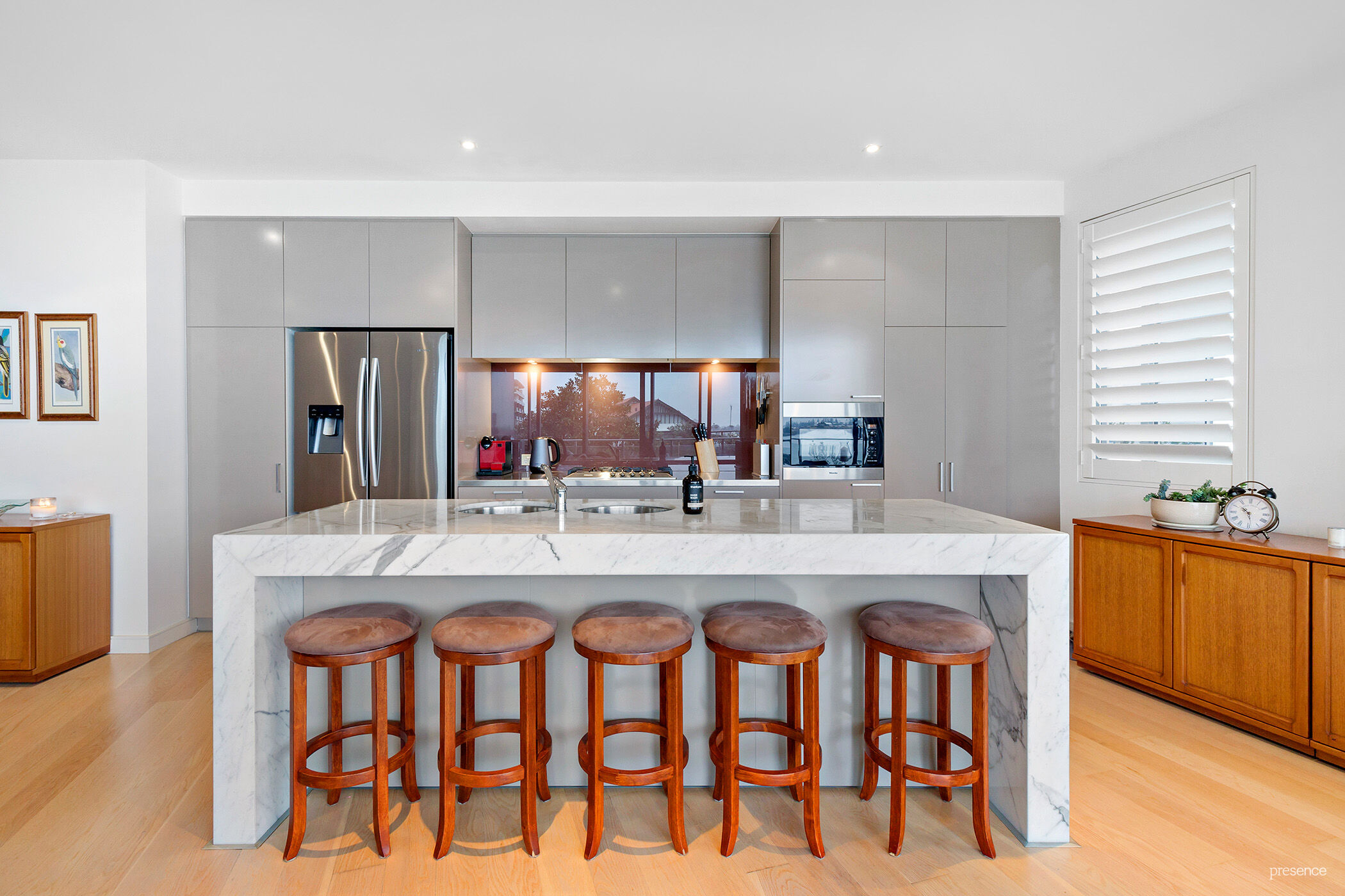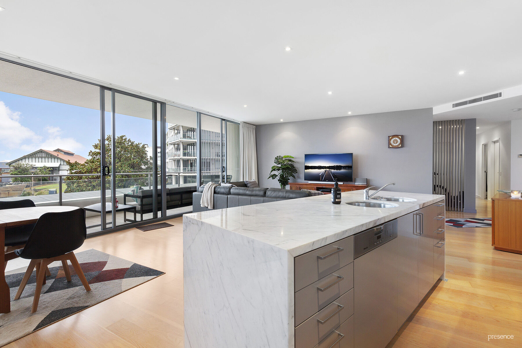 The epitome of light-filled and easycare living and featuring floor-to-ceiling windows and gorgeous marble surfaces, this first-floor retreat is something special. The open plan layout is designed for effortless entertaining with a wrap-around covered terrace that’s a perfect spot to relax or dine alfresco while giving you and your guests a bird’s eye view of all the action on the water and precinct below. The elegant and quality kitchen has Miele appliances and a marble island for meals on the go. Ducted air-conditioning keeps things comfortable throughout the seasons and when it comes to rest and rejuvenation, the master ensuite features a luxe bath as well as a shower. Two secure parking spaces ties the bow.
