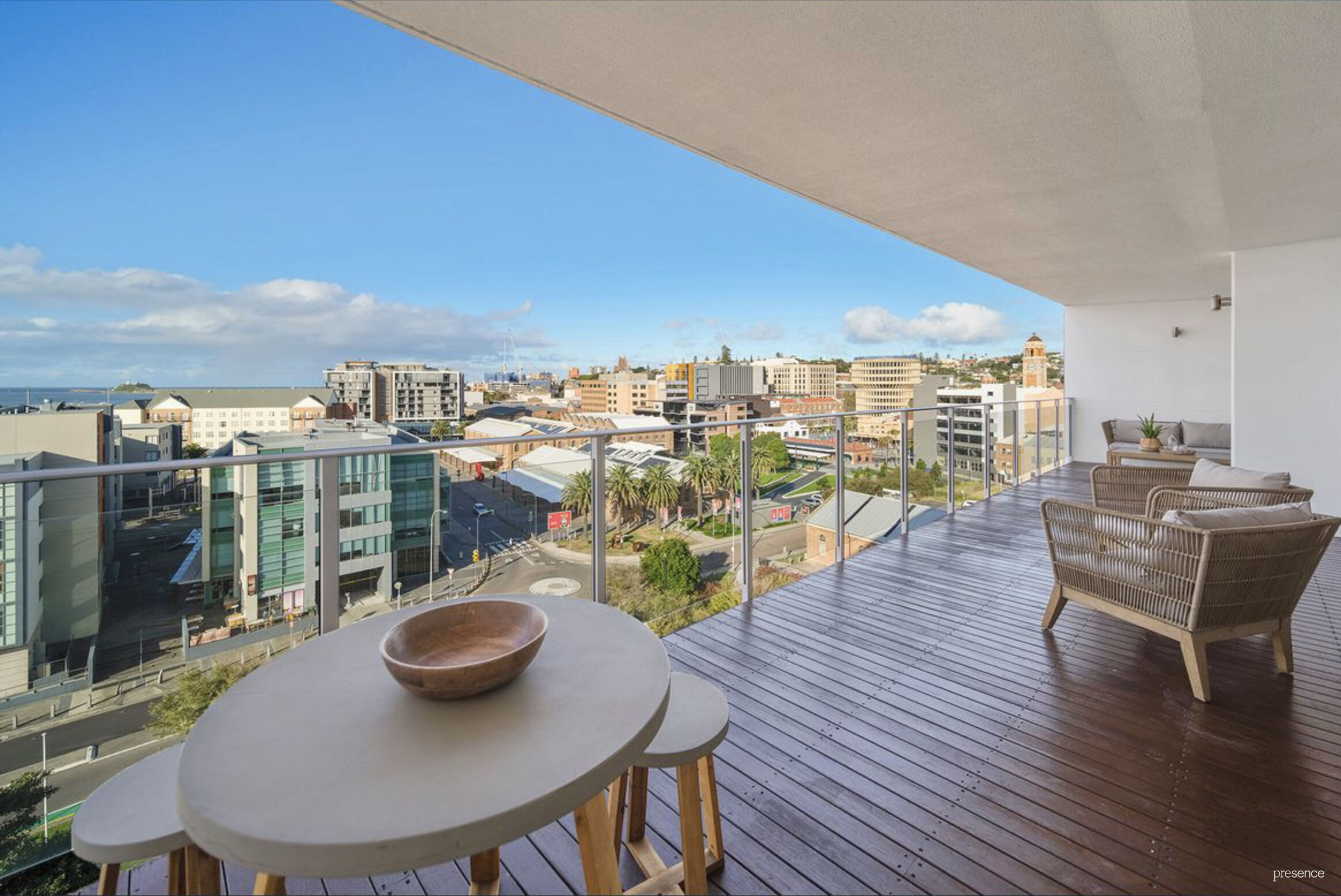 Then of course, there is that view. Flooded with natural light, the apartment utilises its desirable easterly aspect to full effect, using a wall of windows to showcase magnificent views over the shimmering harbour and out to Stockton. Working to create a sense of indoor-outdoor living that is entirely effortless, its spacious open-plan living area offers access to an expansive timber deck. It is here you will sip your morning espresso as you watch the world go by. It is here you will entertain friends on balmy summer evenings, taking in the city lights as they sparkle over the harbour.