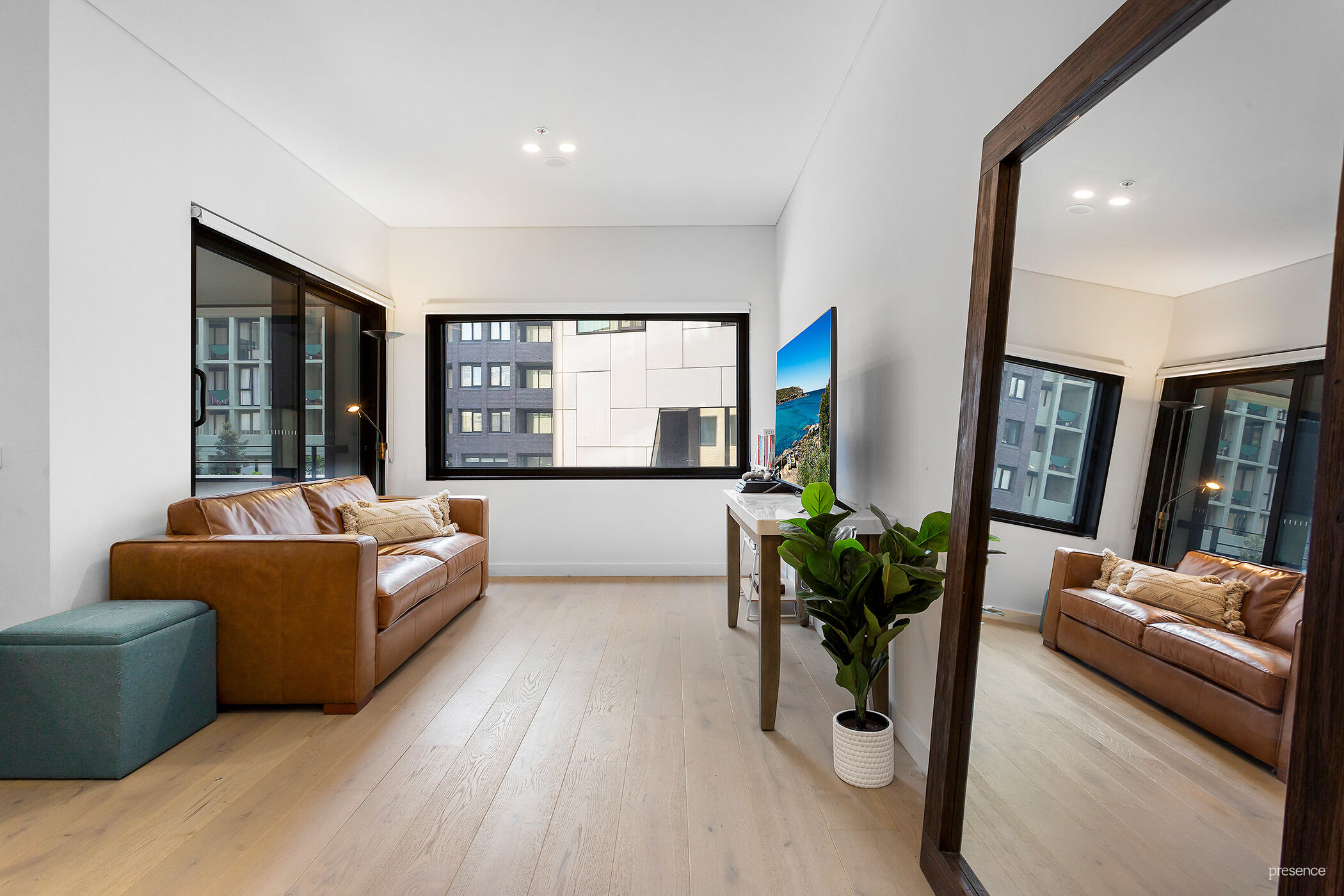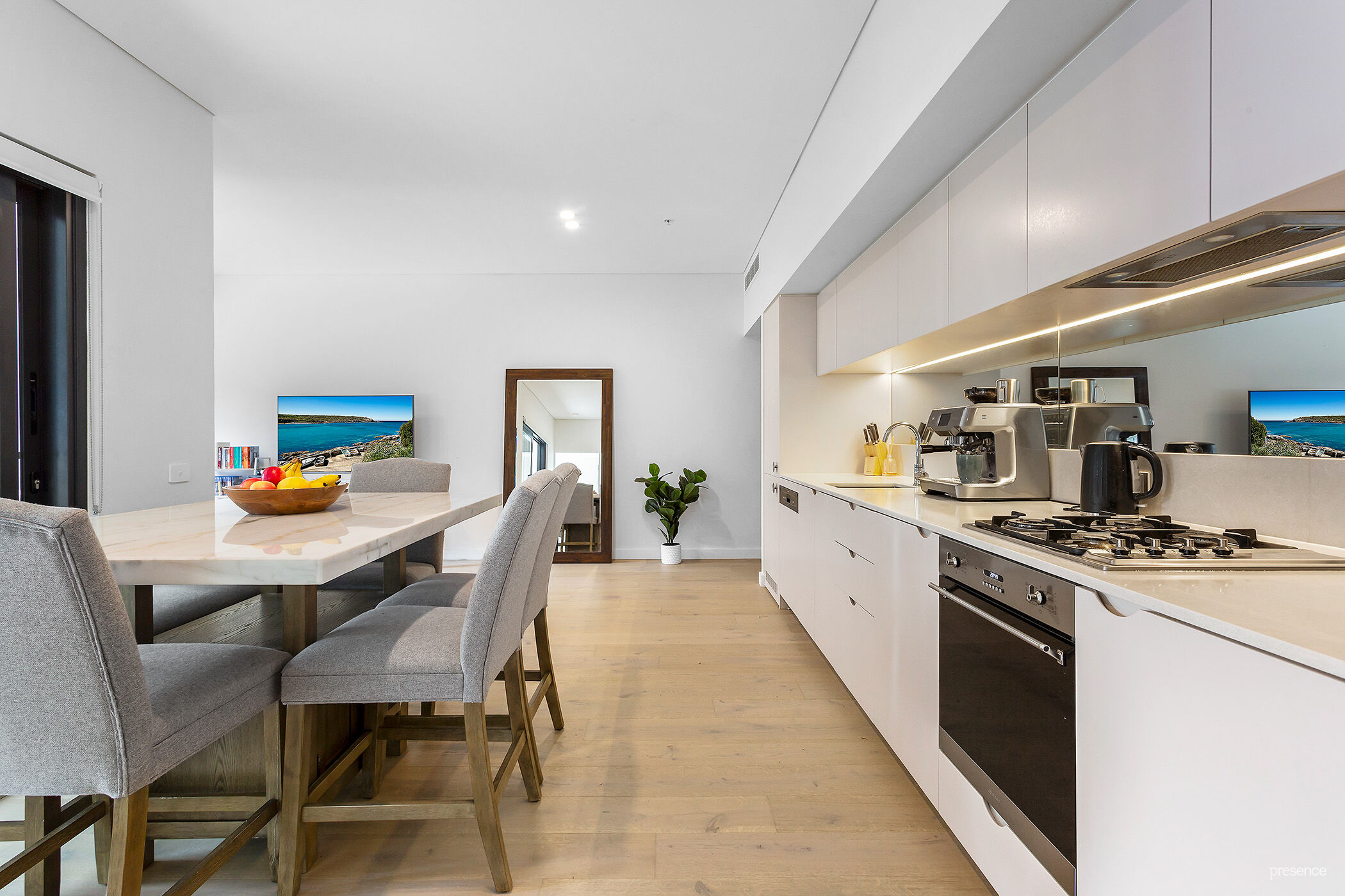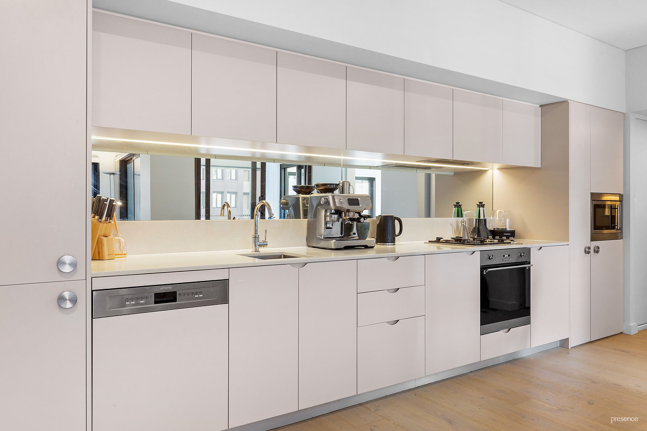 Bleached blonde timber floors, elegant curved picture windows and modern neutral colours combine to create a coastal city aesthetic. Views to the boutiques and cafes of Lyrquie Lane, tropical gardens and other elegant buildings flaunt this apartment’s inner urban position and emphasises the village vibe. The uber-modern kitchen features Smeg appliances, sleek cabinetry with an integrated fridge, microwave and dishwasher and stone topped counters. This designer kitchen opens onto the open-plan and light-filled dining and living space, and this area in turn flows to the balcony. A chic bathroom boasts an over-sized shower, backlit vanity, and the master bedroom, with built-in closet and picture window, is the perfect spot for a lazy Sunday lie-in as you watch the world go by.