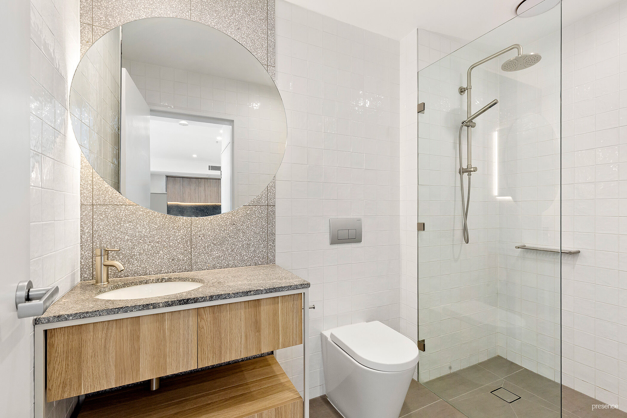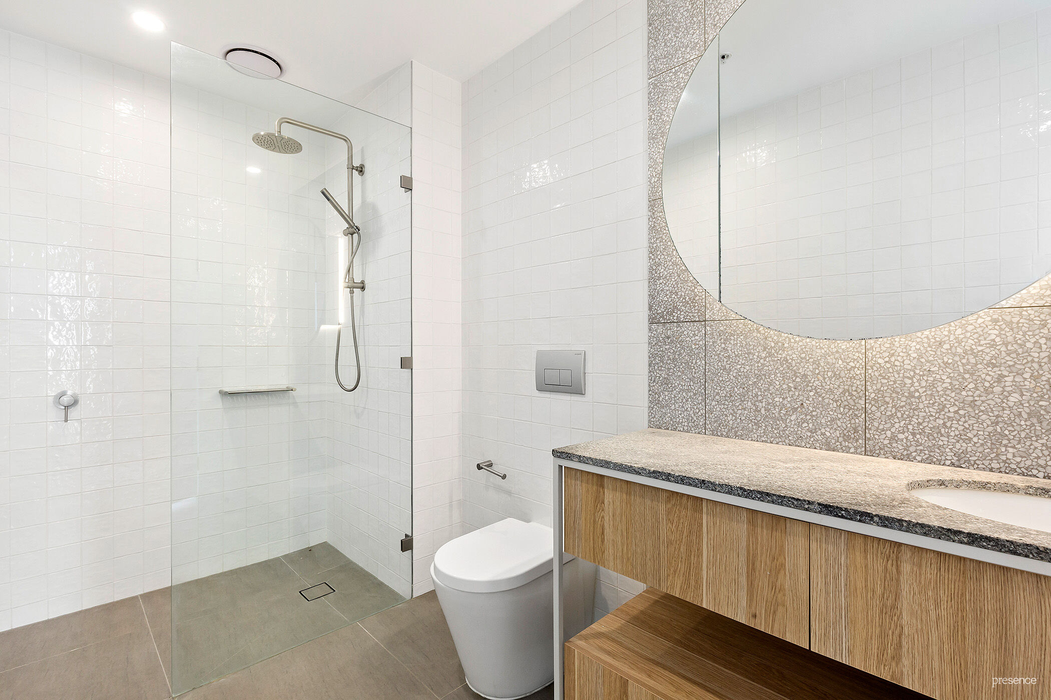 – Fully tiled bathroom with walk-in shower, stone-topped vanity, streamlined concealed cistern, and LED mirror.