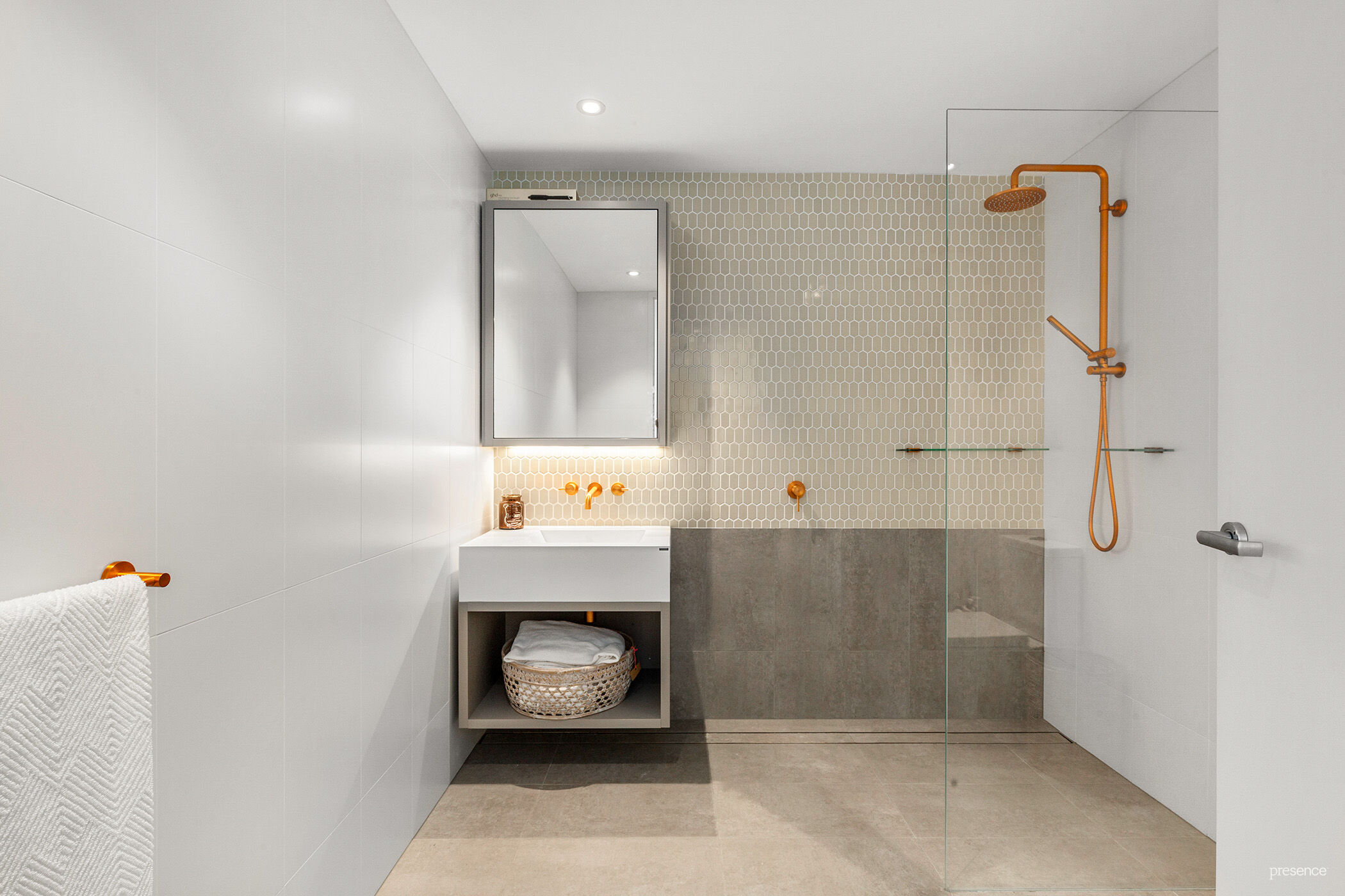 – Elegant bathroom with luxurious feature tiles, brushed brass fixtures, sleek walk-in shower, and vanity with mirror storage for a touch of spa-like indulgence.