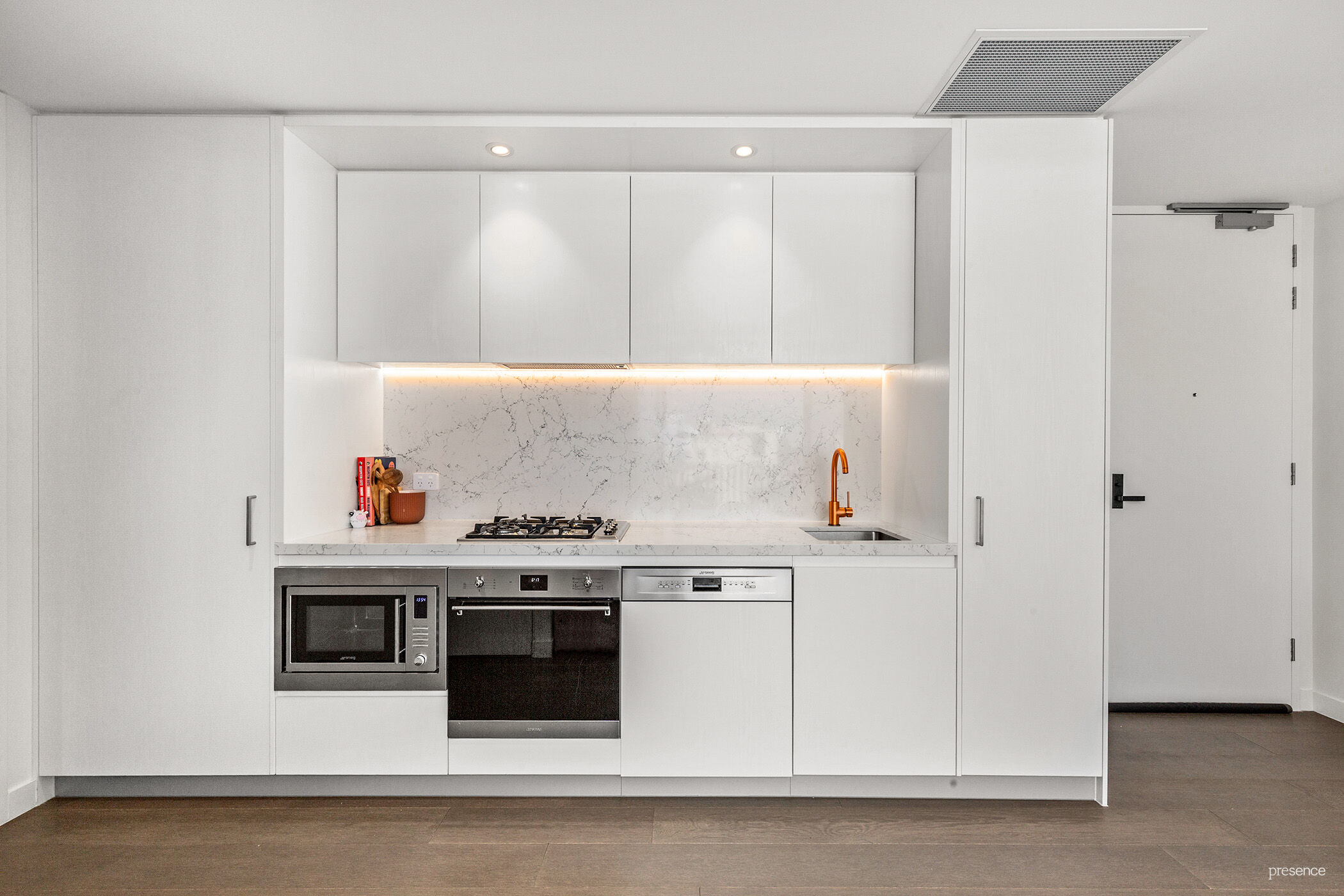 Whip up gourmet meals in your stunning SMEG kitchen, complete with dual ovens, gas hob, integrated dishwasher, LED ambient lighting, plus pantry and ample storage. Need to work or study from home? The cleverly designed hideaway study nook has you covered.