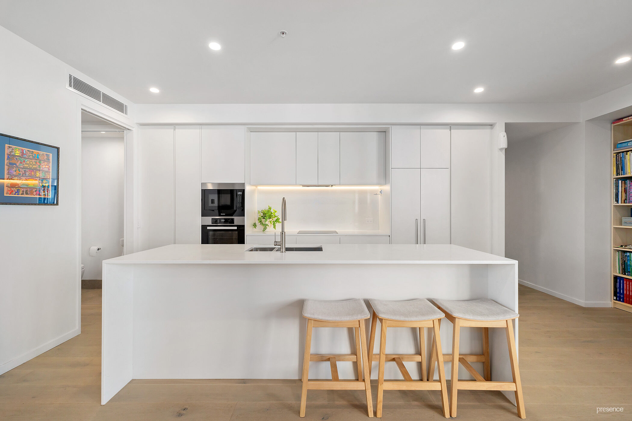The expansive main living area is impressively large, boasting breathtaking everchanging views of the sparkling blue harbour stretching out towards Stockton Beach from its prized north-east aspect. This stunning room opens onto a wrap-around balcony, the perfect spot to unwind and savour the cooling harbour breezes. Additionally, a second balcony on the city side allows you to effortlessly seek sun or shade depending on your mood and the season. At the heart of the generous living and dining zone lies a full-sized designer island kitchen, a chef’s dream, finished with glossy stone benchtops featuring a waterfall edge, and equipped with premium Miele appliances including a dishwasher, dual ovens, and cooktop. An integrated fridge completes the sleek and sophisticated look.