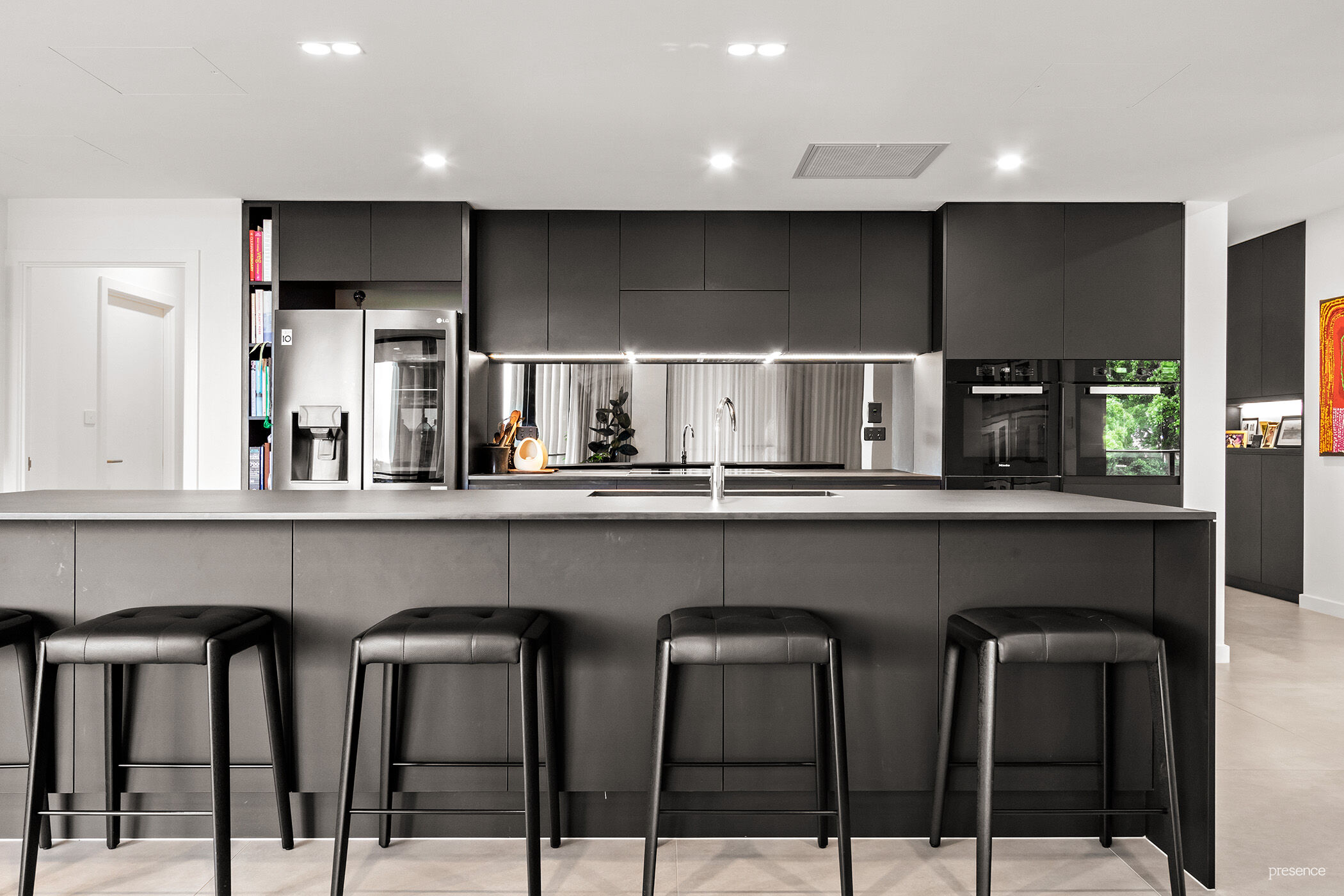 – Island kitchen with Dekton benchtops, 90cm induction cooktop, two ovens, two integrated dishwashers and clever storage