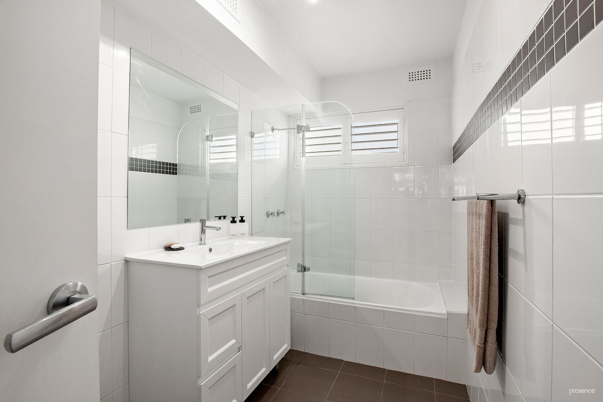 • Bright and modern tiled bathroom featuring a shower over a full-sized bath and a generous vanity.