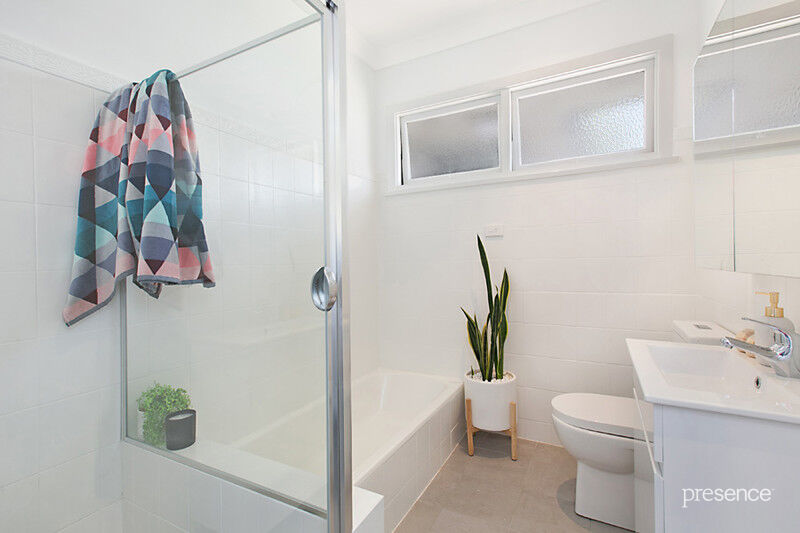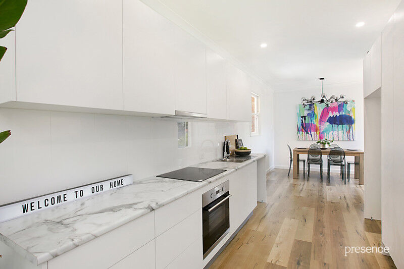 Opening up with free-flowing lounge and dining spaces, the streamlined new kitchen sits at the heart of the home. Showcasing glossy white cabinetry and an induction cooktop, the kitchen’s modern makeover blends beautifully with the new floating timber-look floor and neutral colour palette. The master bedroom flaunts a built-in robe as well as a fresh ensuite with modern touches, while the remaining two bedrooms share a family bathroom with bathtub and shower. A hugely versatile lower level retreat is an ideal breakout space for teenagers, while the fully fenced gardens with deck and enough room for a pool down the track will become a playground for adults and children alike.