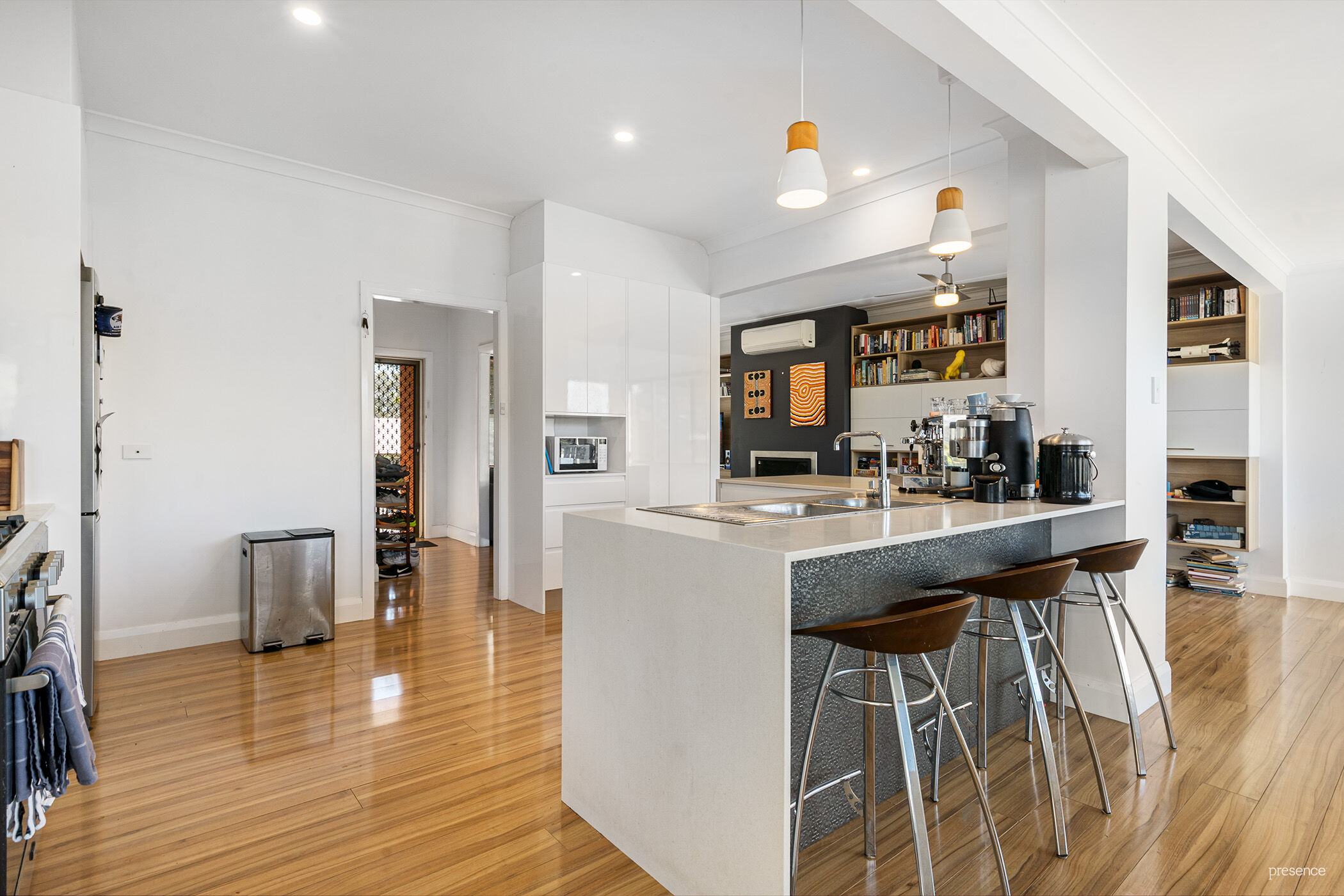 – Built-in sleek white and timber cabinetry as entertainment unit and library