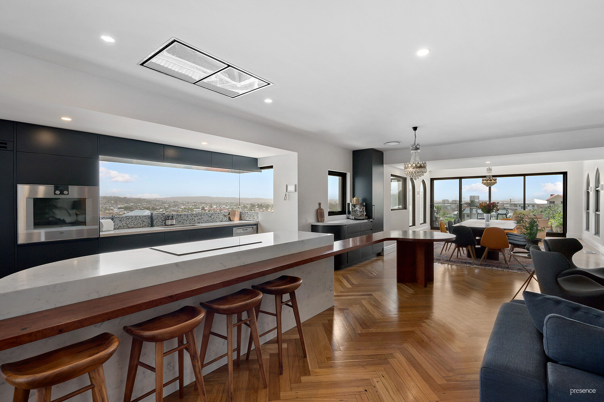 The voluminous open plan living area stretches out on the upper floor connecting with an alfresco terrace. Abundant glass allows you to interact with the ocean and beach views, while as night falls, the surrounding city comes alive with sparkling lights.