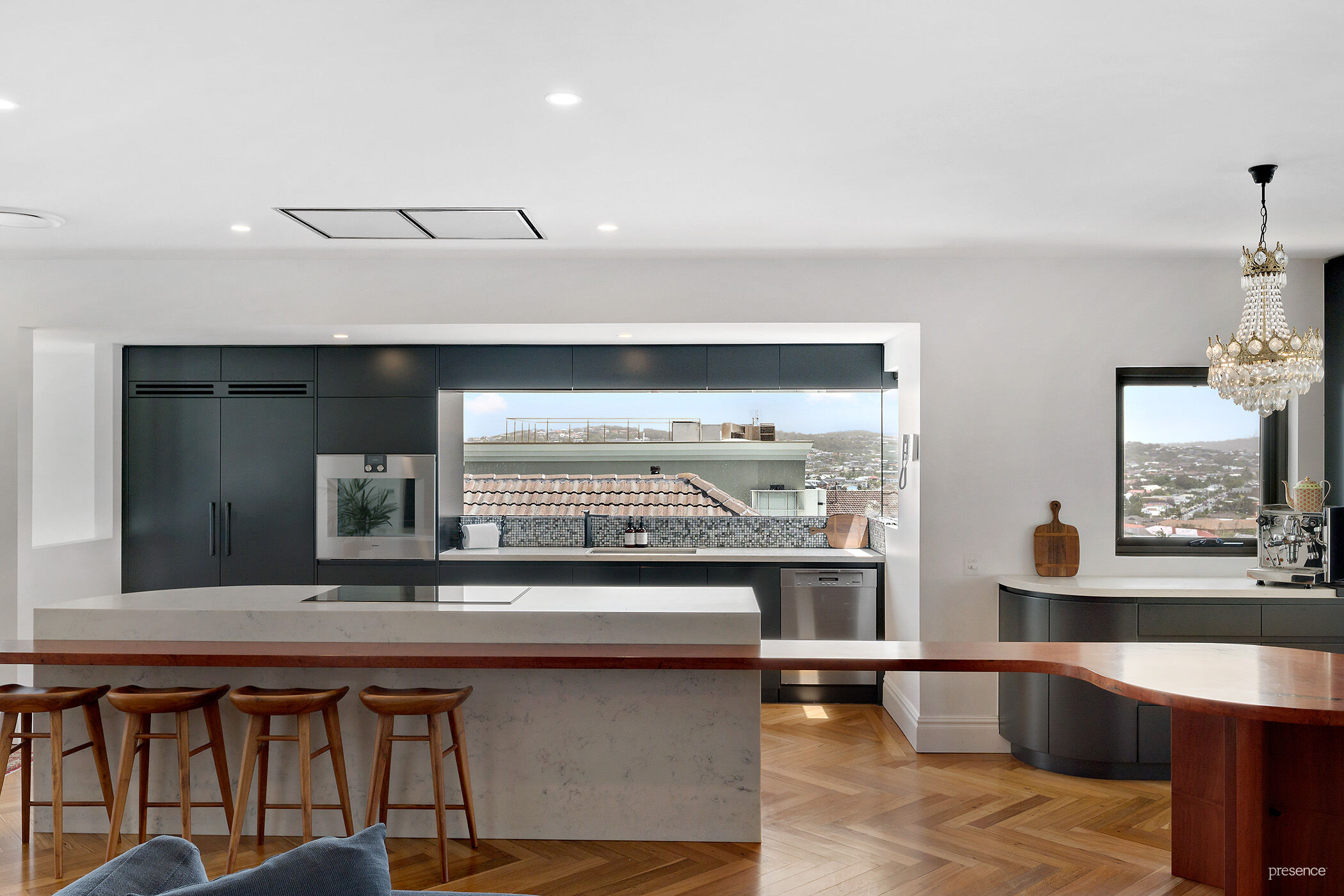 The bespoke chef’s kitchen is the home’s heart with Neff and Gaggenau cooking appliances, integrated Liebherr fridge/freezer and a stone island with integrated timber dining bench.