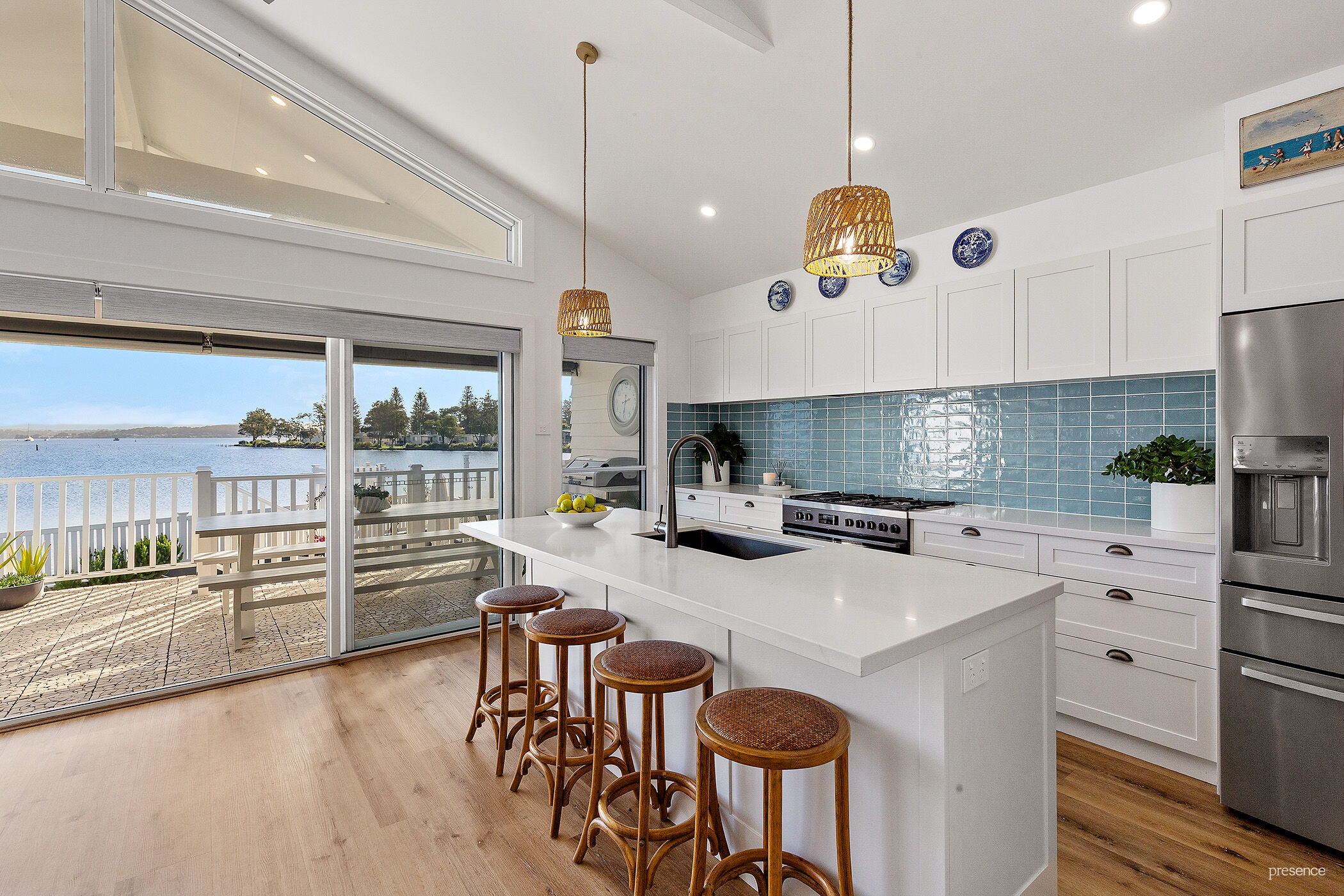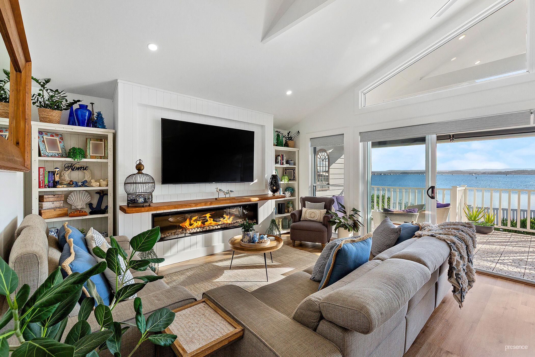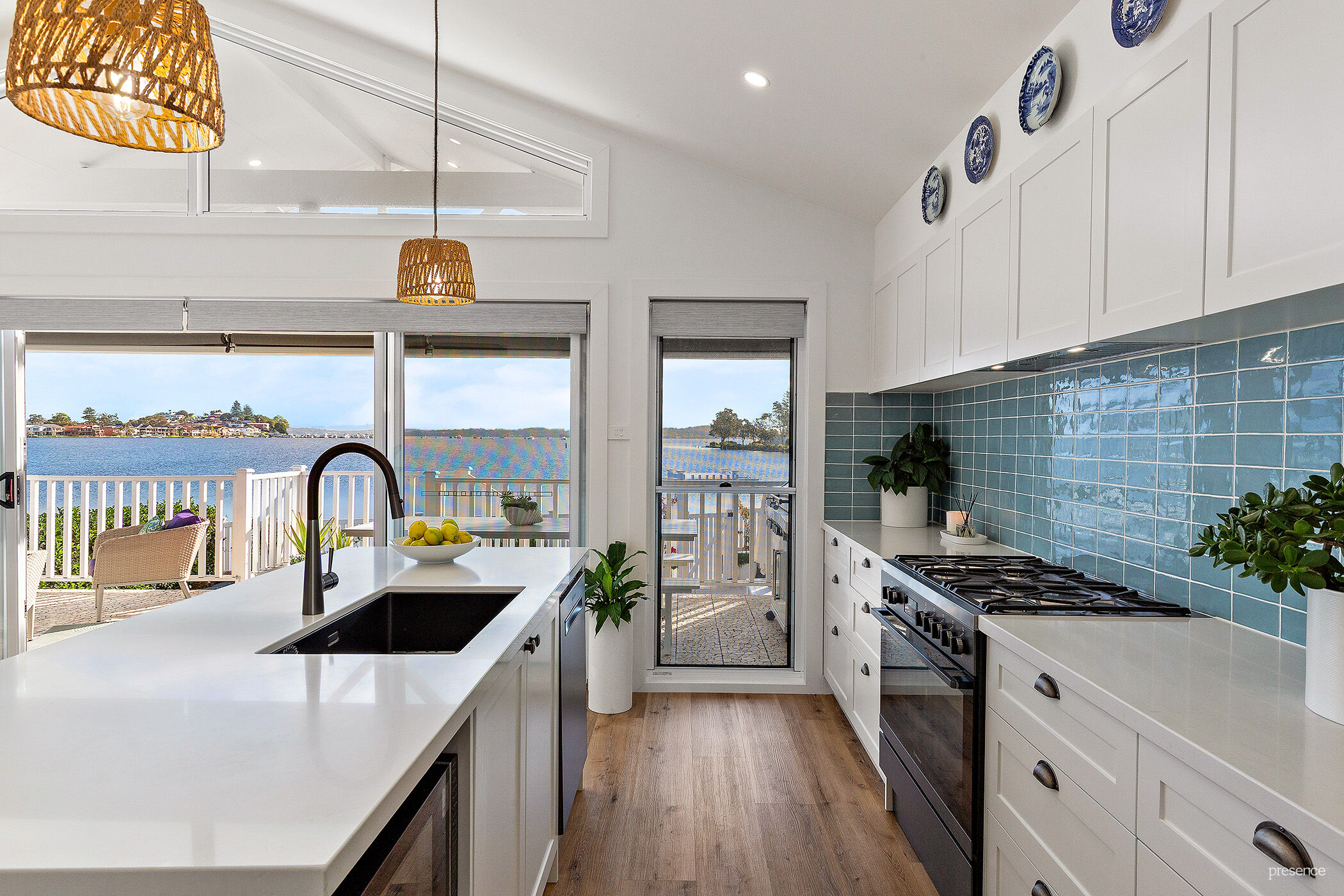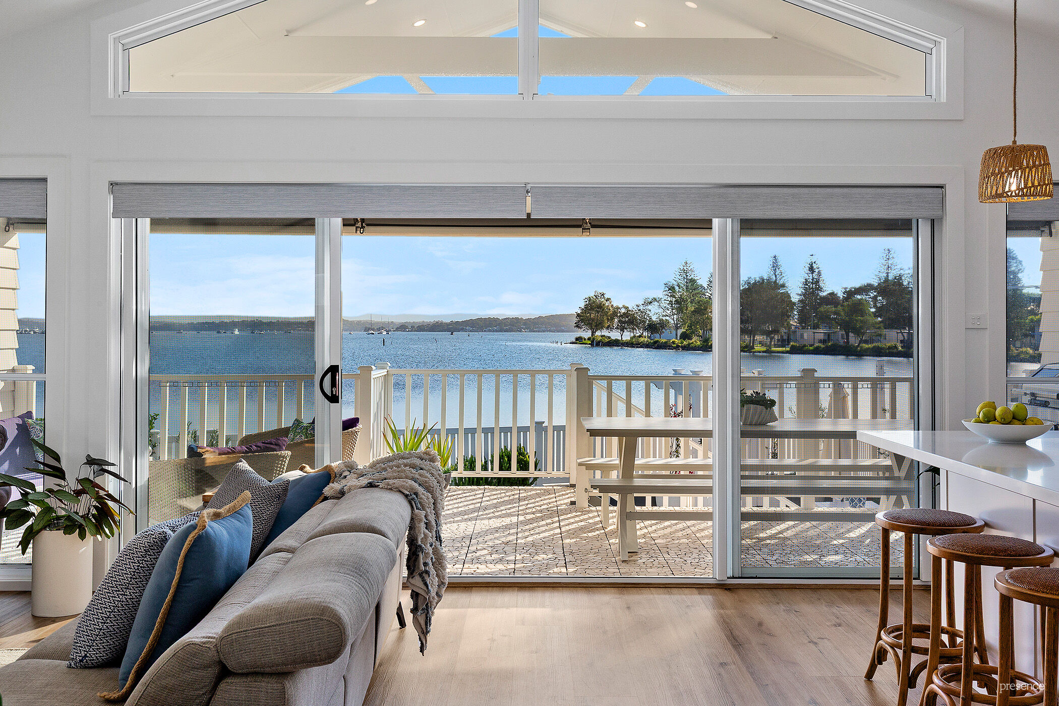 Step inside and be instantly drawn by encompassing water and sky views that shift with the light and seasons. From the soaring cathedral ceilings with light-infused clerestory windows to the sun-drenched open plan living area, every inch has been crafted with exquisite attention to detail. The soft white palette and beach-inspired textures create an effortlessly coastal mood, while the ducted air-conditioning and ambient electric flame fireplace offer year-round comfort and charm. At the heart of this space, a bespoke island kitchen shines with crisp white stone benchtops, smart gunmetal-grey accents, and a full suite of premium appliances. Add to that, a generous butler’s pantry which keeps the main space spotless and functional, allowing you to entertain with ease.