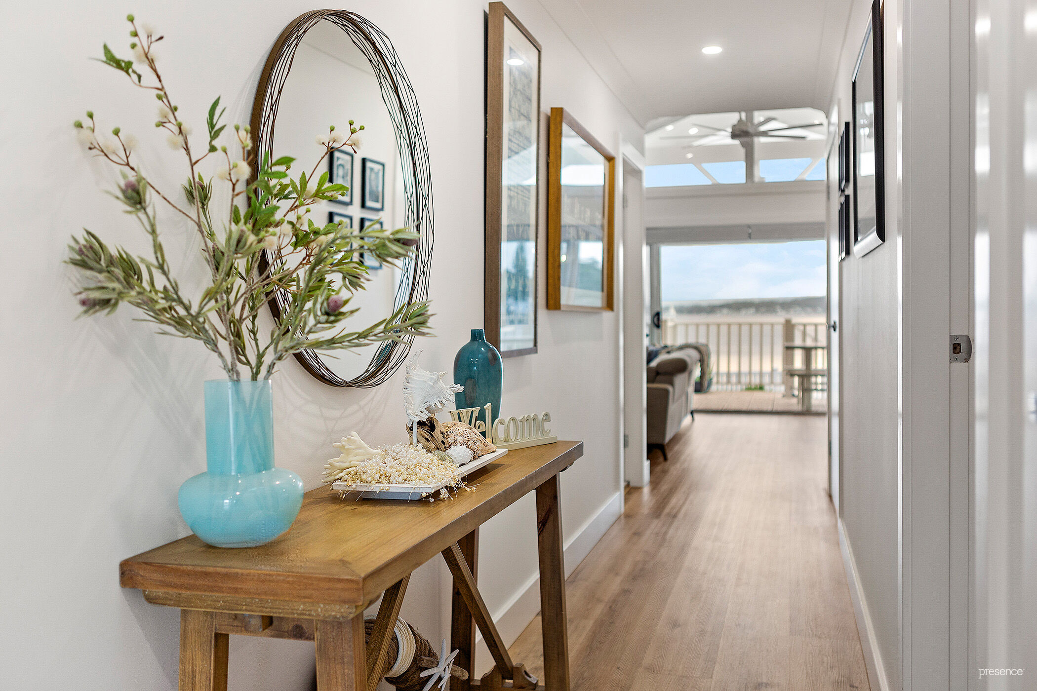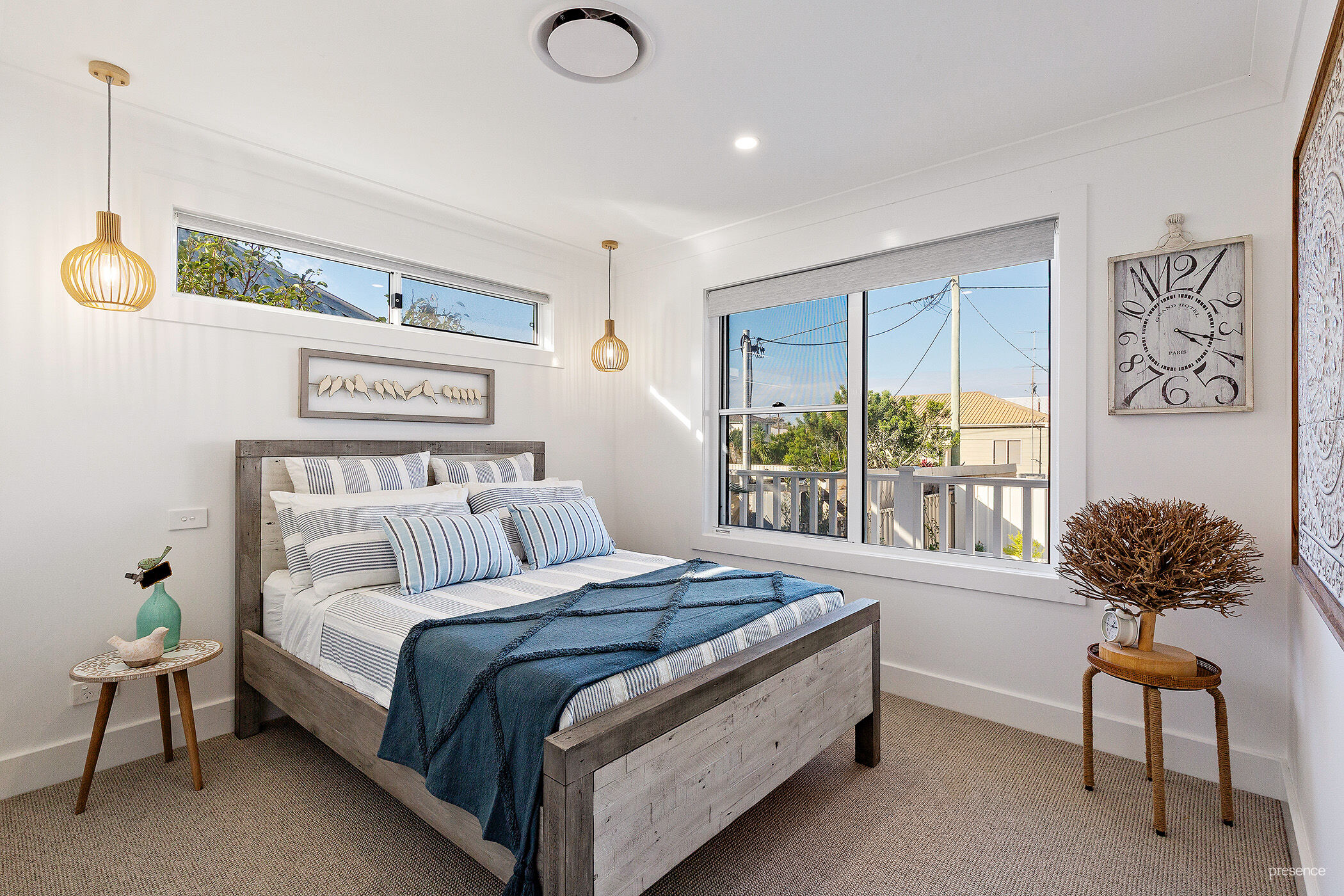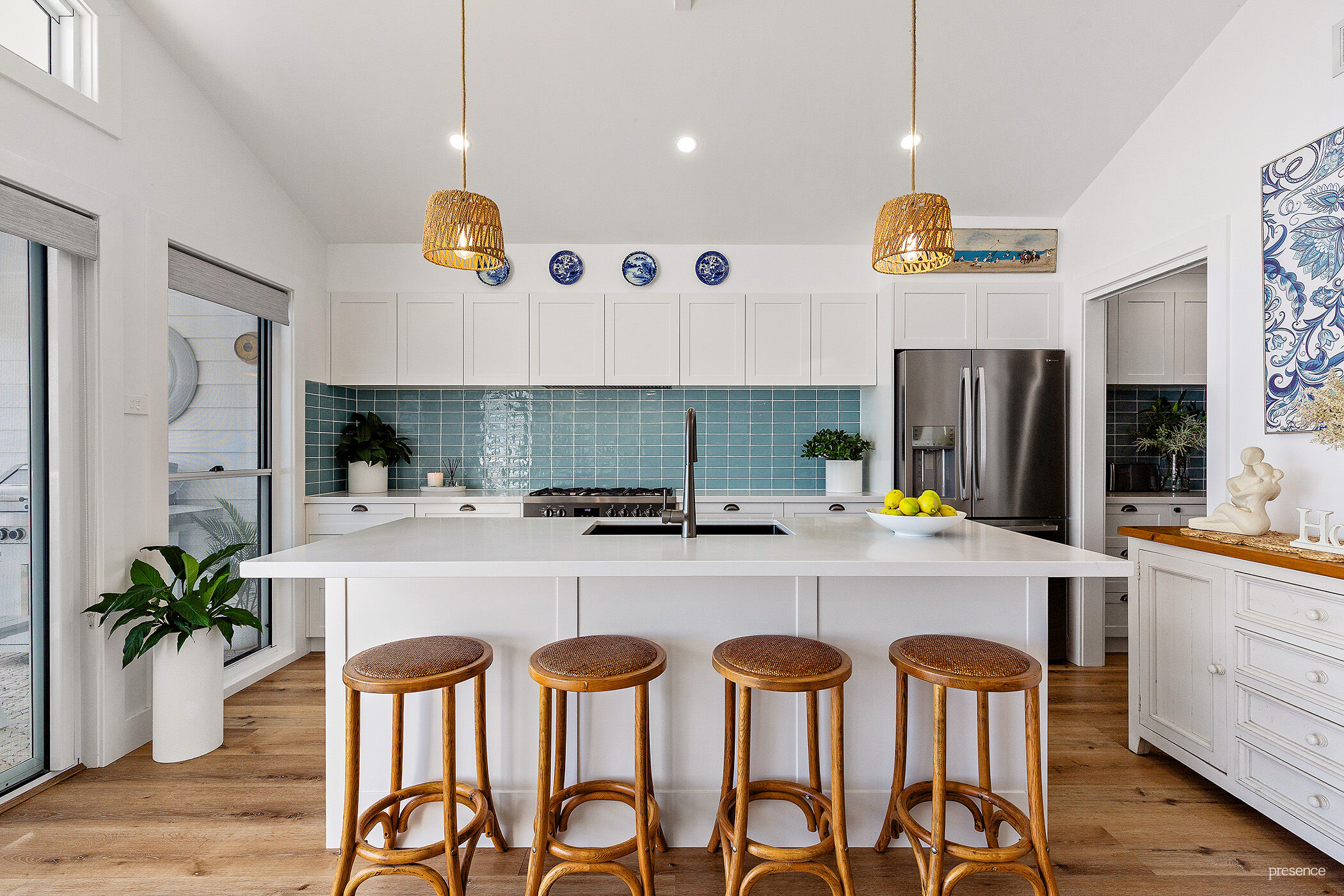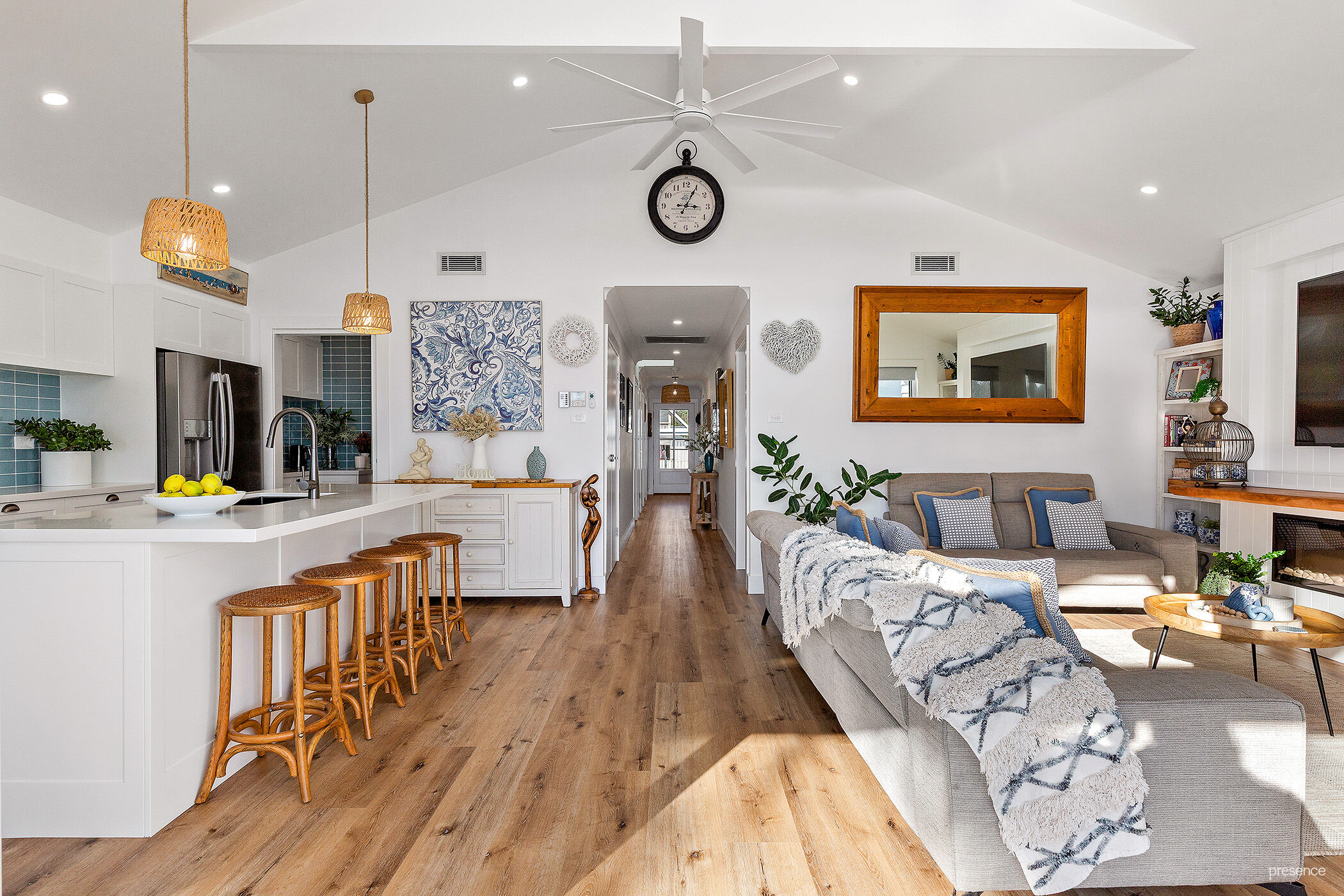 Step inside and be instantly drawn by encompassing water and sky views that shift with the light and seasons. From the soaring cathedral ceilings with light-infused clerestory windows to the sun-drenched open plan living area, every inch has been crafted with exquisite attention to detail. The soft white palette and beach-inspired textures create an effortlessly coastal mood, while the ducted air-conditioning and ambient electric flame fireplace offer year-round comfort and charm. At the heart of this space, a bespoke island kitchen shines with crisp white stone benchtops, smart gunmetal-grey accents, and a full suite of premium appliances. Add to that, a generous butler’s pantry which keeps the main space spotless and functional, allowing you to entertain with ease.