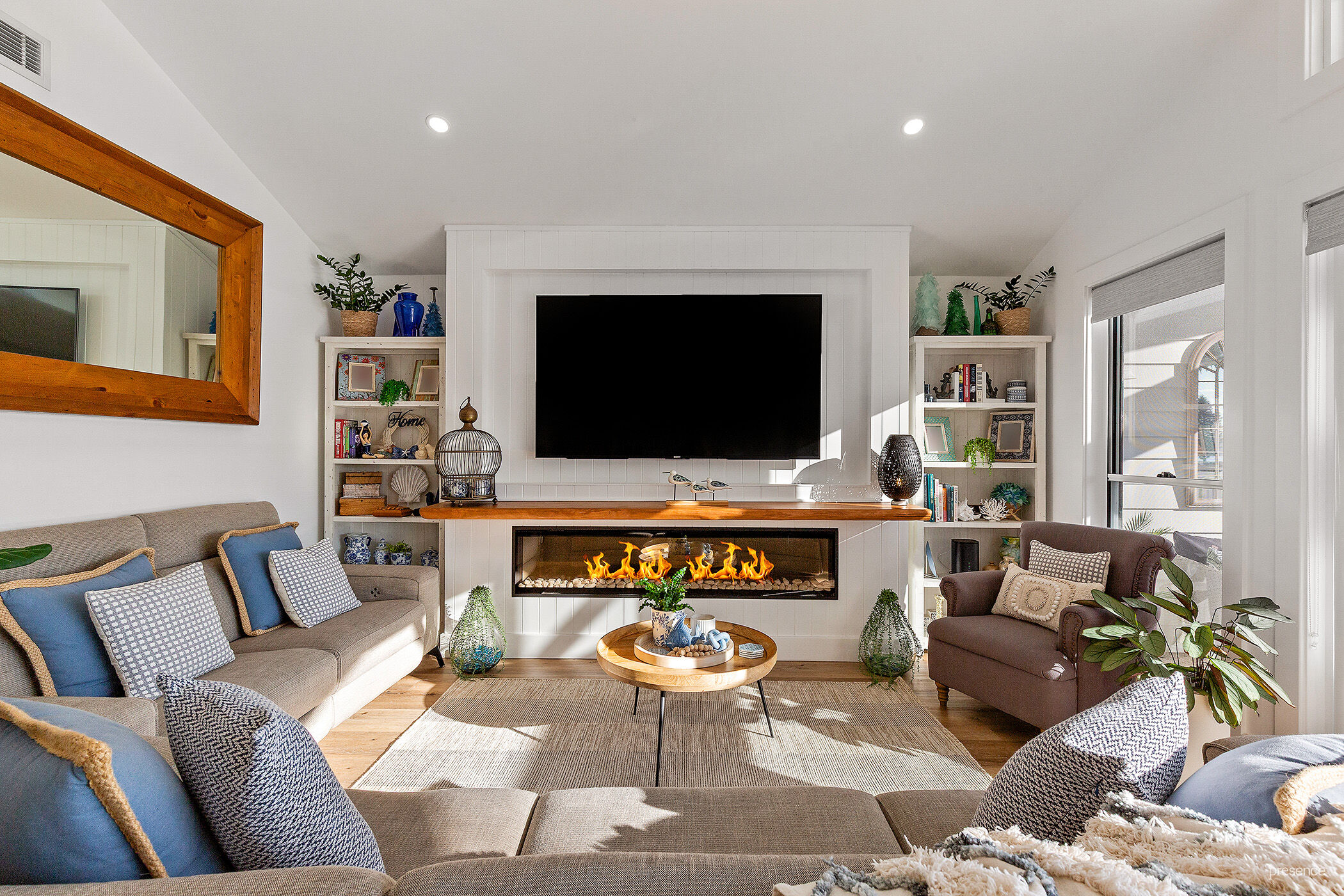 – A skylit hallway leads to a spacious, open-plan living area with soaring cathedral ceilings, exposed beams, and a cozy electric flame-effect fireplace.