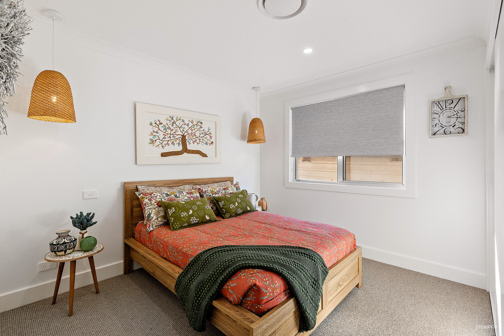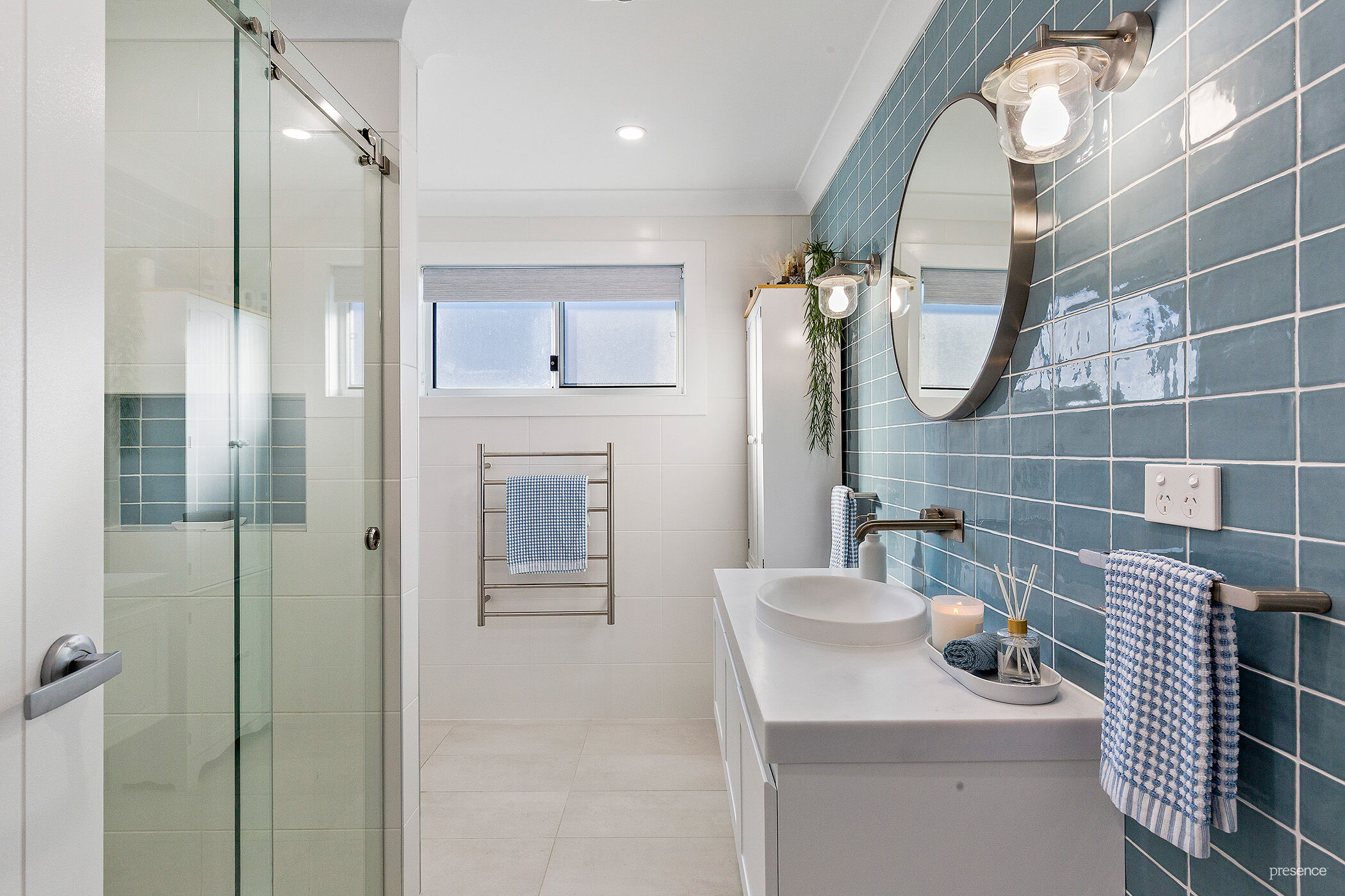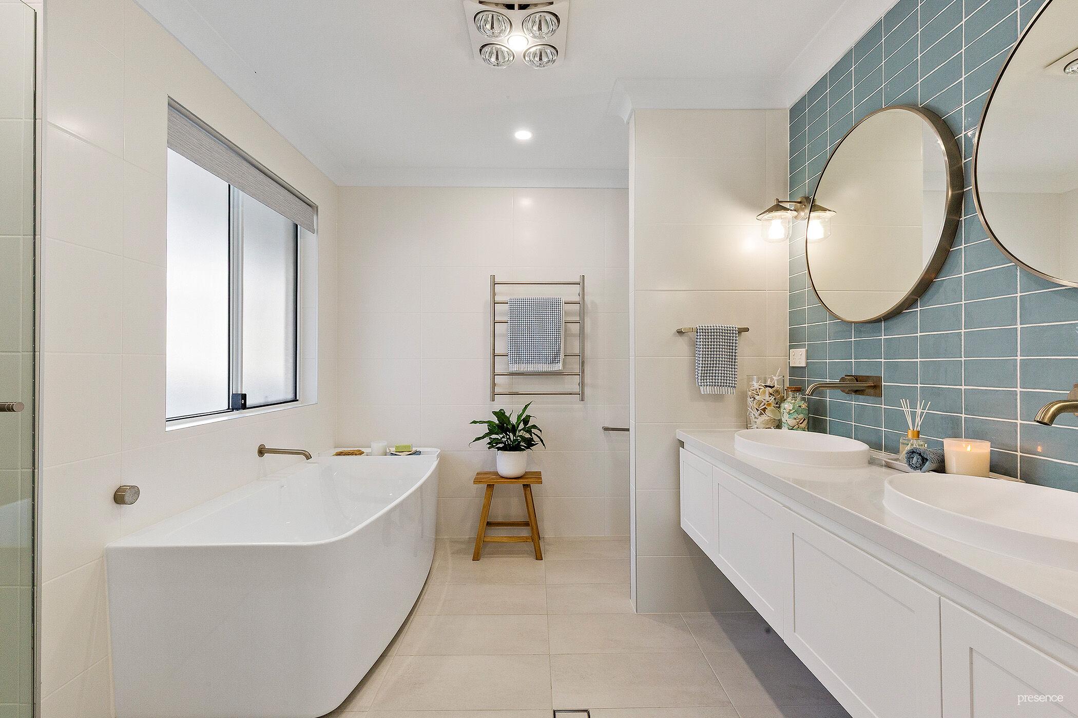 – Two elegant, fully tiled bathrooms feature heated towel rails and brushed nickel tapware, while the ensuite boasts a luxurious freestanding bath.