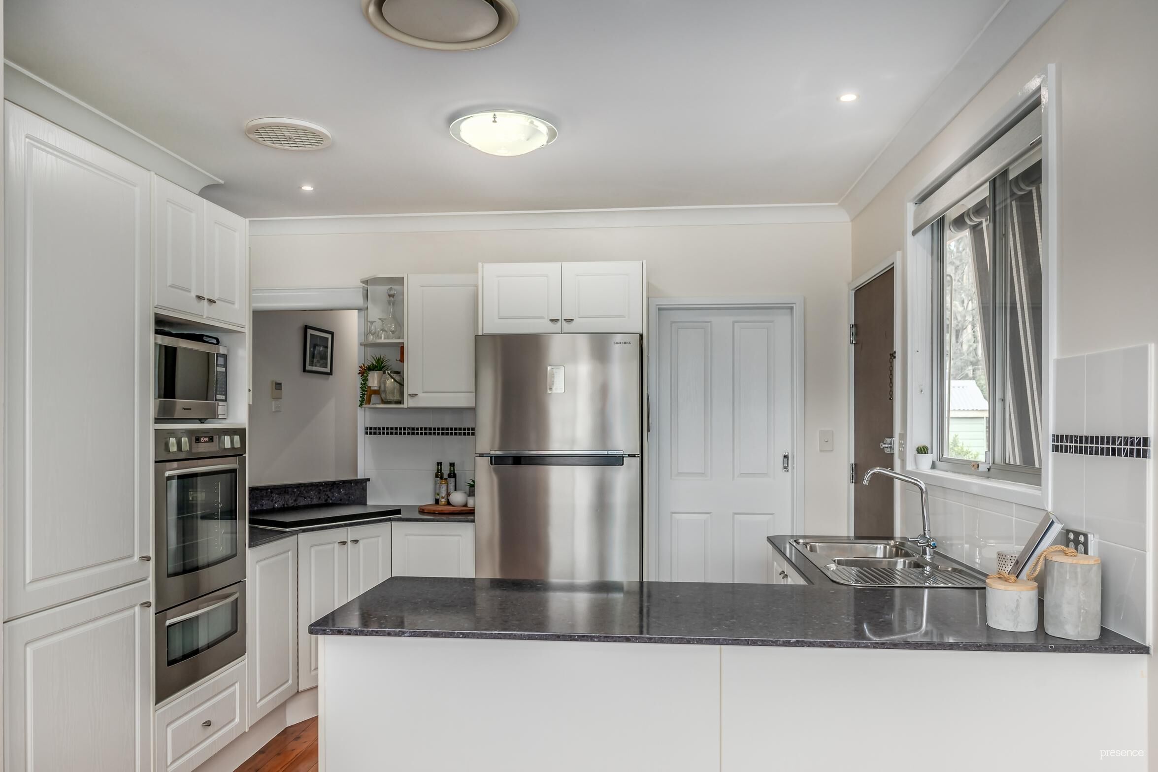 – Modern kitchen with granite benchtops, electric inverter cooktop and wall oven