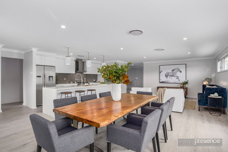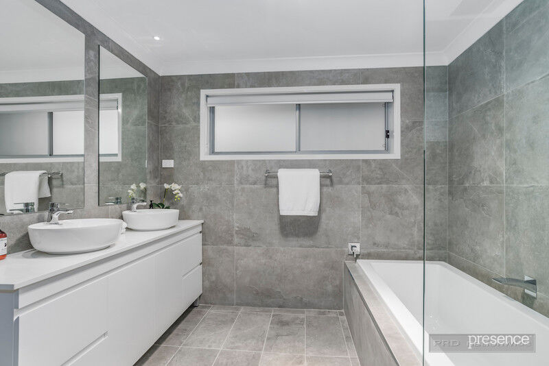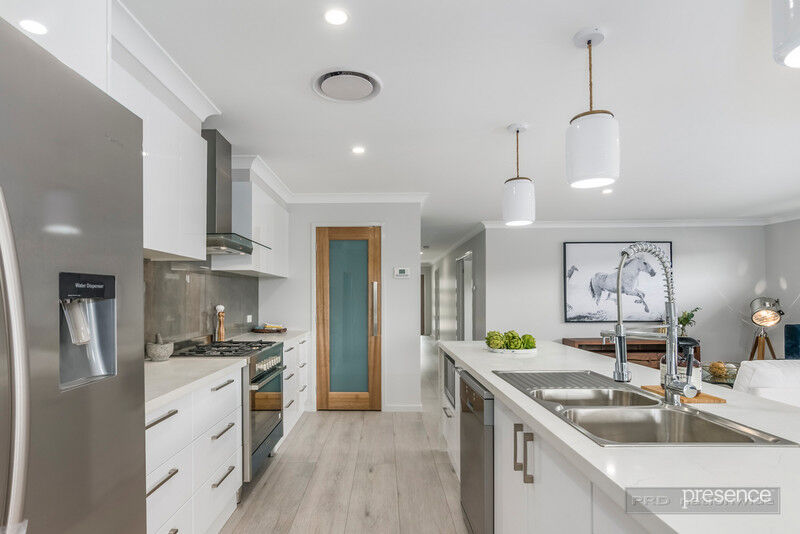 The functioning heart of the home is the rear living area, an expansive, open plan space that is tailor-made for entertaining. The island kitchen with its stone-wrapped countertops, walk-in pantry and gas cooking is a perfect complement to the all-weather terrace and lush wrap-around lawns offering a place for play and relaxation. The multi-functional media room is perfect for the whole family offering an extra living area or a place to simply catch up on TV or your favourite movie. All four bedrooms are oversized supported by two bathrooms where eye-catching tiling, stone-topped vanities and large showers are a fabulous display of luxe design. A double automatic garage offers the convenience of internal access while other notable highlights include ducted air-conditioning, rainwater tanks and ample storage.