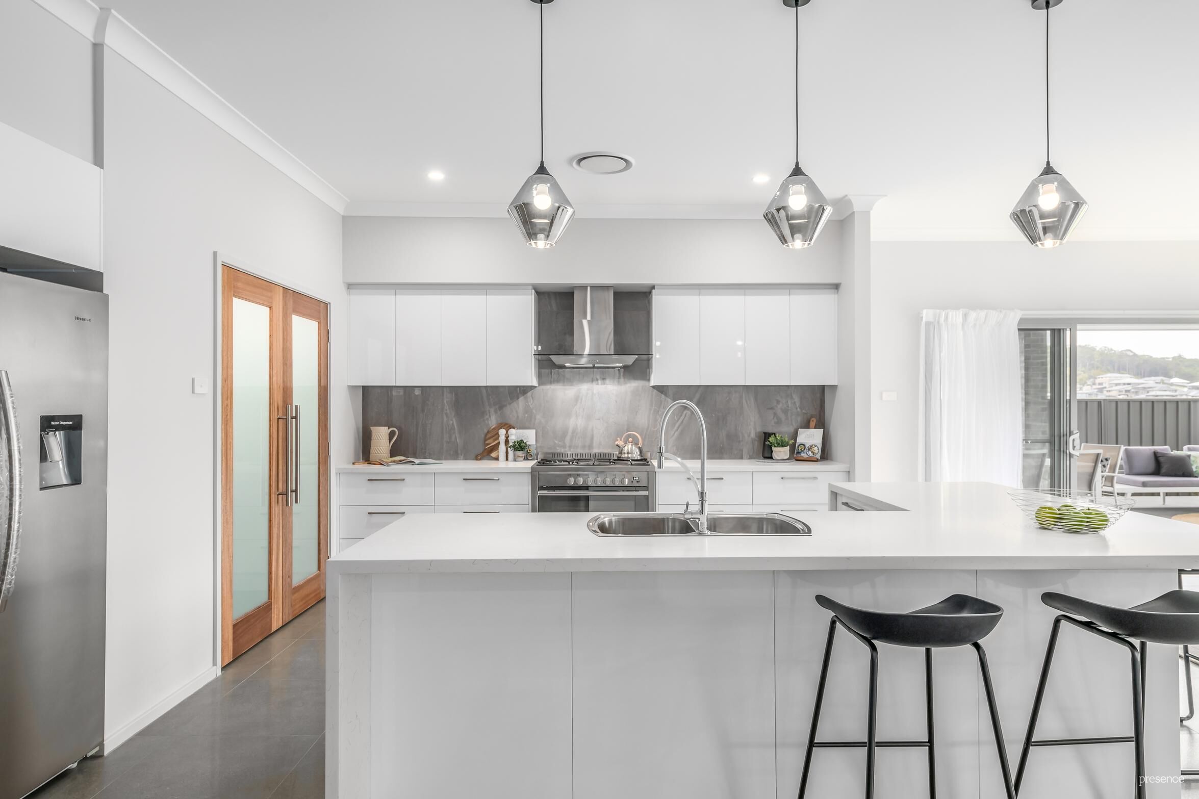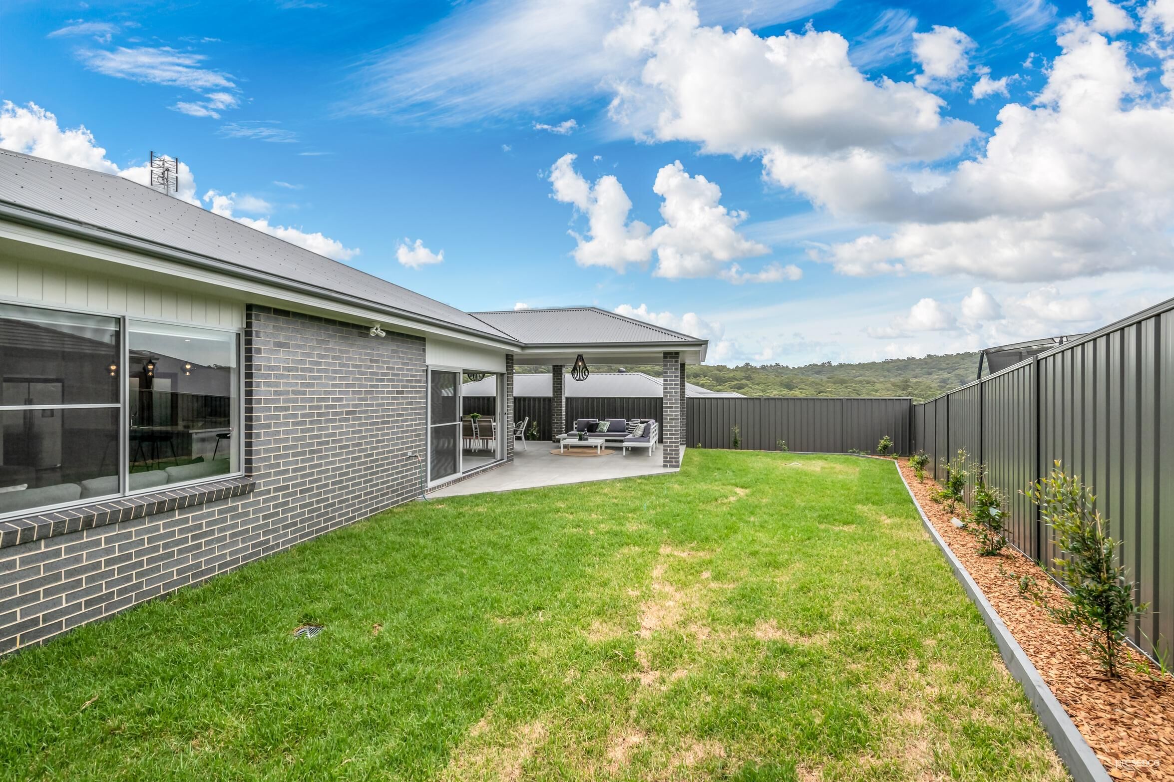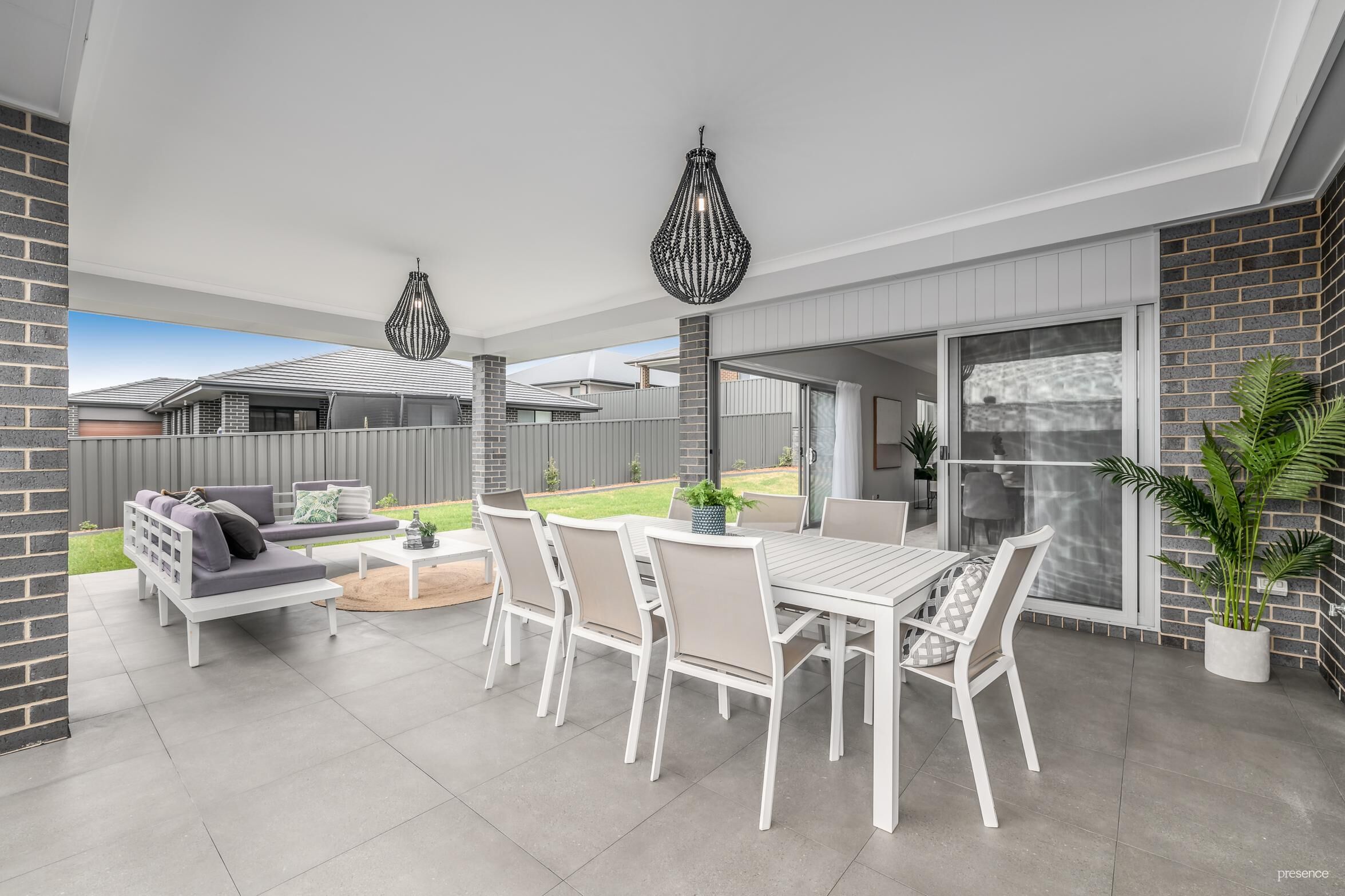 – All-weather alfresco entertaining area with gas outlet, beaded pendant lighting and district views