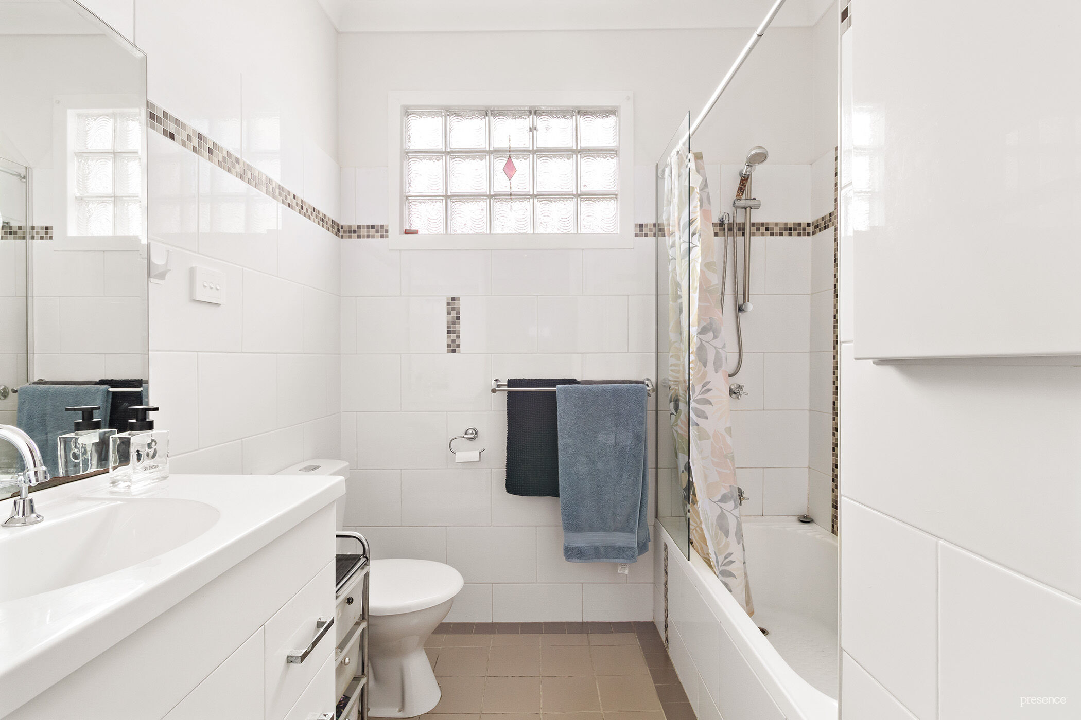 – Bright modern bathroom with a shower/bath combination.