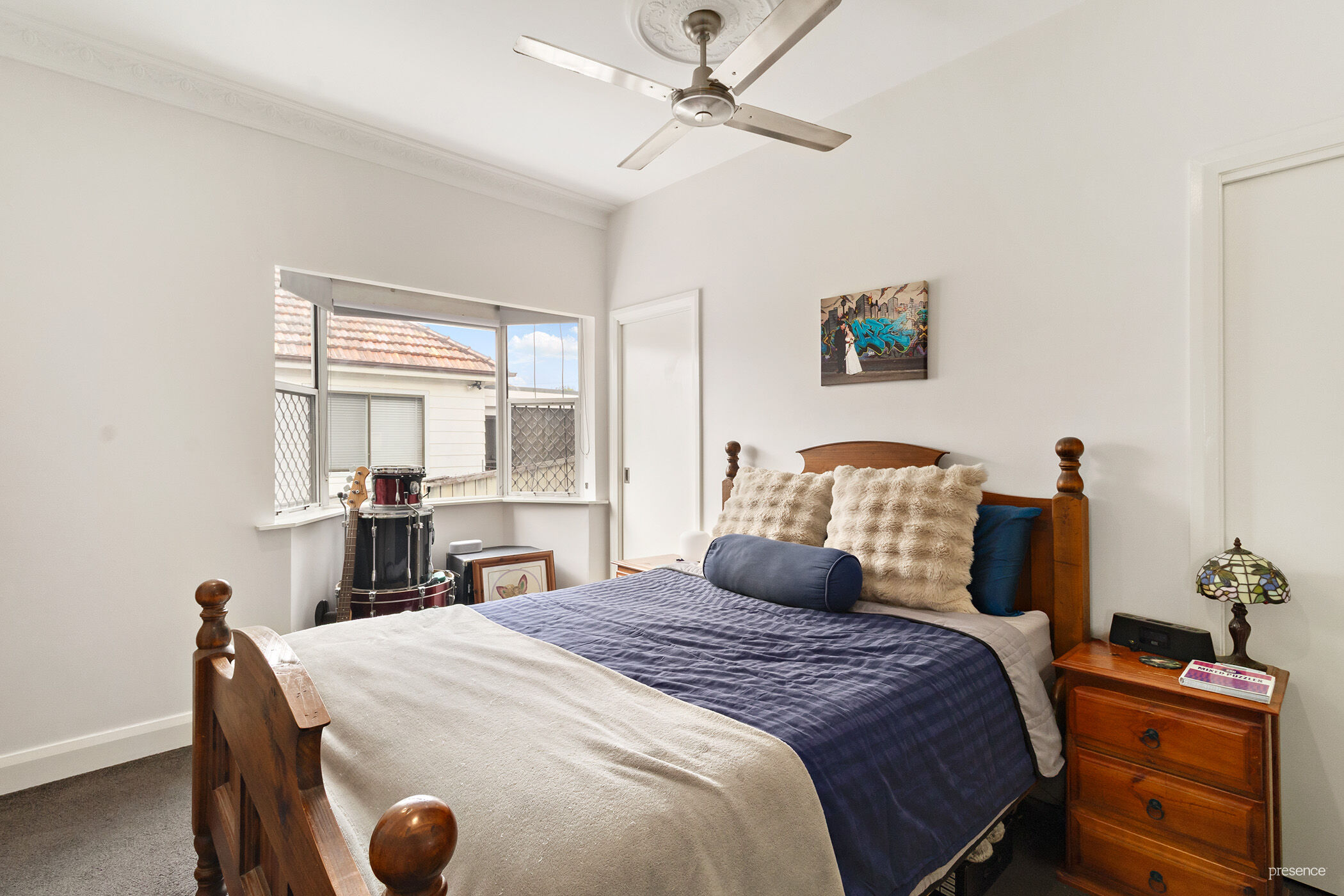 The entrance is both welcoming and charming, framed by neat hedgerows and a pleasant facade. Step inside to discover high ceilings and exquisite original plasterwork, a gentle nod to the home’s rich heritage. Three large bedrooms offer ceiling fans for year-round comfort, with the master bedroom boasting dual walk-in robes for added convenience.