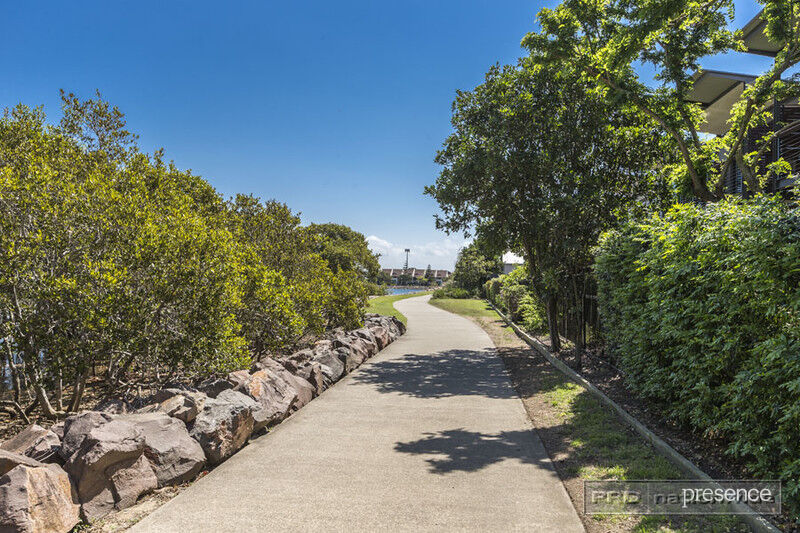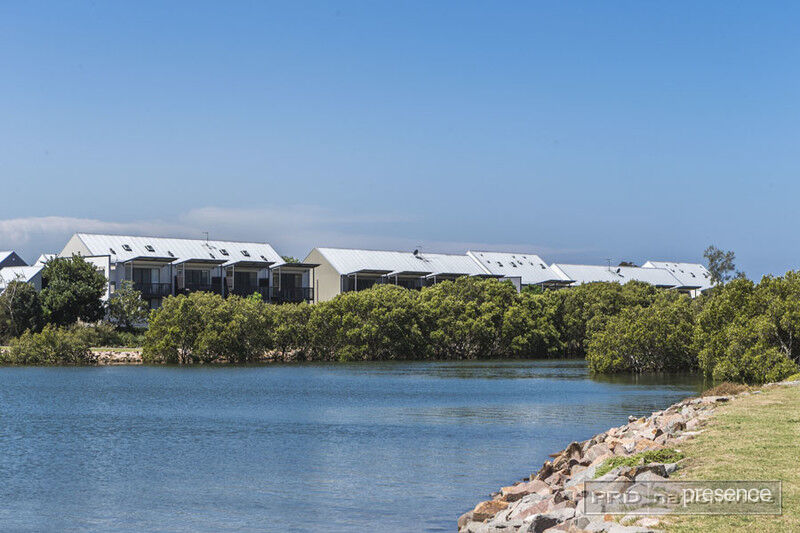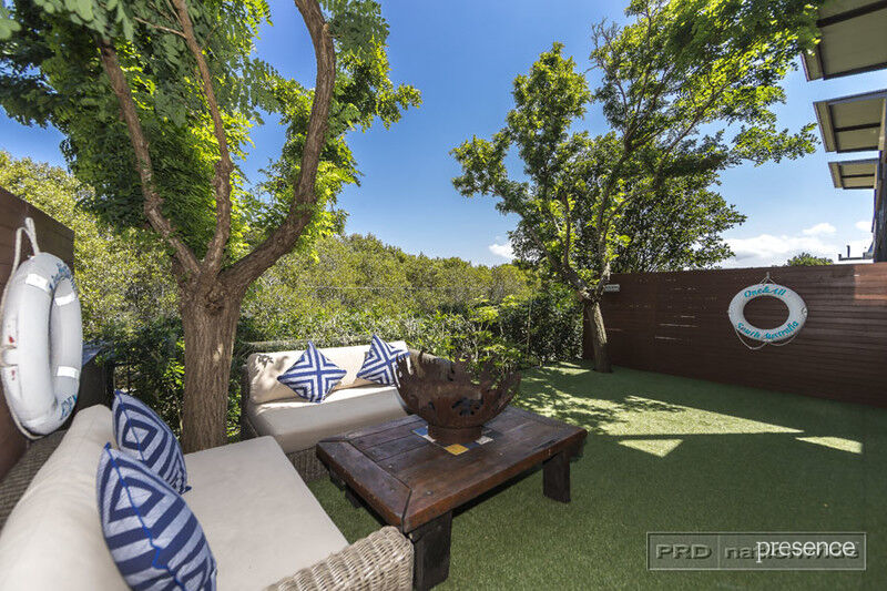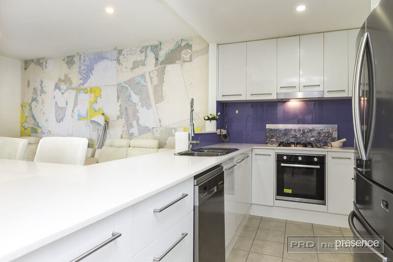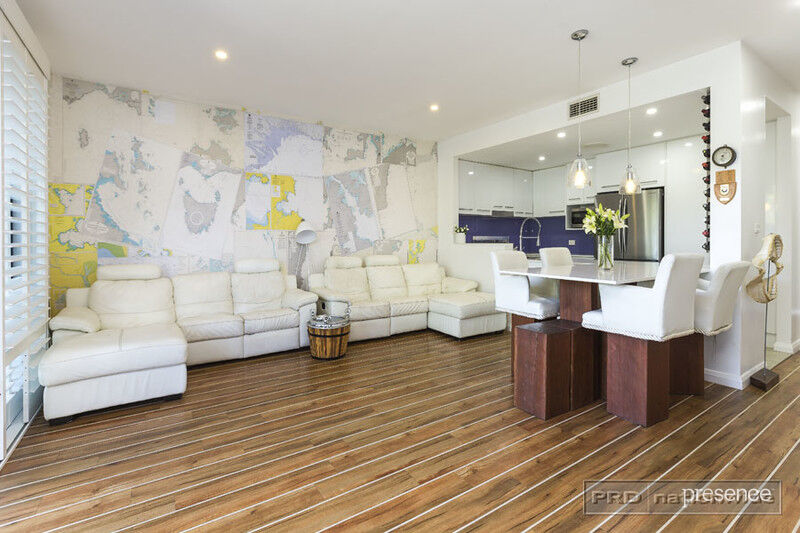 A modern, nautical aesthetic with custom flooring, a breakfast bar fashioned from a jetty pylon and funky map wallpaper casts a fresh and vibrant atmosphere and an engaging first impression in this ‘Dockside at Kennedy Cove’ townhouse. Set to the rear of this sought-after complex, it sits waterfront where a landscape of lush greenery is set against the lapping waters of Throsby Creek and the melodic sounds of birdsong.