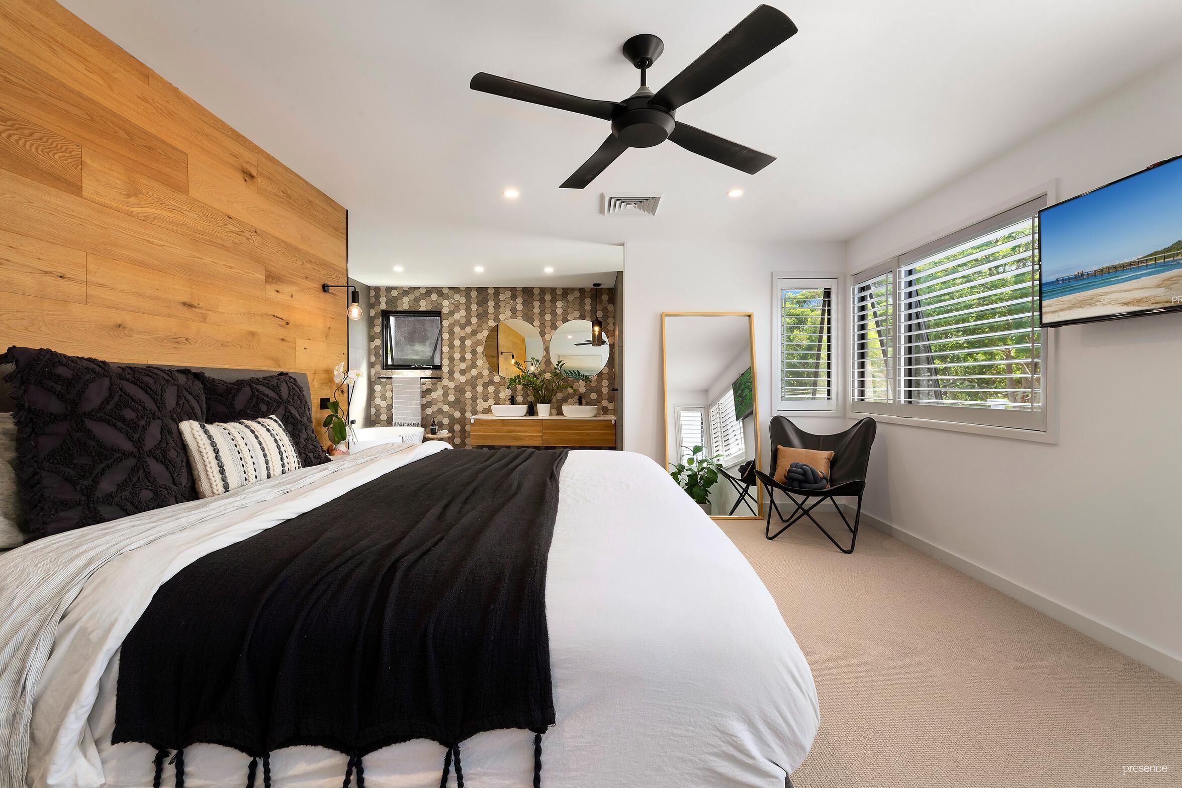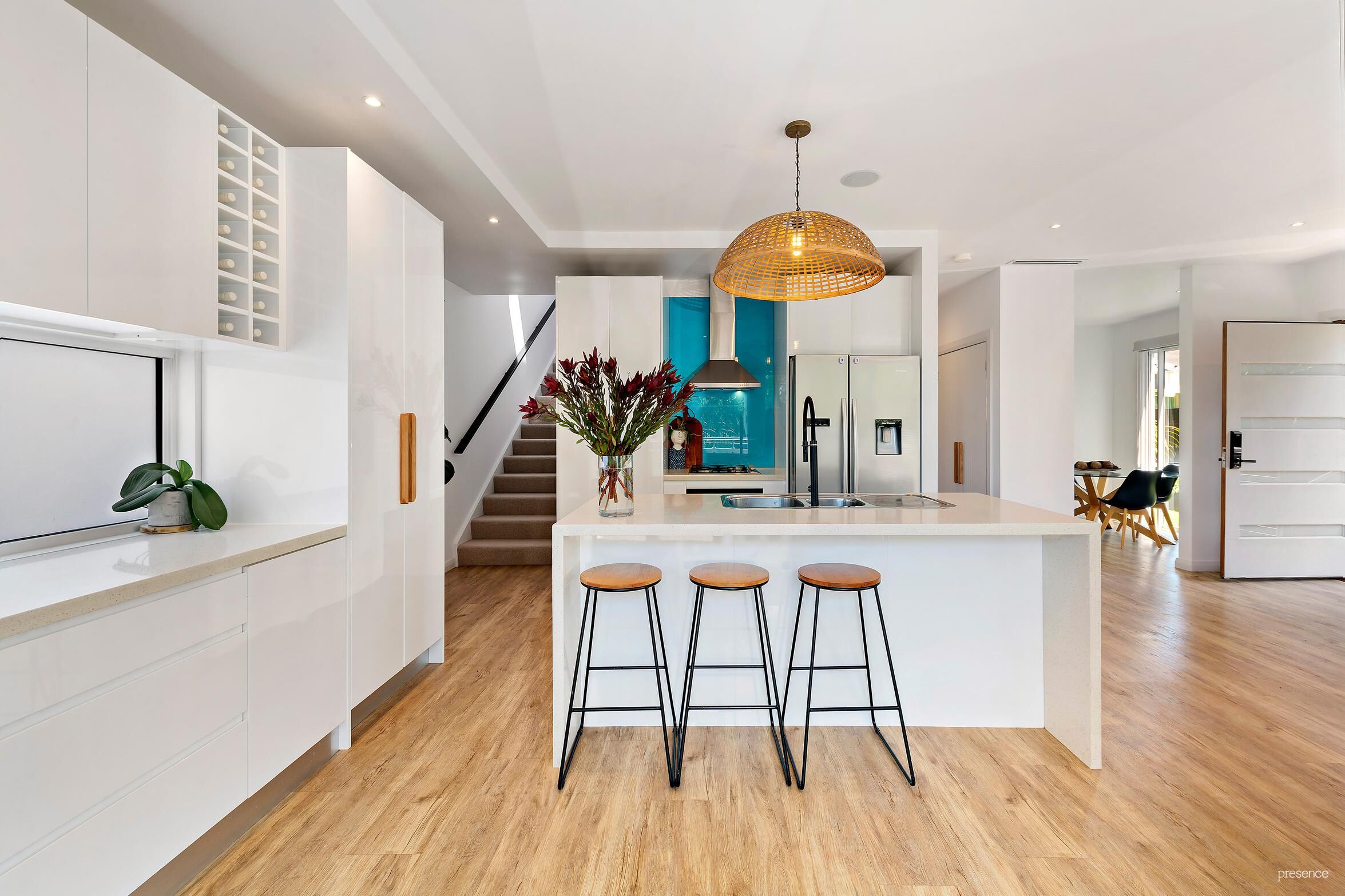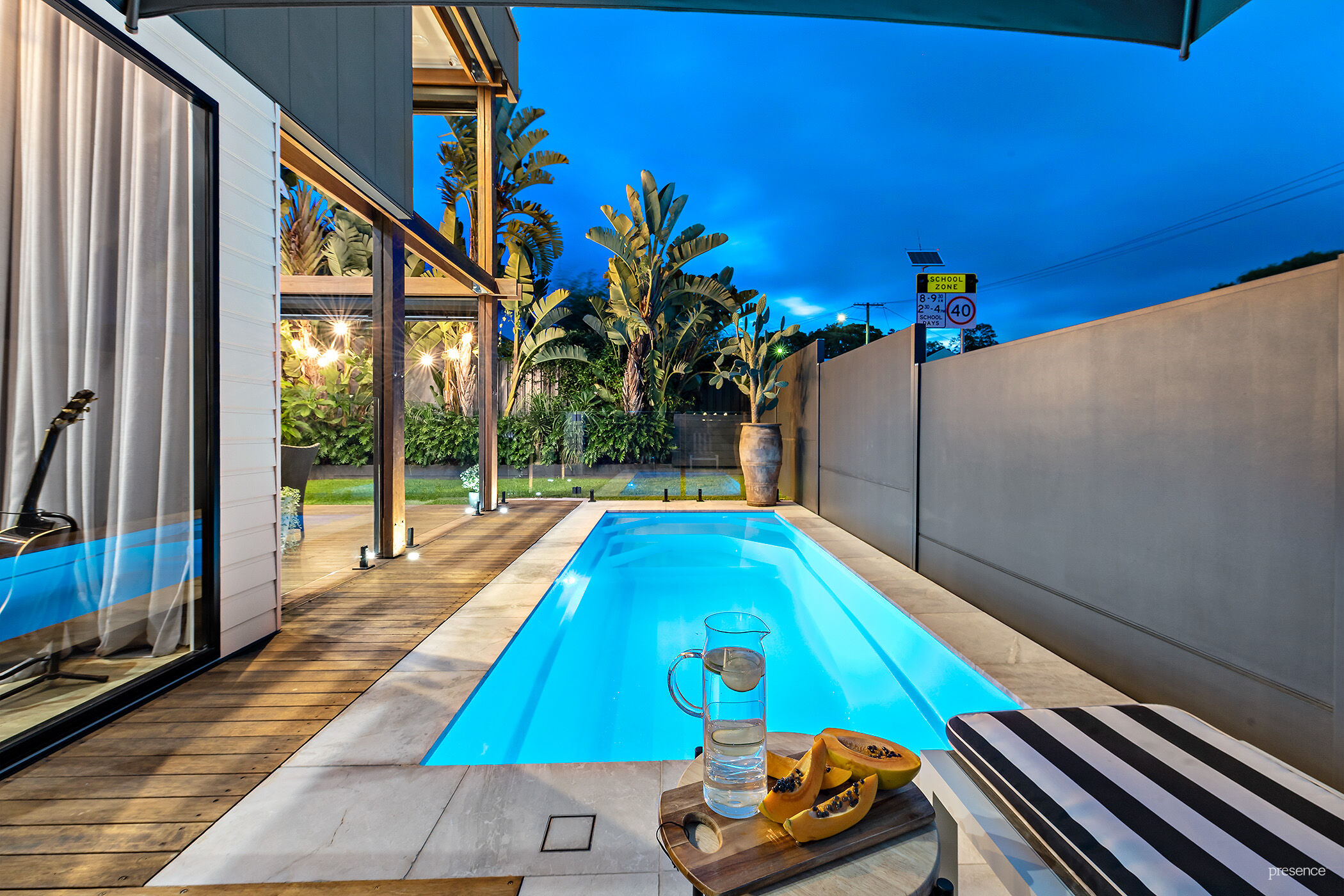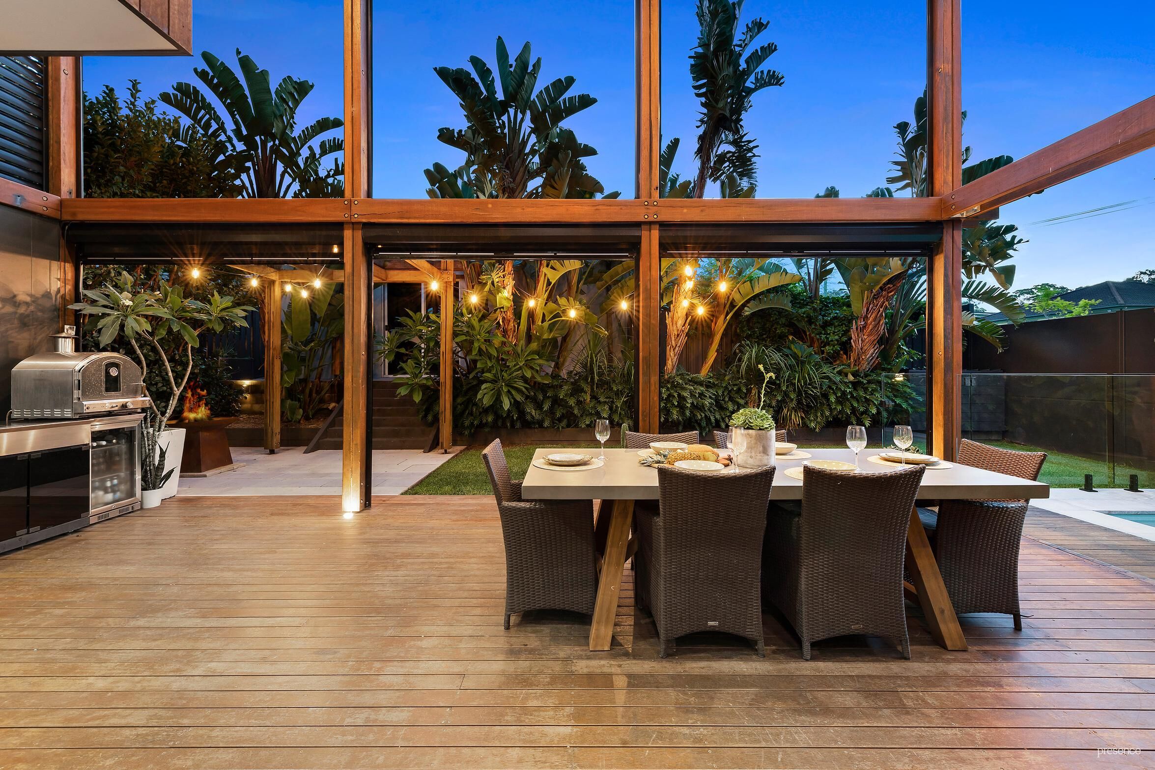 Greeted upon entry by a large open-plan living and kitchen space, the home immediately shows itself to be bright and welcoming. Bathed in natural light, the entire space fills with prevailing breezes through the large windows and doors that open to the north facing timber deck. A separate dining room lies just off the living space while a hallway feeds to two bedrooms, both with ceiling fans, one with built-in robe and the other with a walk-in robe, as well as the main bathroom with separate bath and walk-in shower. All effort has been made to continue the appreciation of natural light upstairs, which is showcased by gorgeous 100% New Zealand wool carpeting and two bedrooms, including the large master bedroom which features a beautifully designed ensuite and walk-in wardrobe. At the rear of the house is a second living area which impresses with its open nature gifted by the stunning window-wall and adjacent large glass sliding door that opens to the covered Merbau timber deck. As an entertainment area, the rear of this house has been magnificently imagined, offering plentiful space for large get-togethers in any weather, as well as a heated inground pool with resort-style decking, full coverage lighting and motorized screens. Also at the rear of the property is a separate two-car garage that could be converted into an office, gym or granny flat (STCA). The entire property presents as thoughtfully landscaped with a tropical feel that will not demand high maintenance.