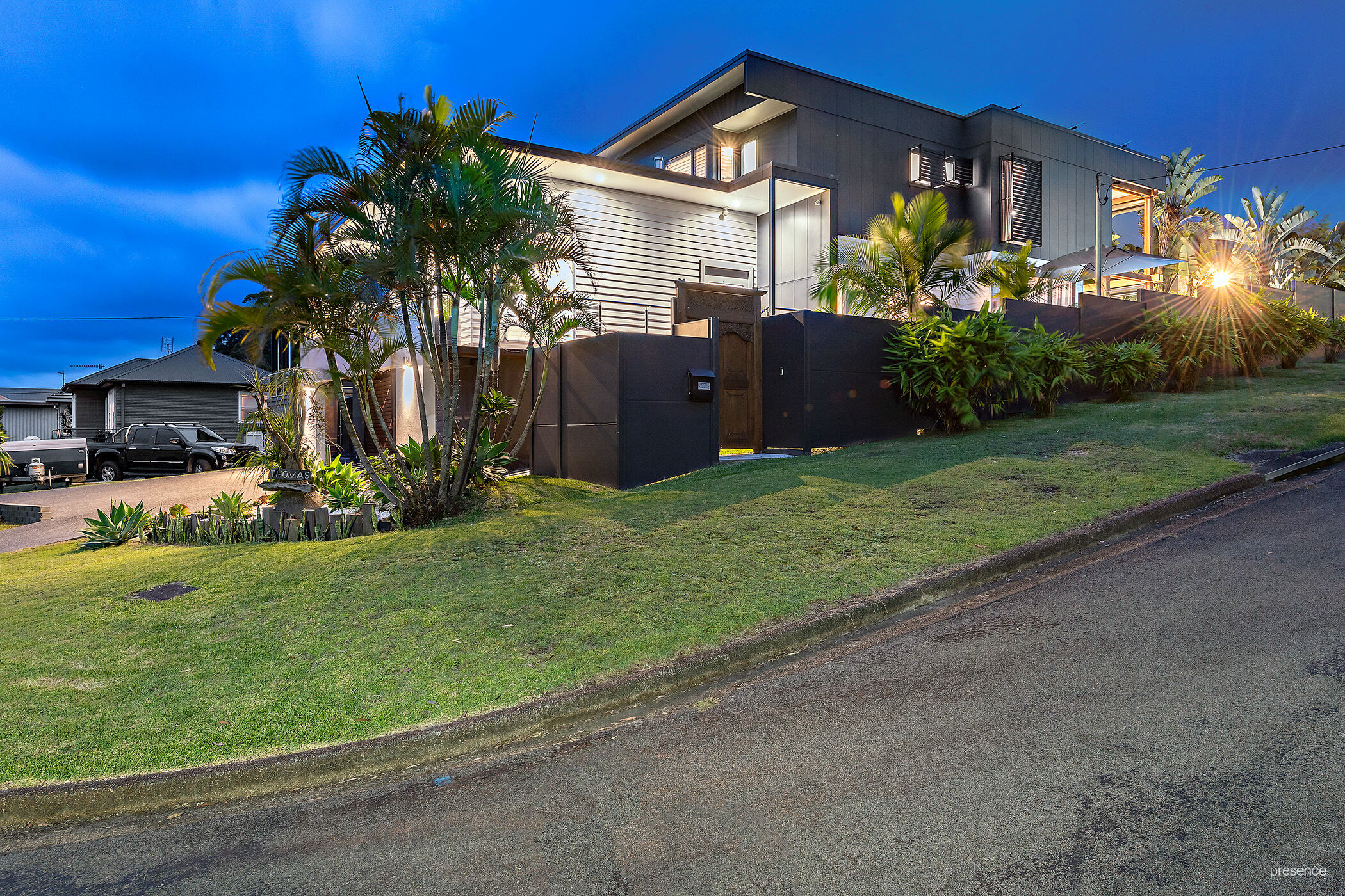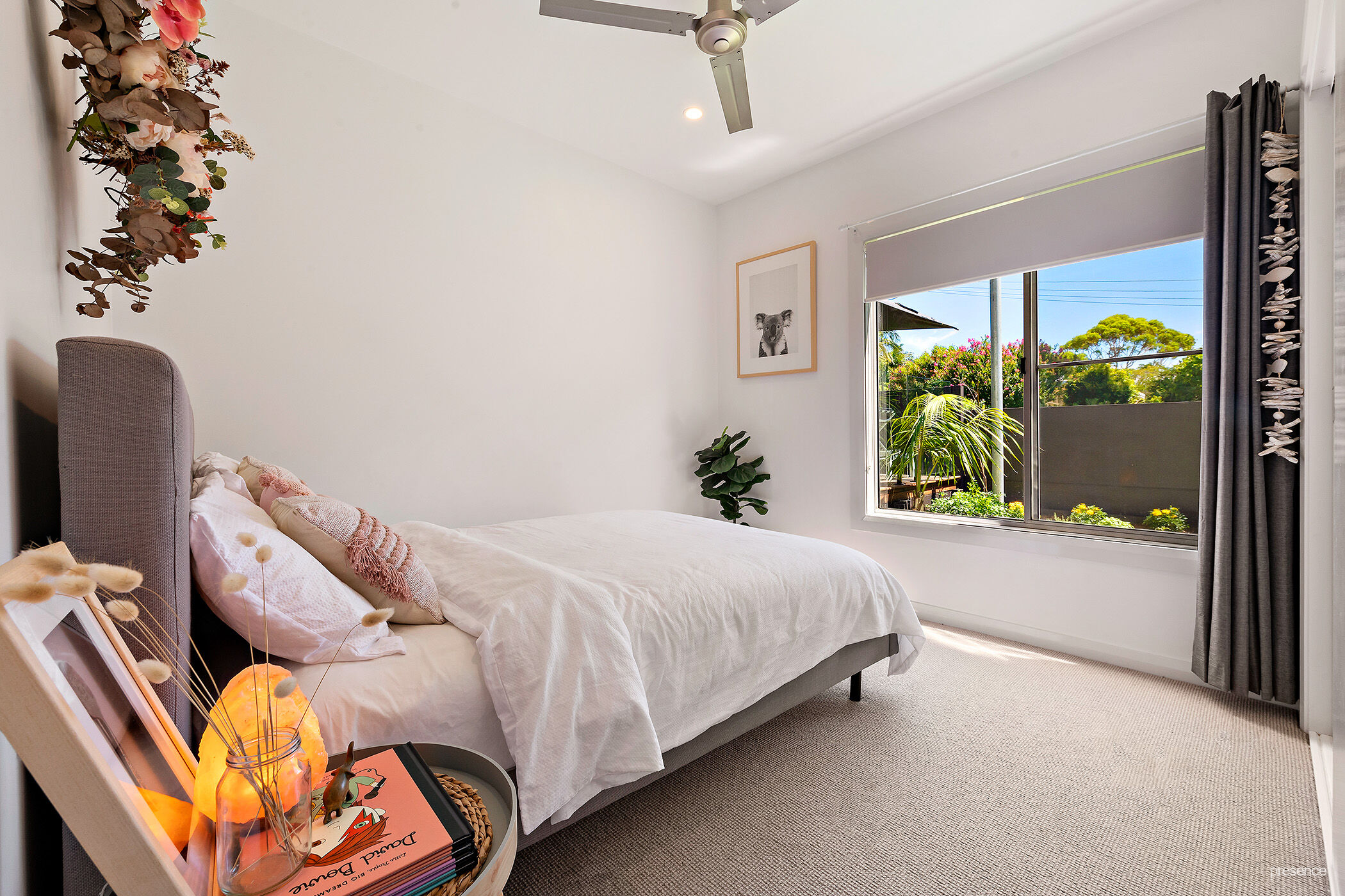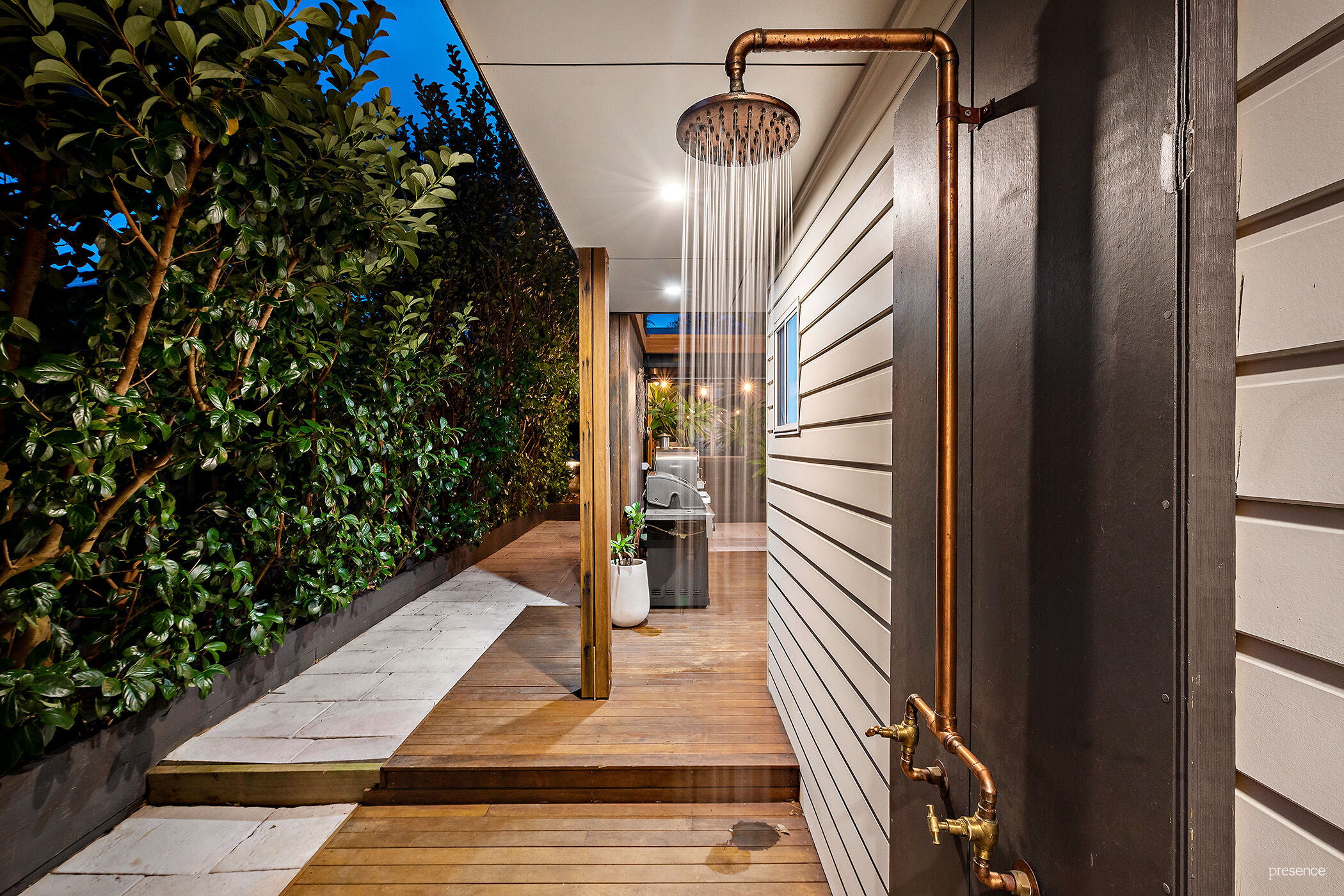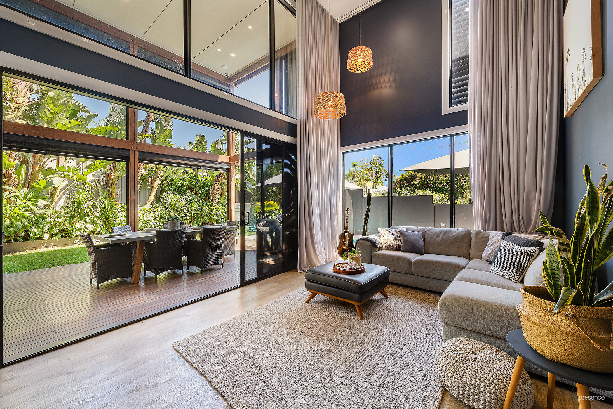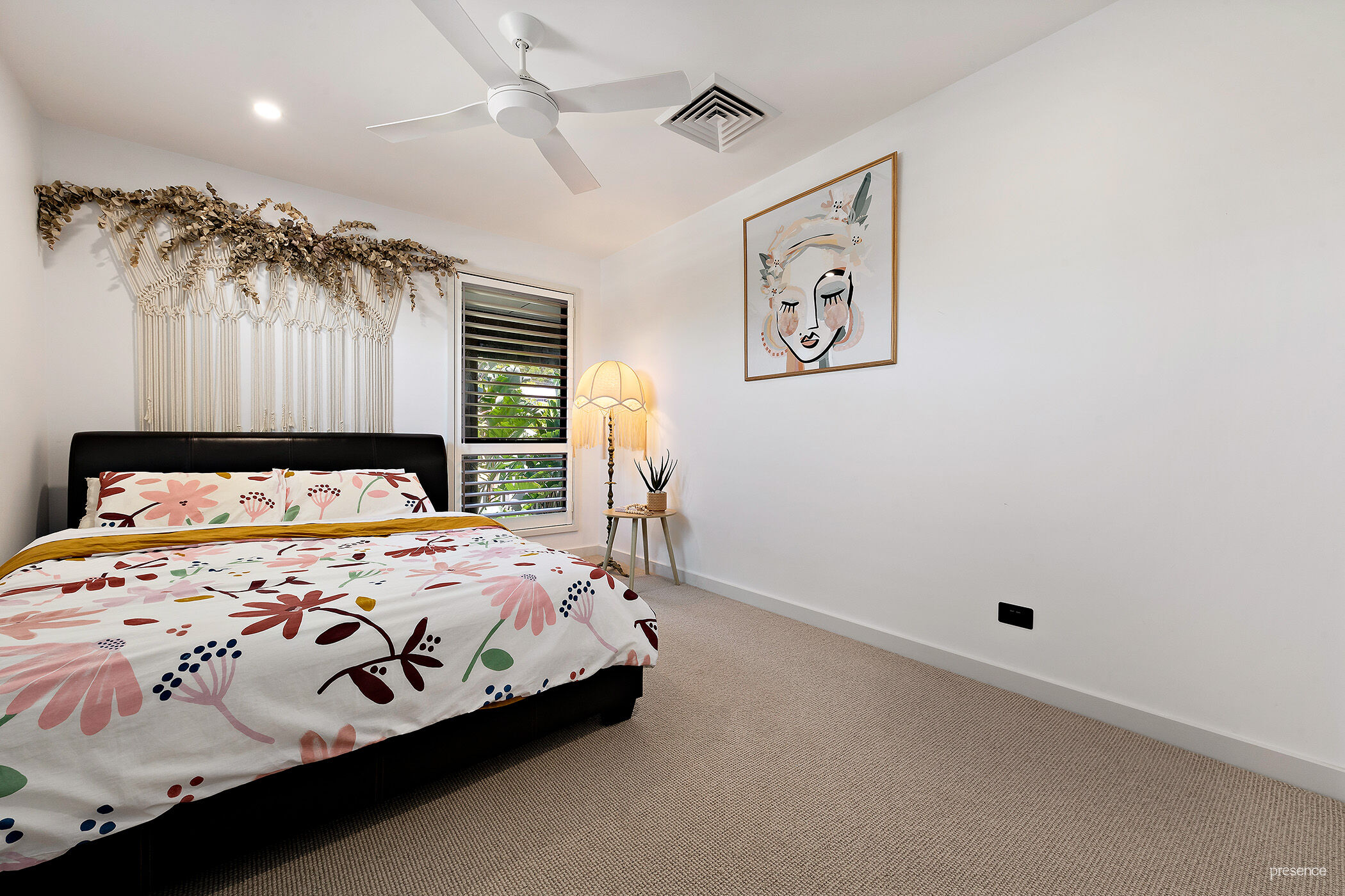 Greeted upon entry by a large open-plan living and kitchen space, the home immediately shows itself to be bright and welcoming. Bathed in natural light, the entire space fills with prevailing breezes through the large windows and doors that open to the north facing timber deck. A separate dining room lies just off the living space while a hallway feeds to two bedrooms, both with ceiling fans, one with built-in robe and the other with a walk-in robe, as well as the main bathroom with separate bath and walk-in shower. All effort has been made to continue the appreciation of natural light upstairs, which is showcased by gorgeous 100% New Zealand wool carpeting and two bedrooms, including the large master bedroom which features a beautifully designed ensuite and walk-in wardrobe. At the rear of the house is a second living area which impresses with its open nature gifted by the stunning window-wall and adjacent large glass sliding door that opens to the covered Merbau timber deck. As an entertainment area, the rear of this house has been magnificently imagined, offering plentiful space for large get-togethers in any weather, as well as a heated inground pool with resort-style decking, full coverage lighting and motorized screens. Also at the rear of the property is a separate two-car garage that could be converted into an office, gym or granny flat (STCA). The entire property presents as thoughtfully landscaped with a tropical feel that will not demand high maintenance.