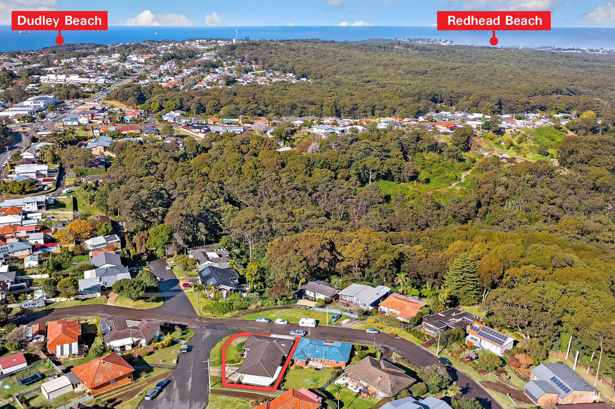Beautifully landscaped gardens embrace this immaculate three-bedroom family home elevated on a large corner block. Set in a quiet cul-de-sac this residence presents spacious indoor and outdoor living areas highlighted by a large front deck from which to enjoy the bellbird song along with spectacular natural beauty and views across to Redhead Beach.