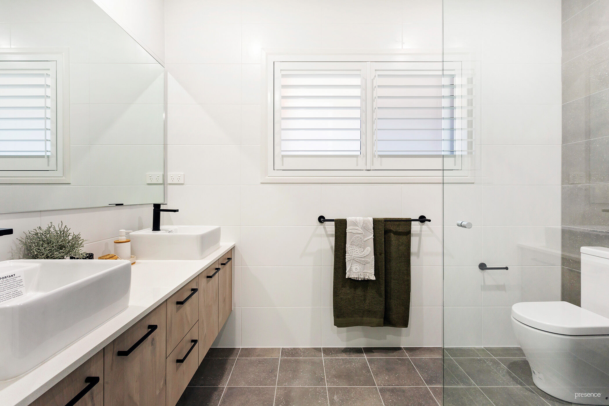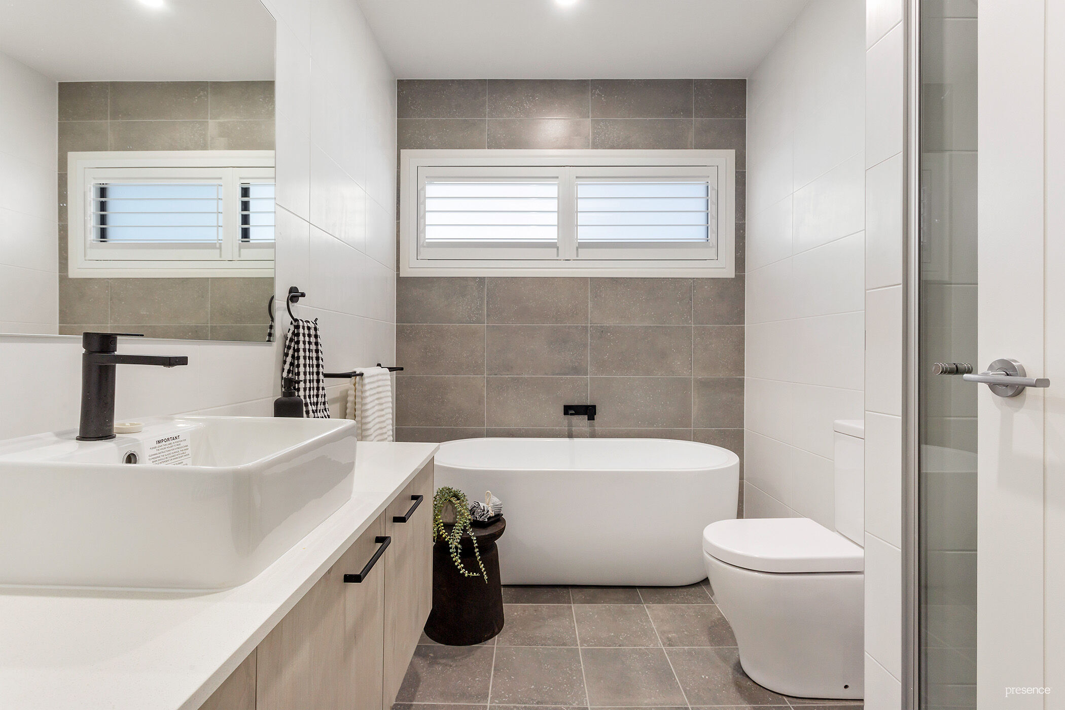 – Luxe family bathroom with freestanding bath, shower and black tapware, powder room