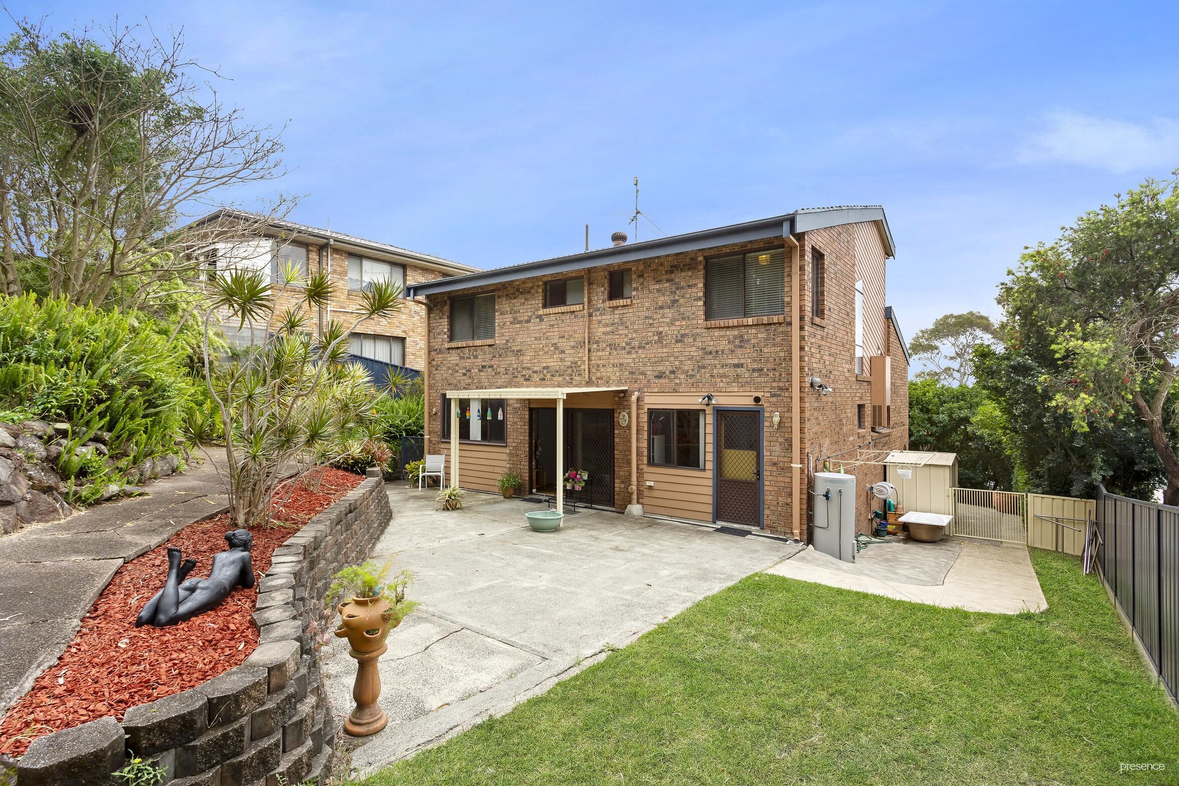 • Paved alfresco area, overlooking the grassy, tiered backyard – fully fenced for kids and pets to play.