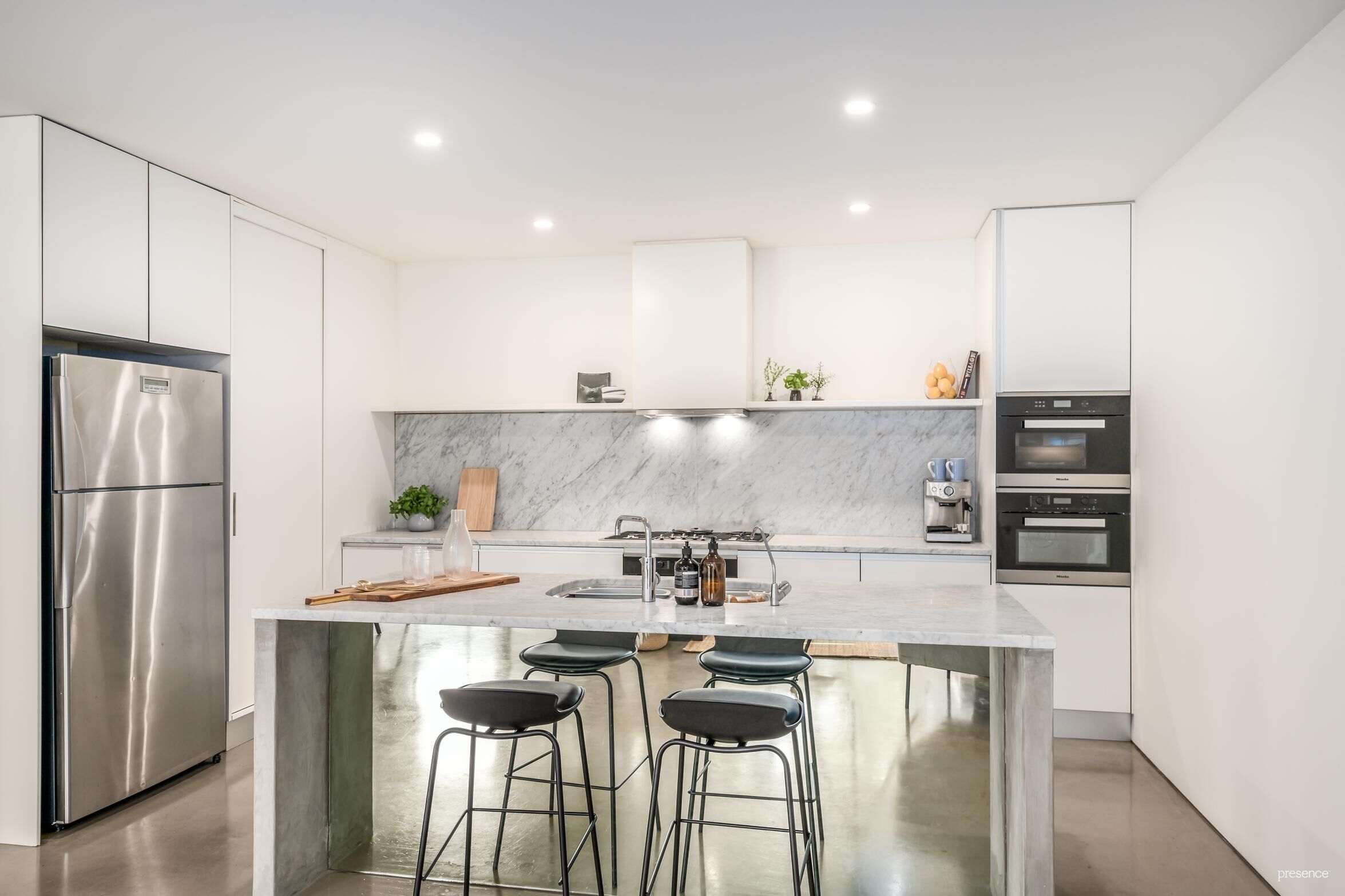Inside, the home’s spacious open plan living and dining expanse is highlighted by high shadow line ceilings, polished concrete floors and simple, neutral décor, with glass doors opening to a private courtyard and rear access into the oversized double garage. The hero piece of this area is undoubtedly the stunning island kitchen impressively appointed with marble benchtops and a suite of brand-new Miele cooking appliances.