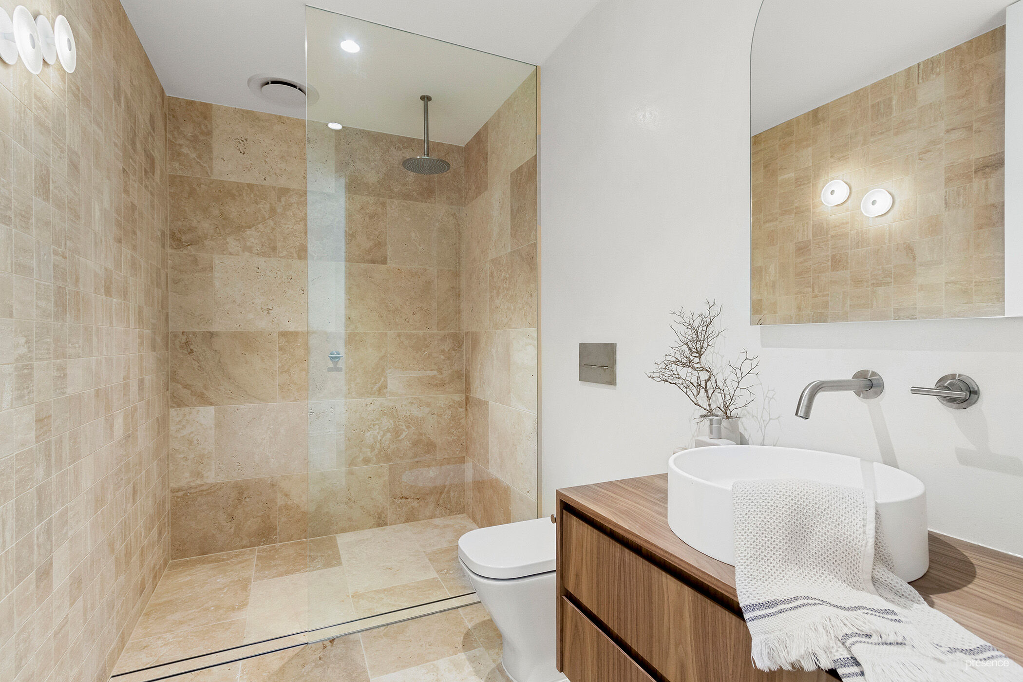 Two further bathrooms with frameless glass showers, in-wall toilets, Venetian plaster finishes