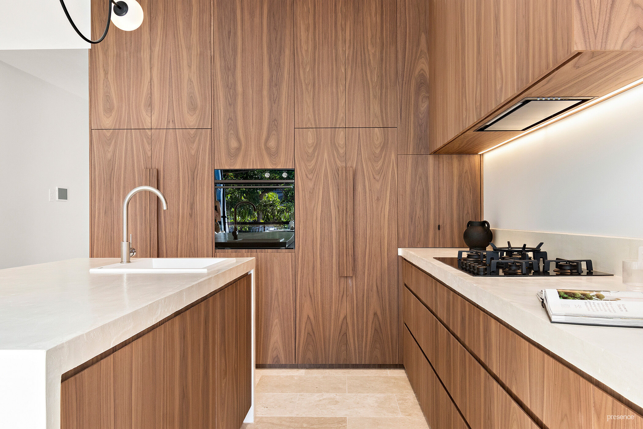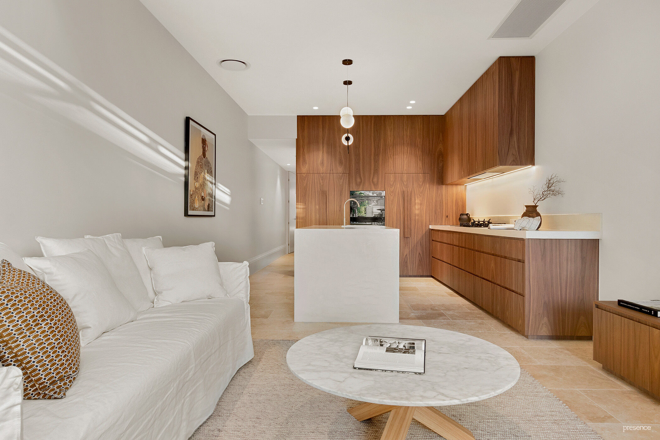 Re-invented as an intimate, refined and finely crafted residence, the home’s palette of materials plays an integral role in defining its sophistication. Bespoke finishes in American walnut timber and Venetian plaster are complemented by Travertine wall and floor tiles, custom recessed drapes, high-end kitchen appliances, and gun-metal tapware delivering superior quality and just the right amount of luxury.