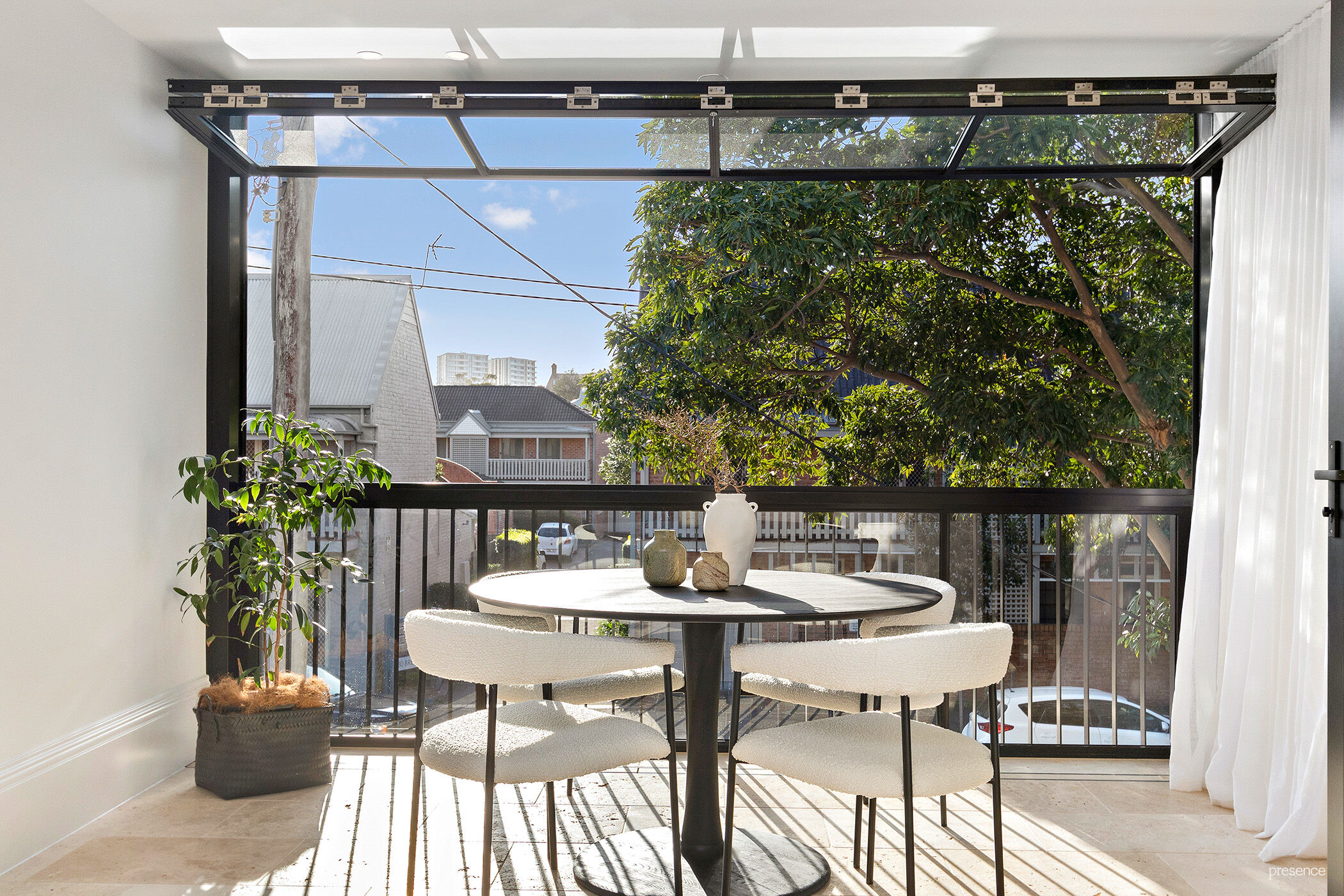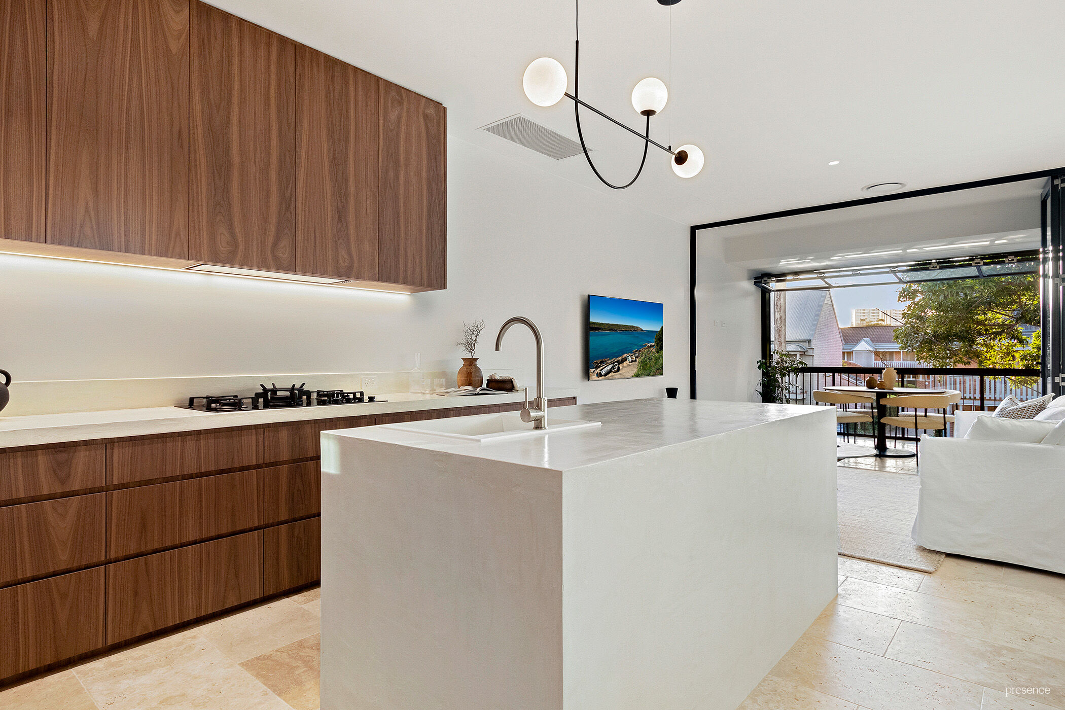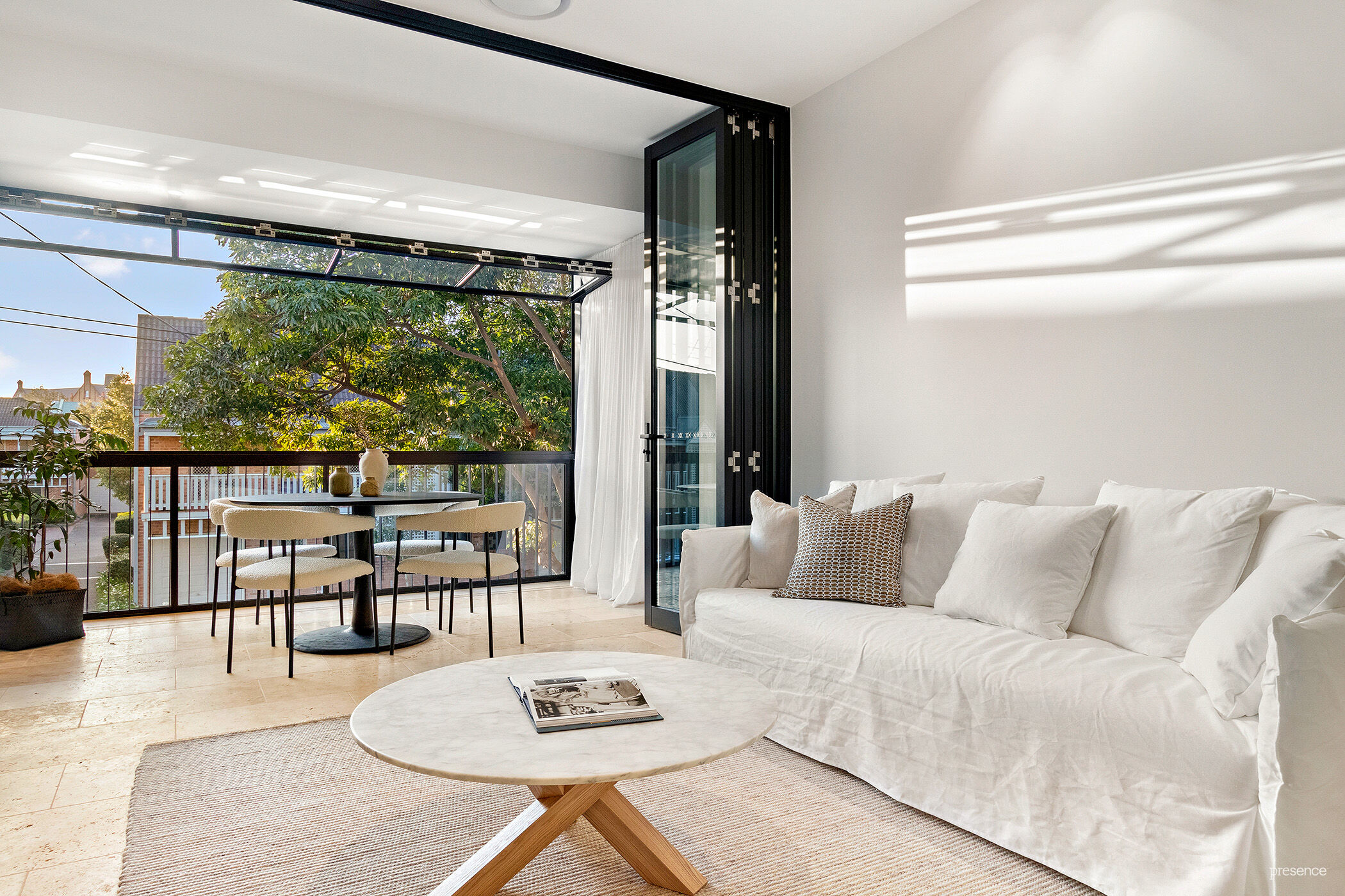 Open plan living area with bi-fold doors acting as an operable screen to enclosed balcony with bi-fold windows