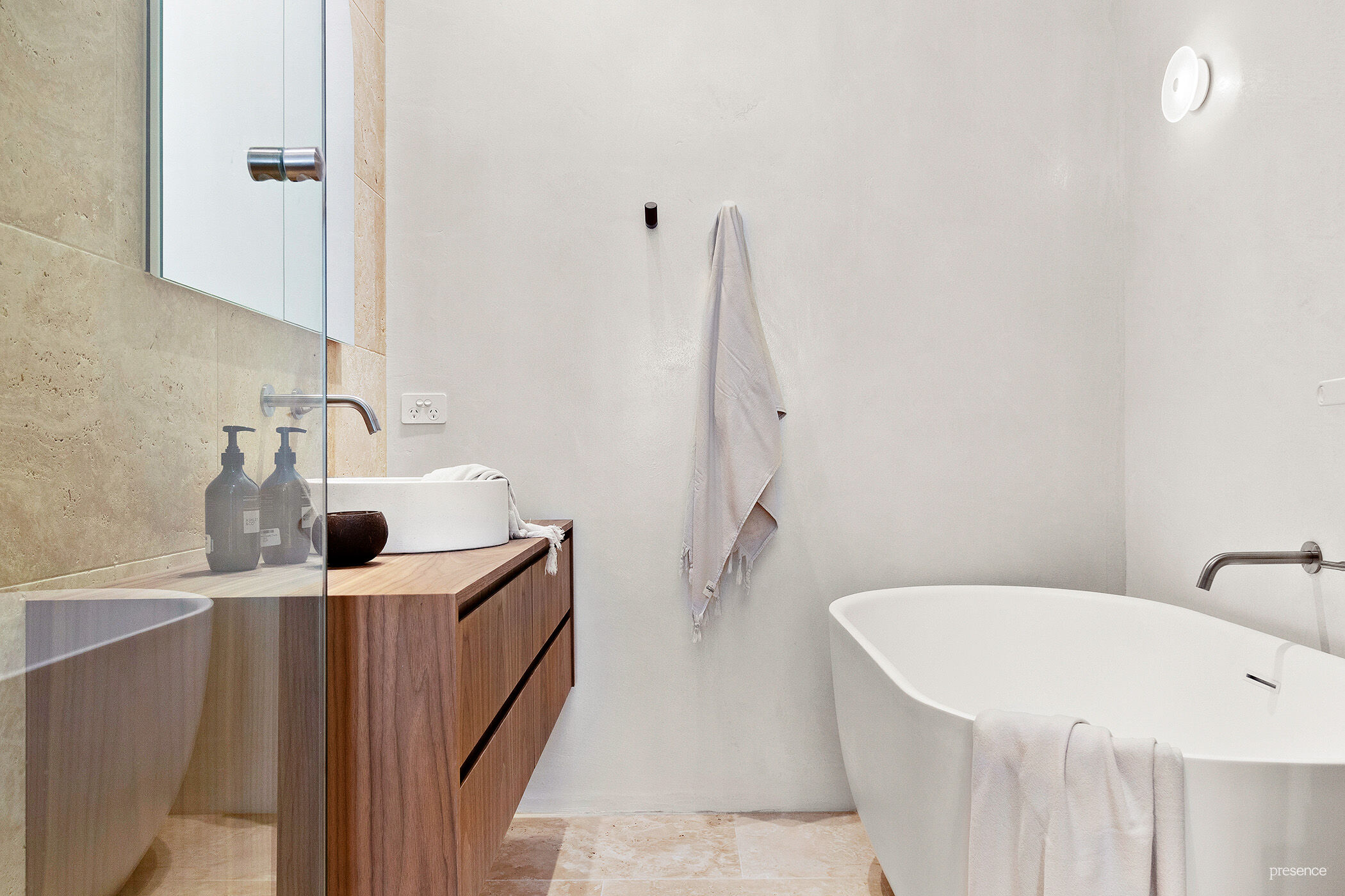 King-size master bedroom with his and her’s walk-in robes and full-size ensuite with freestanding bath, large shower, concrete vanity, face-level storage