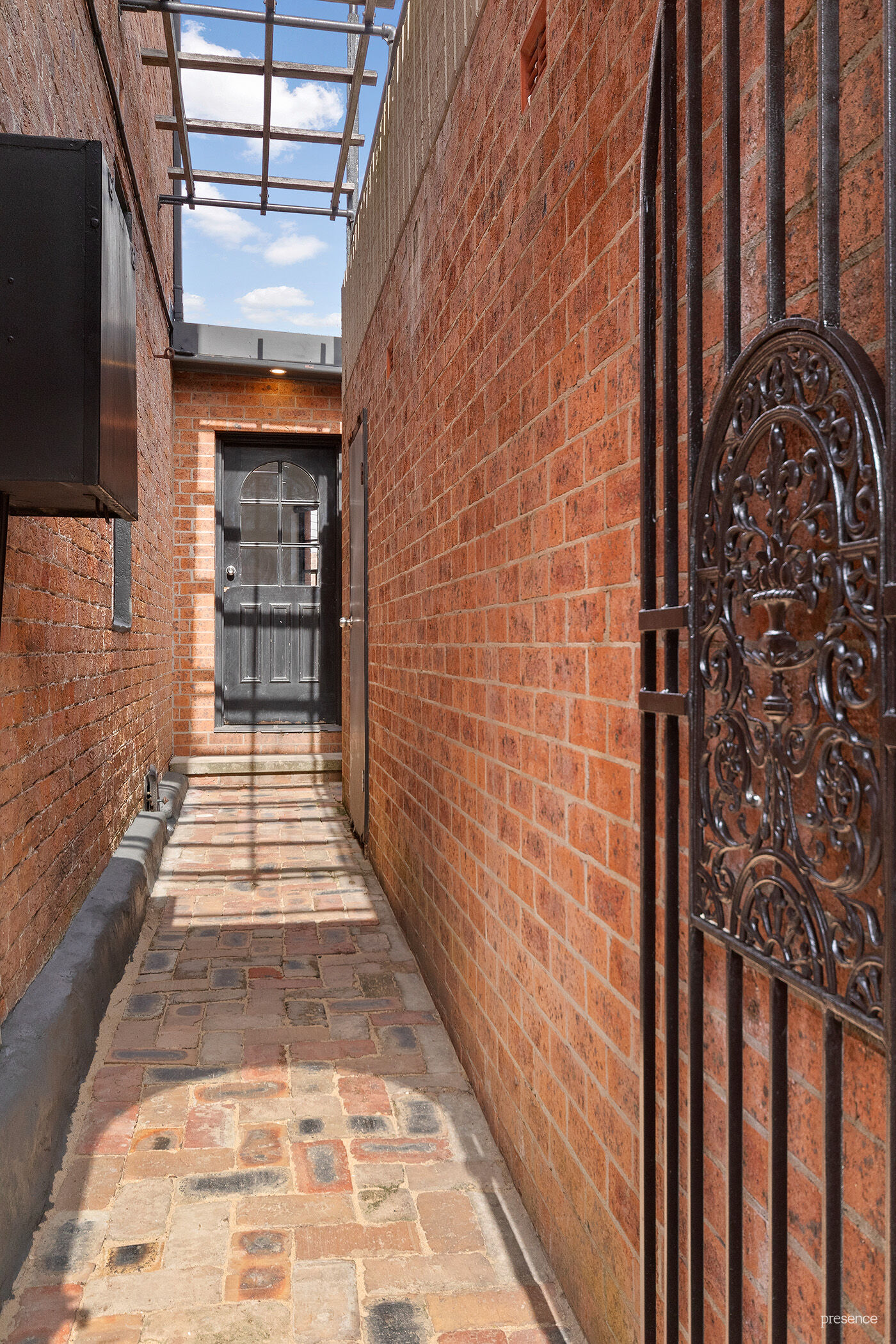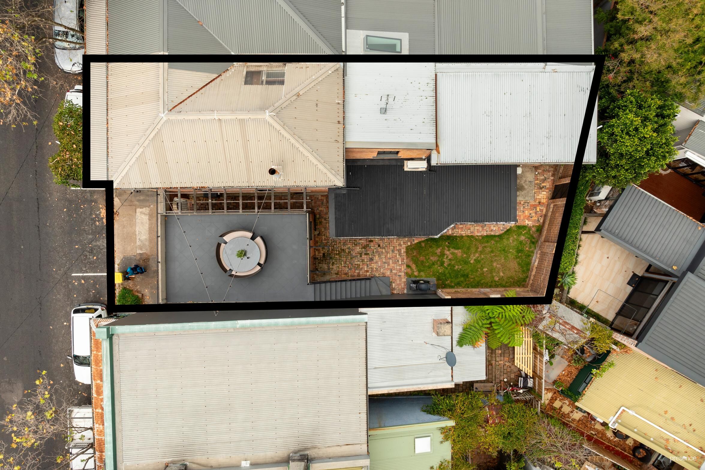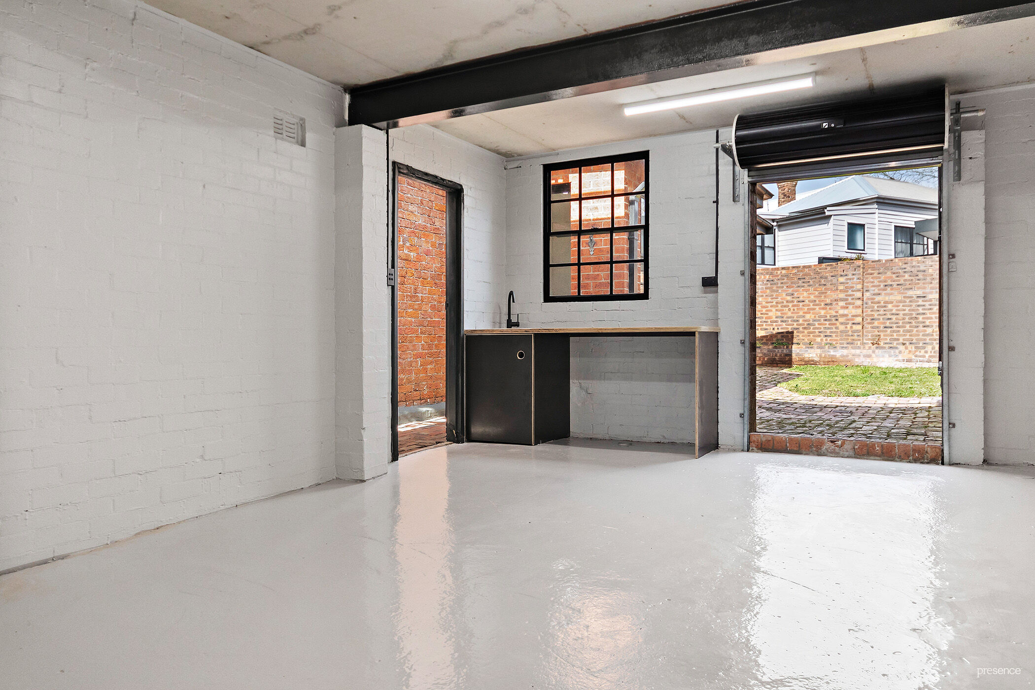 Fenced courtyard garden accesses single garage with rooftop entertaining space