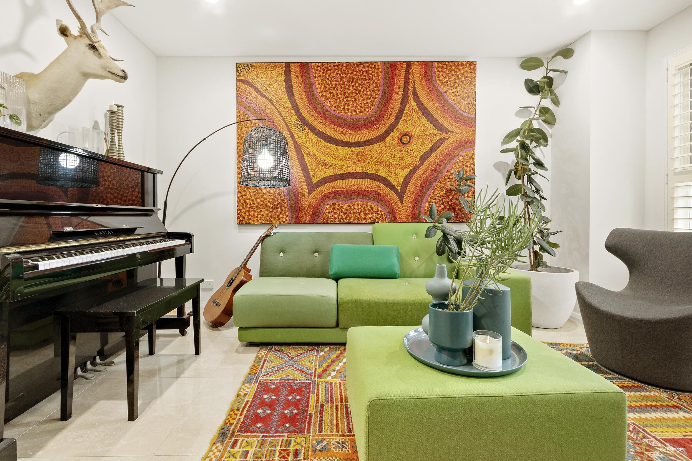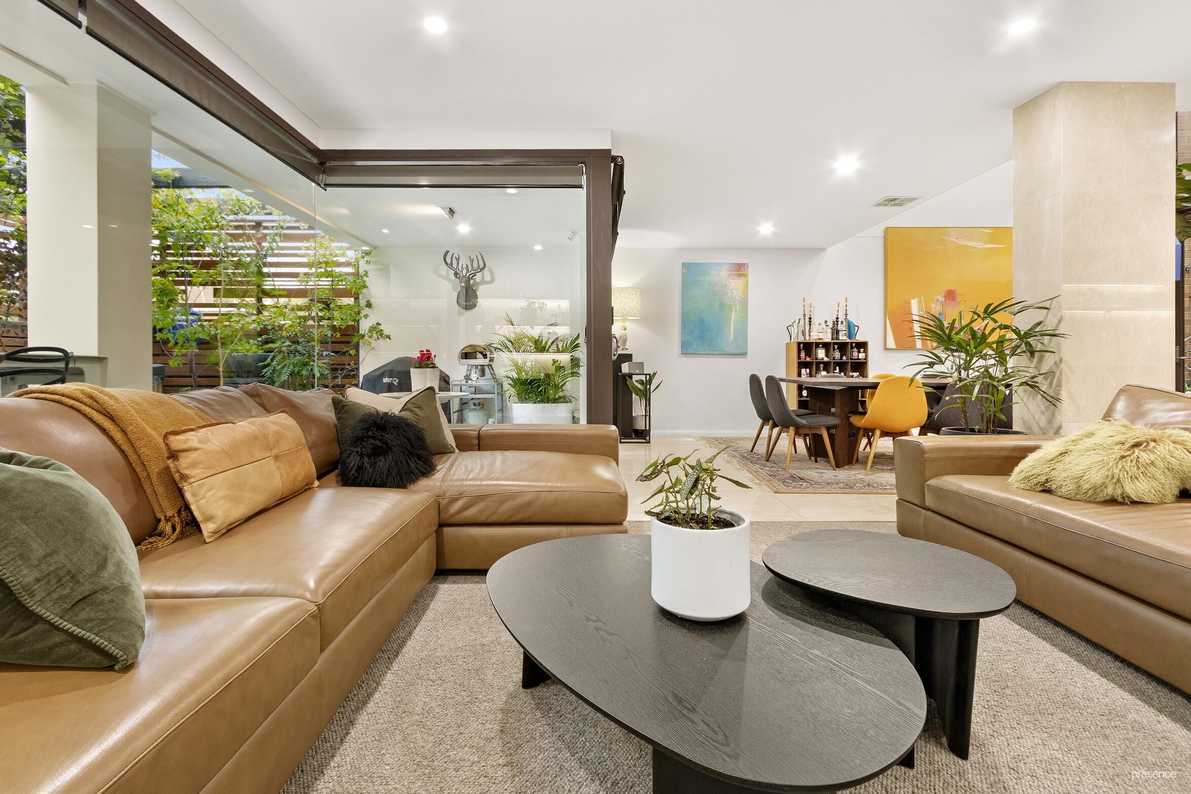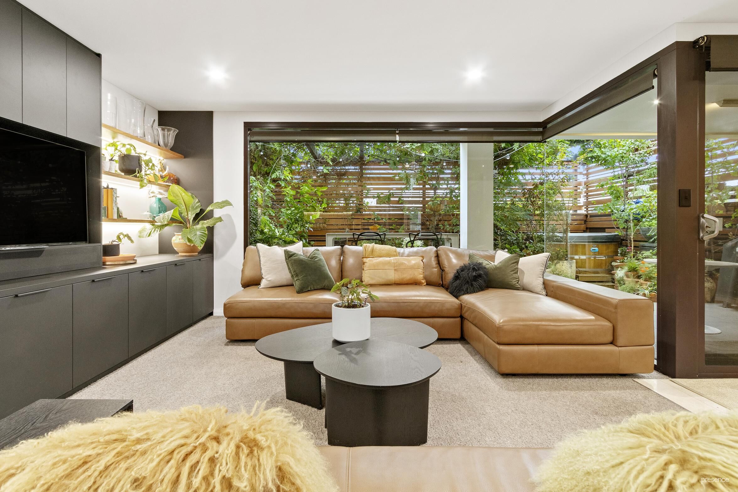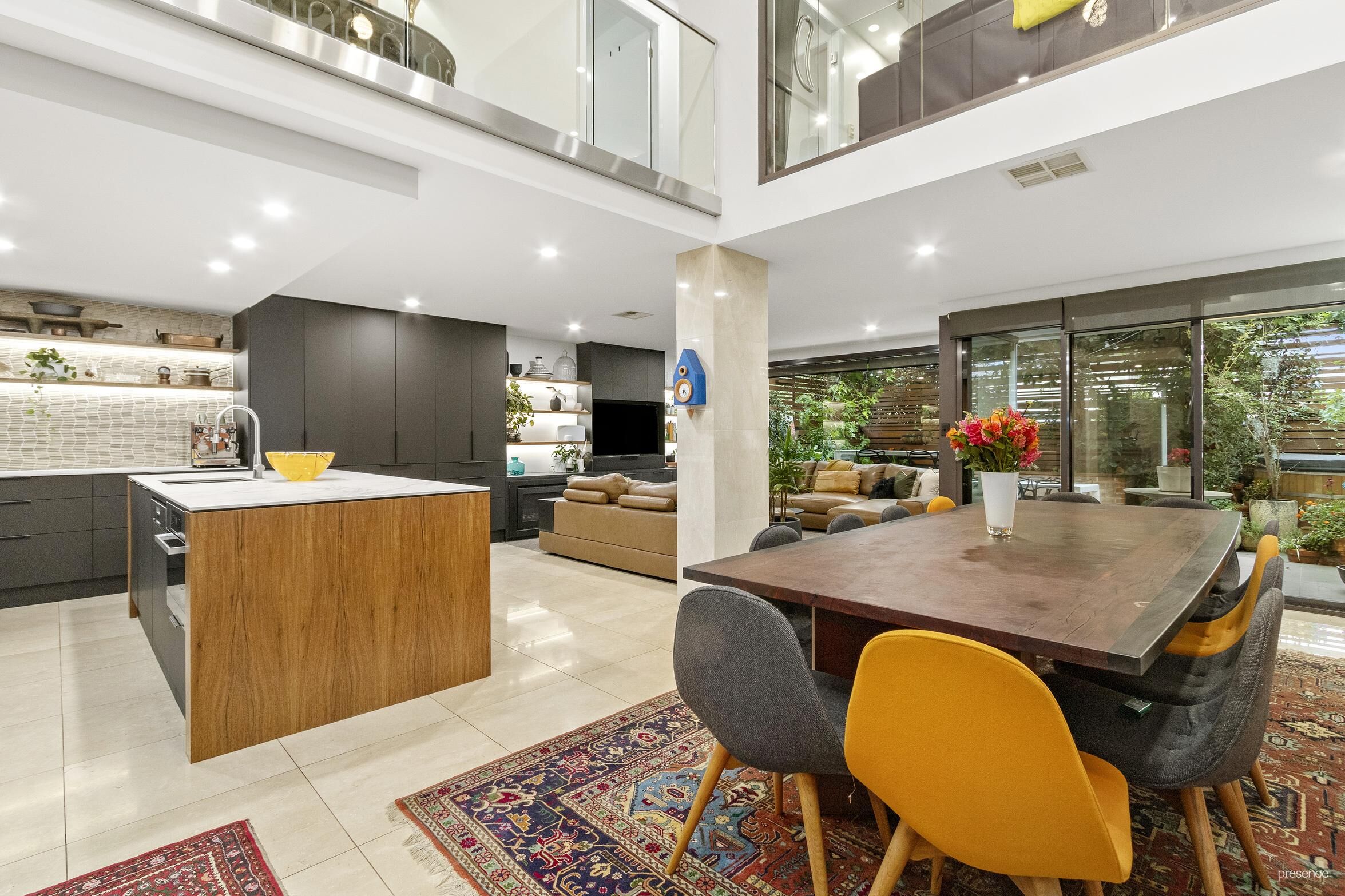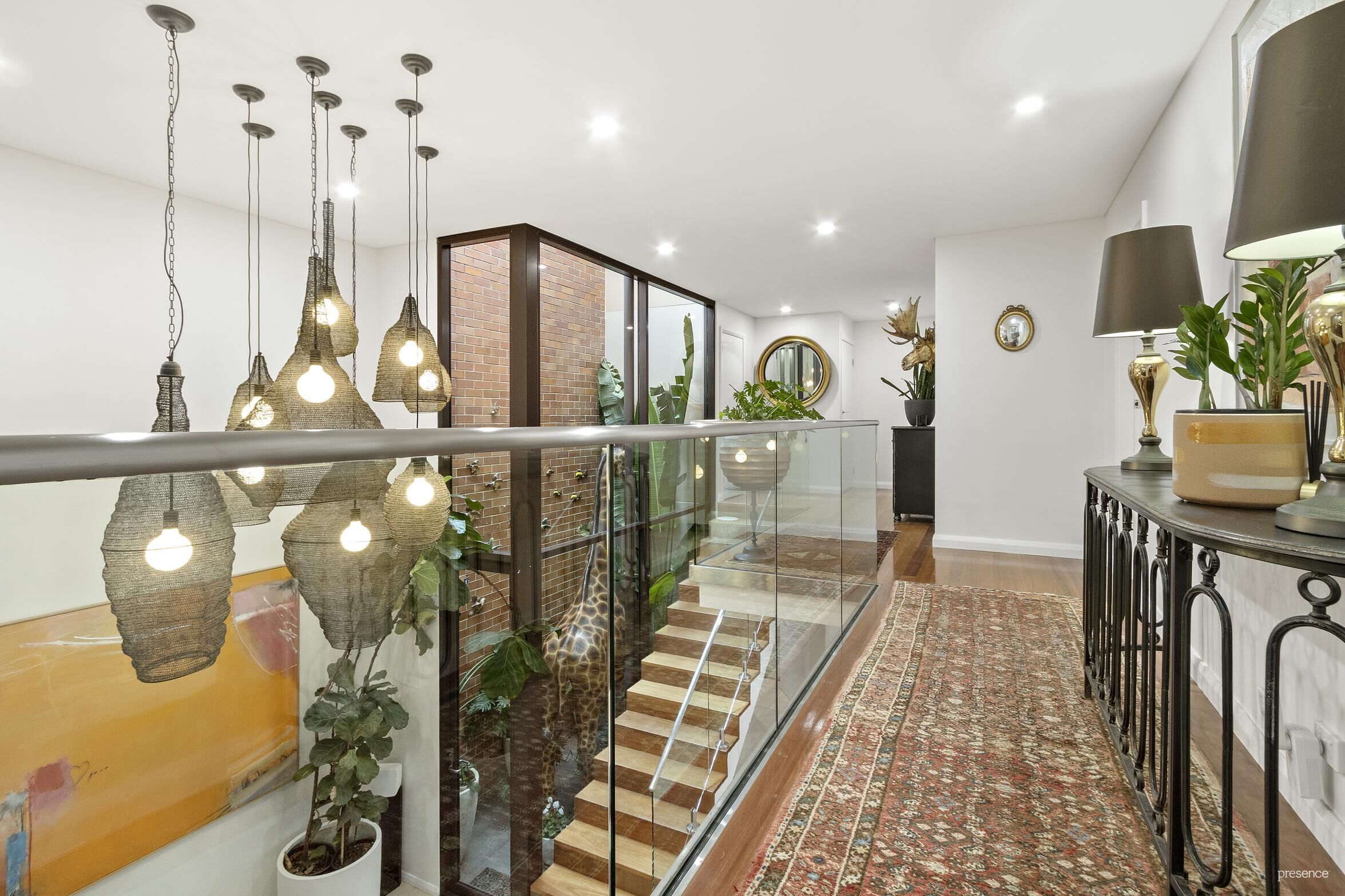 Natural light is a defining feature, streaming through a spectacular internal glass-framed courtyard that spans the ground and first levels. It’s the perfect place for an indoor jungle or a striking art installation—like the 15ft giraffe the current owner affectionately calls Colonel Giraffee (he’s not for sale, but he does make quite the impression!). At the rear, sliding doors open to a lush private garden, where a stainless steel plunge pool awaits creating your own tranquil oasis, perfect for alfresco entertaining or quiet relaxation.