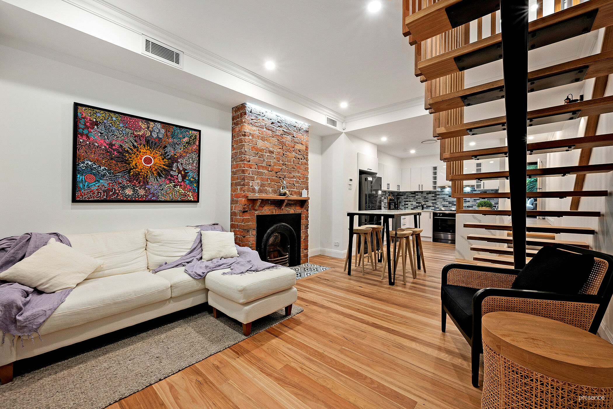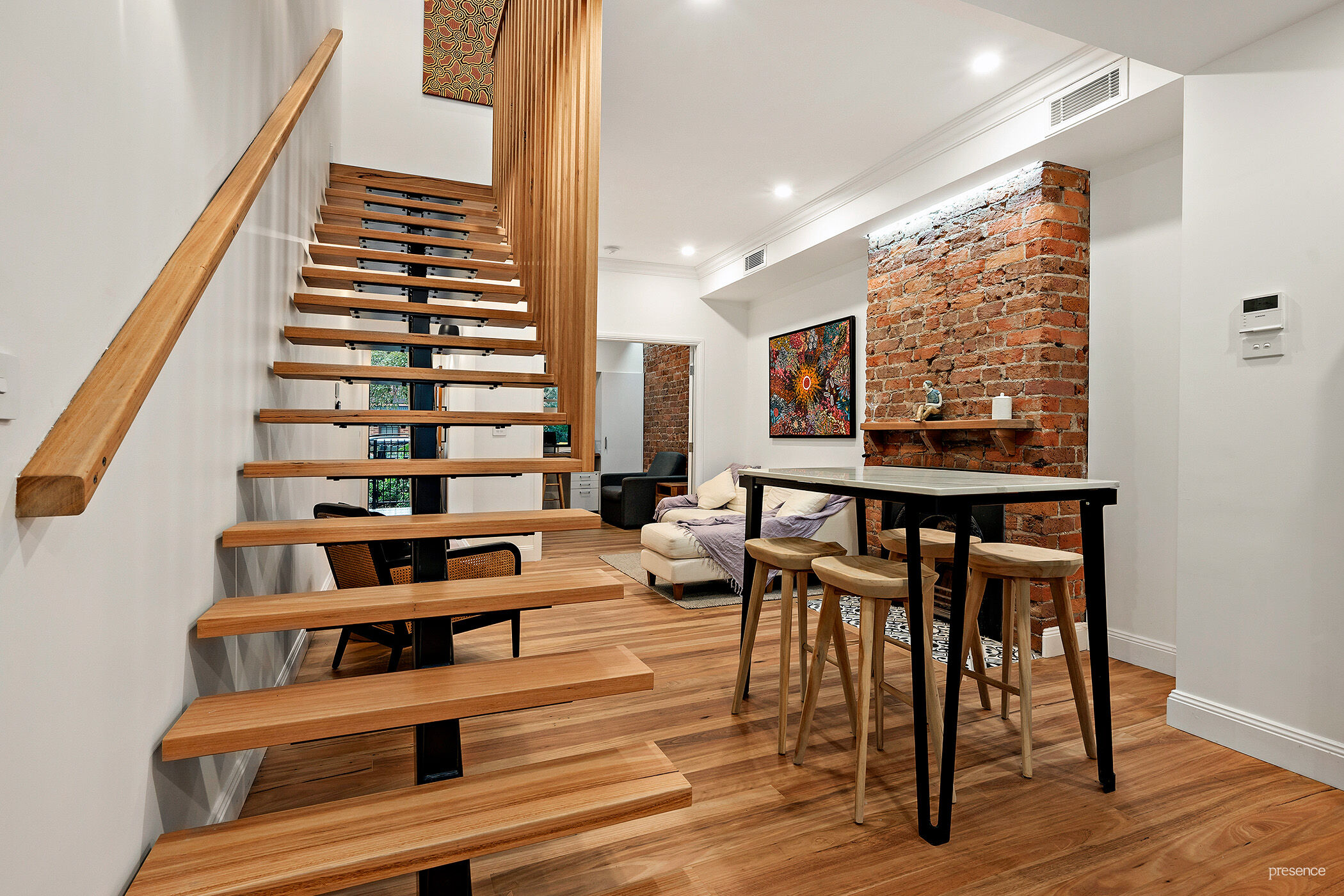 Open plan living with updated timber floors, striking staircase, exposed brick feature walls