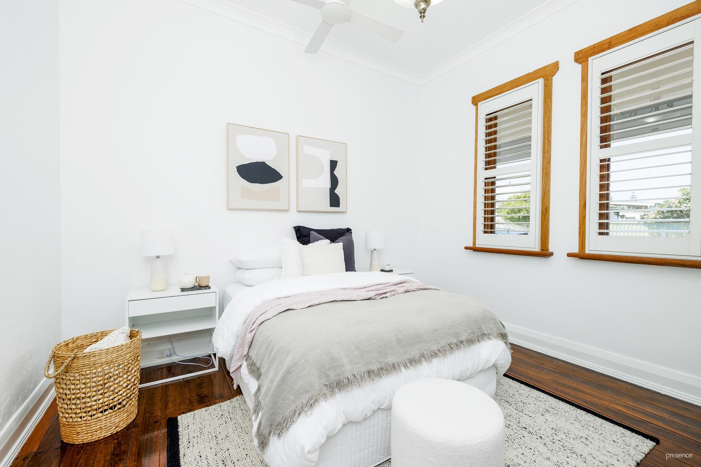 Step up to the inviting front porch – the perfect sunny perch for your morning coffee – and enter a welcoming hallway adorned with rich, polished timber floors that exude warmth and character. At the front of the home, two generously sized bedrooms offer comfort and style, each featuring built-in robes and chic plantation shutters that softly filter the natural light.