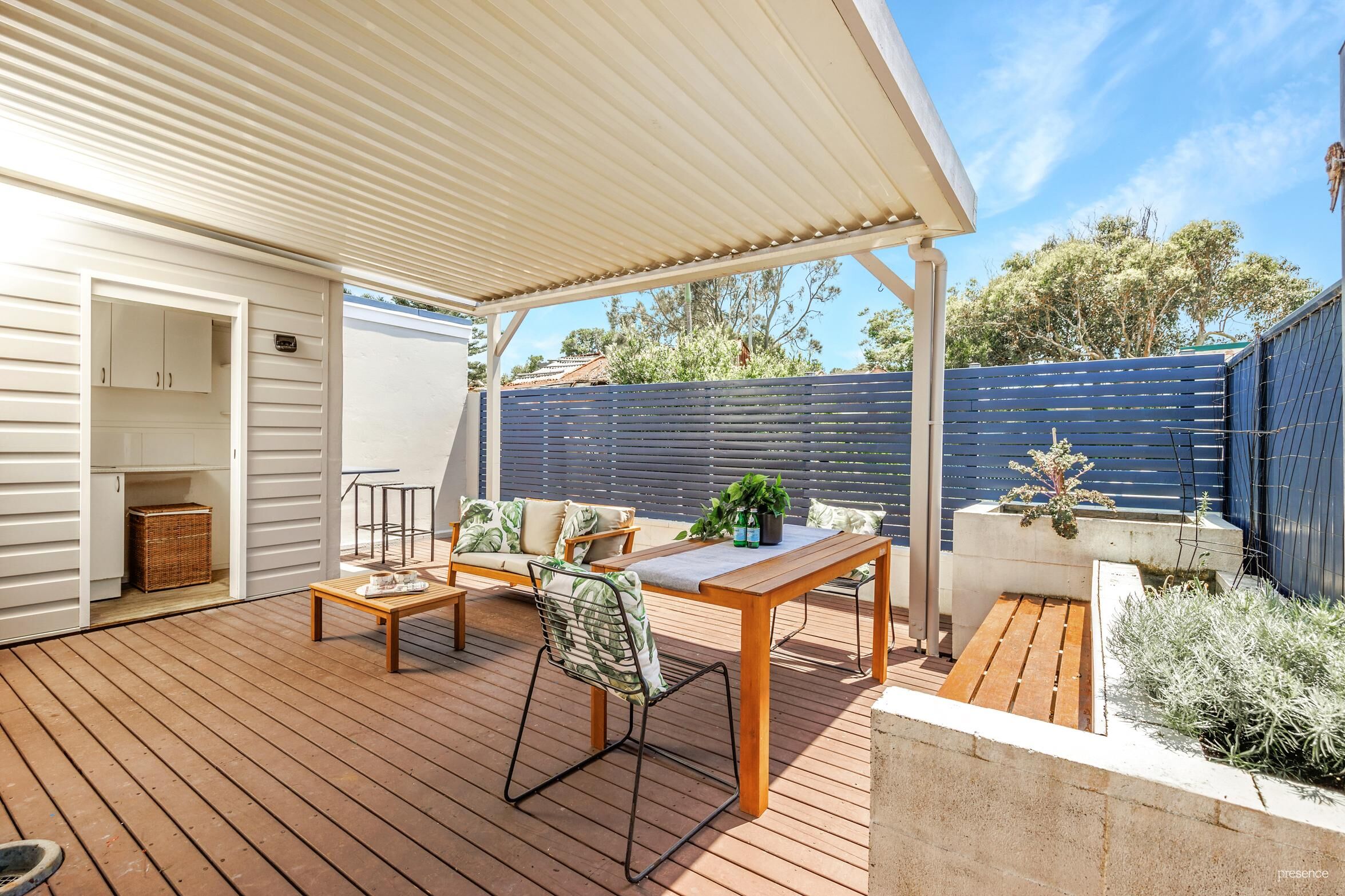 – Expansive entertainer’s deck with louvred roof, privacy screening, garden beds and timber seating.