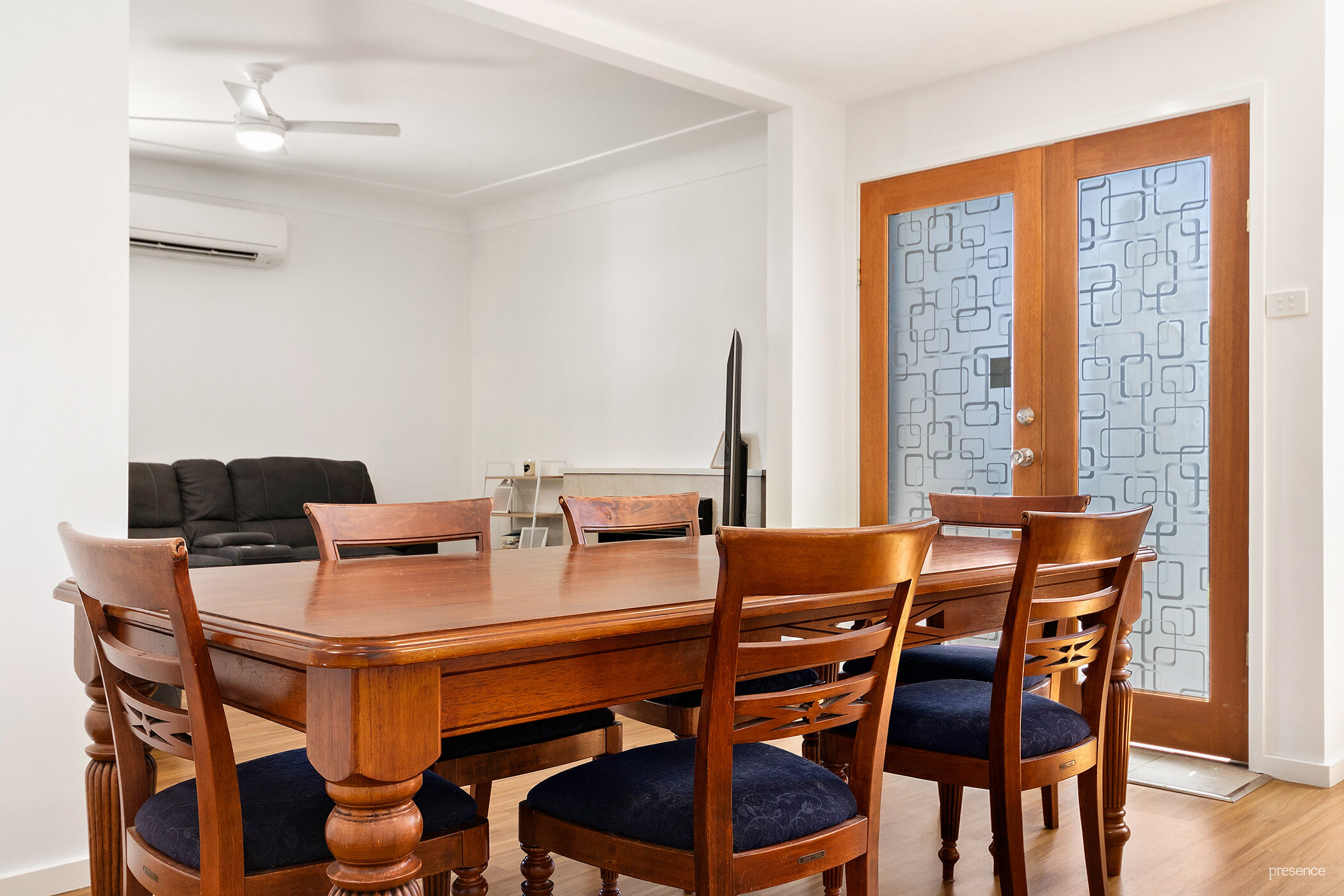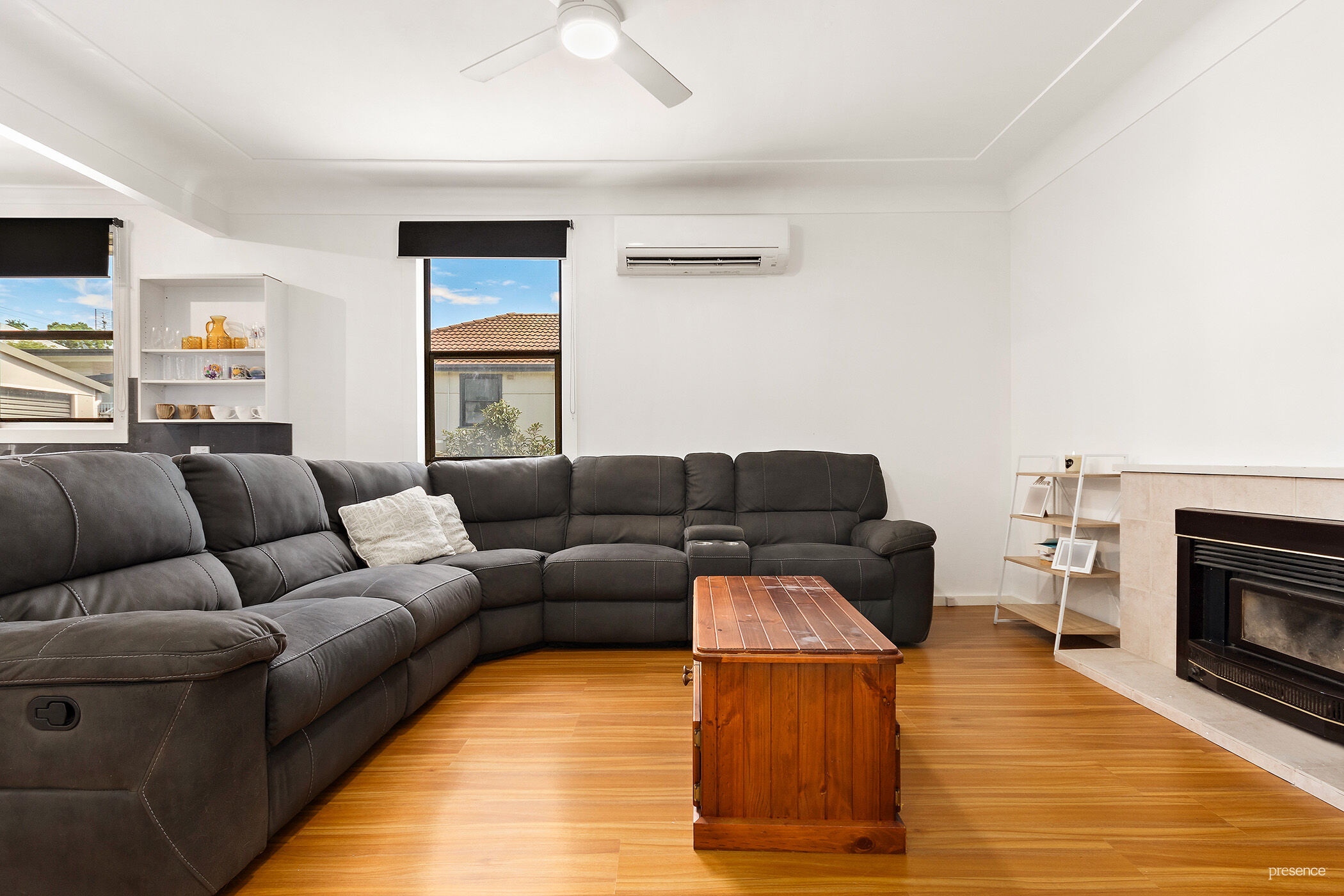 Step inside through the inviting double entry doors to discover a well-presented, freshly painted interior. The open-plan lounge and dining room create the perfect space for family relaxation, complete with a combustion fireplace and air-conditioning for year-round comfort. Beautiful floating timber floorboards add a touch of elegance underfoot.