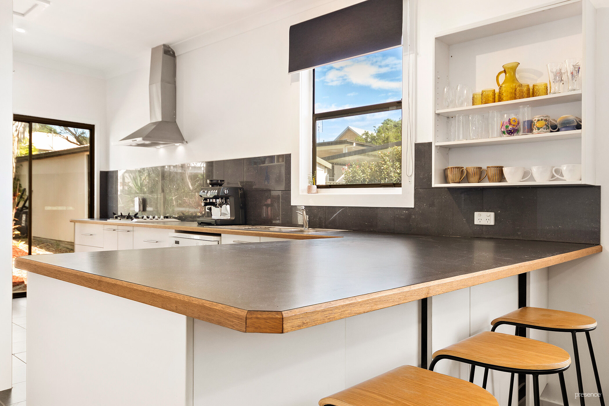 The modernized kitchen is positioned towards the back of the home and boasts gas cooking, a rangehood, dishwasher, generous storage, and bench space, all complemented by tiled flooring. It’s from here you access the private, entertainer’s backyard from the kitchen.