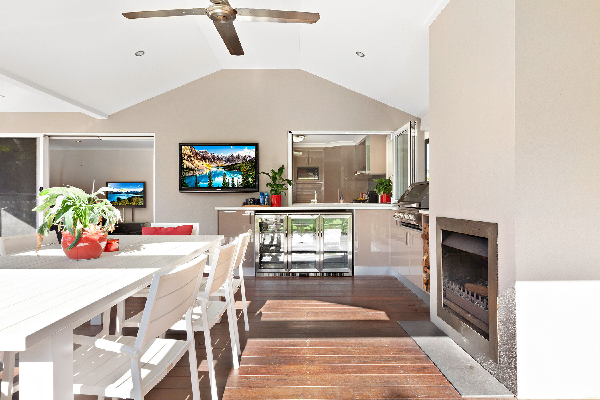 – Caesarstone kitchen with gas cooktop, integrated dishwasher and servery window to deck