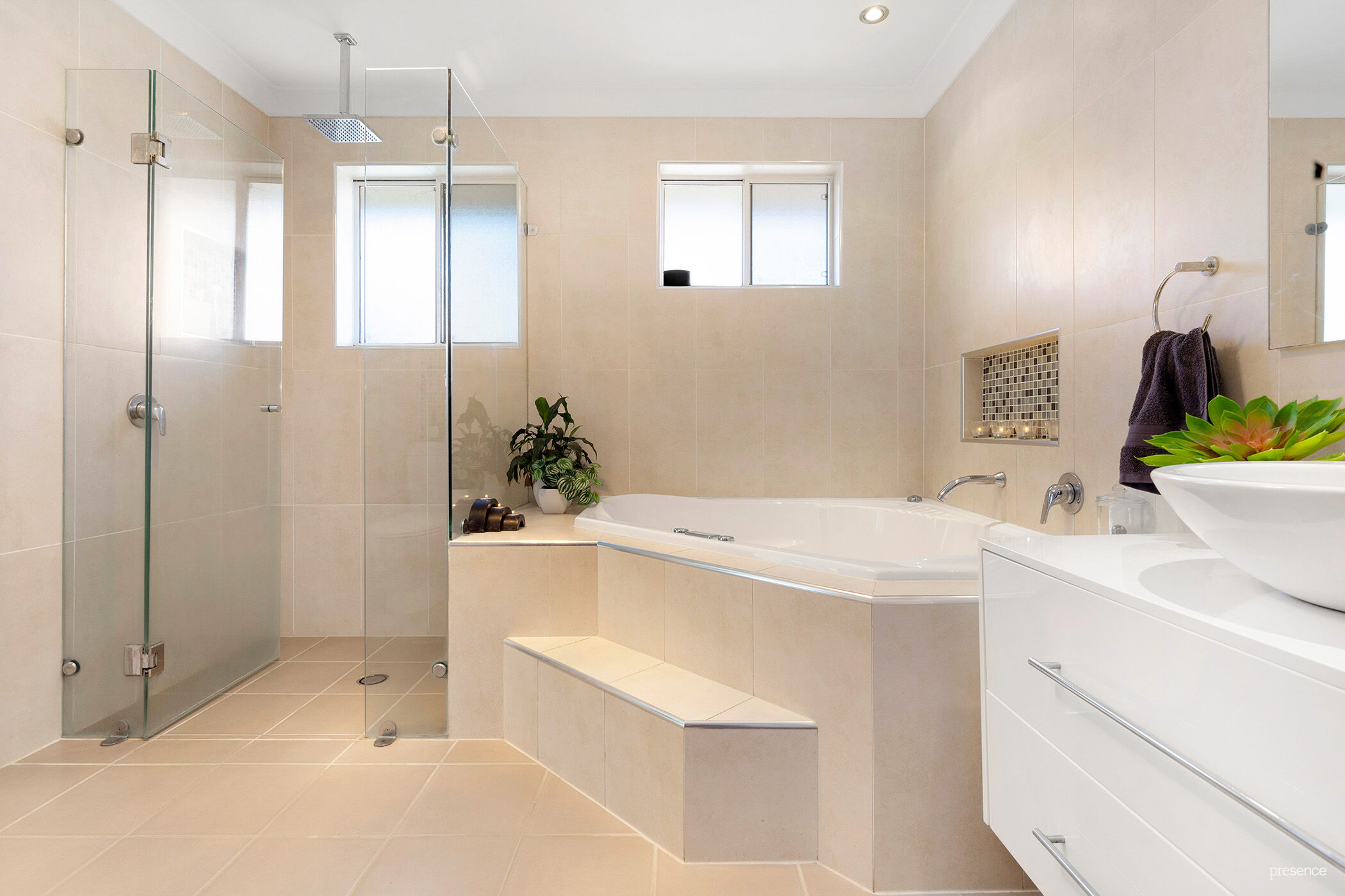 – Full-size spa bathroom with heated towel rail and ensuite access from master bedroom